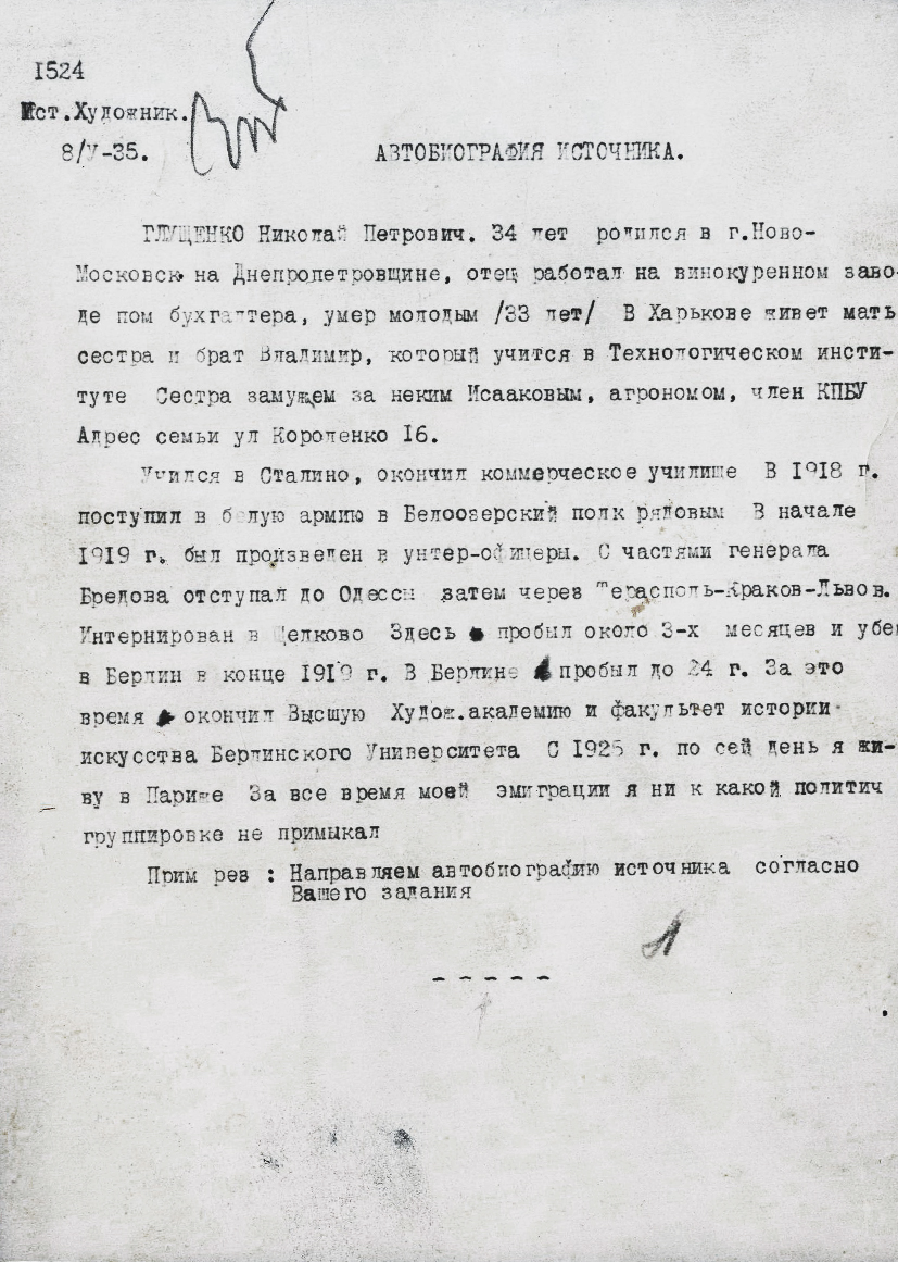 After the unsuccessful attempt in Prague, they decided to meet with the artist in Paris. According to archival documents, the meeting was conducted by the same “Stepan”. And here it became clear - it is unknown only why at this stage - that M. Hlushchenko was a Soviet citizen, who was granted citizenship in November 1925, and that he was going to leave for the USSR for permanent residence in the near future. This raised some doubts about the feasibility of involving him in work for the Soviet Foreign Intelligence.