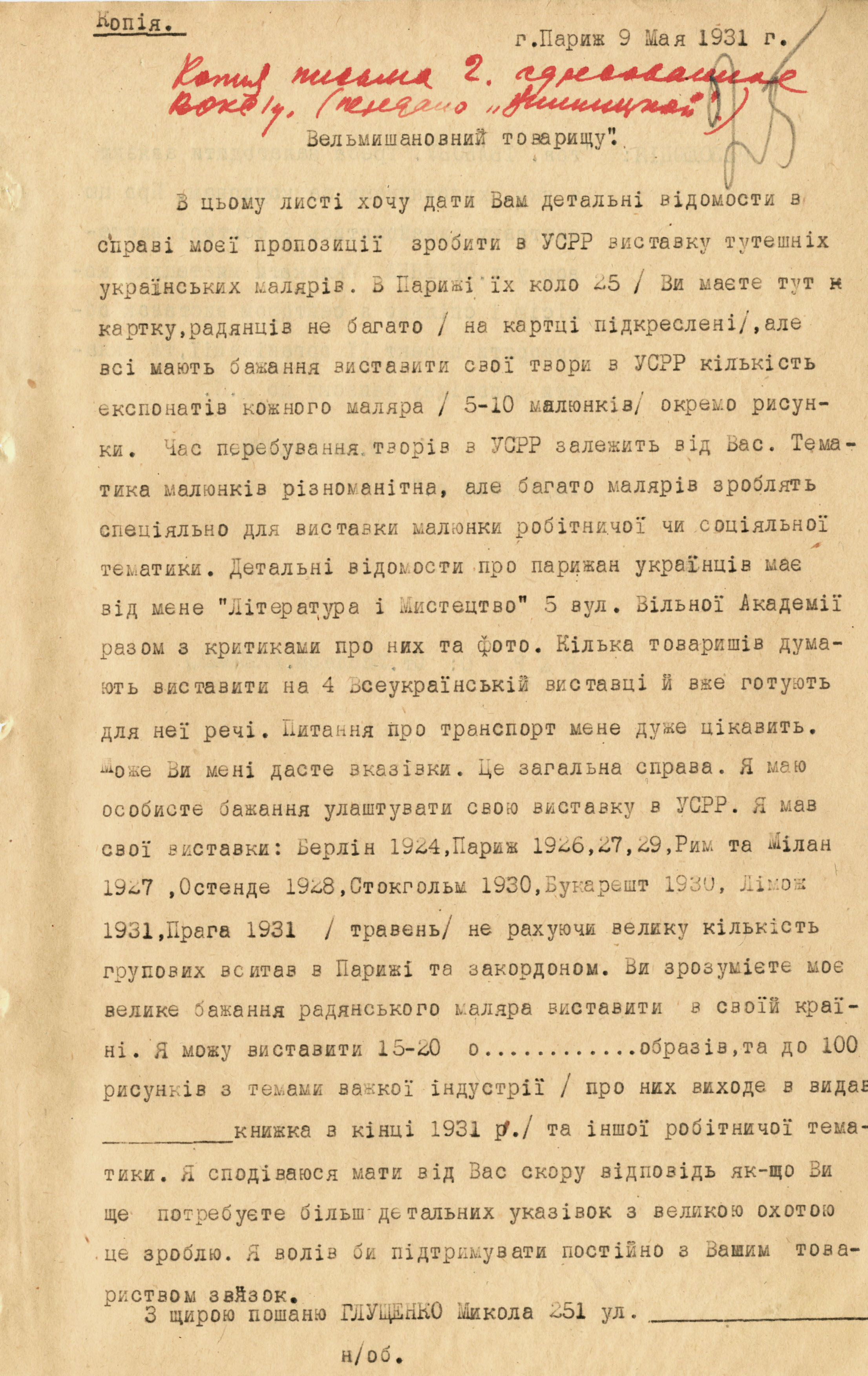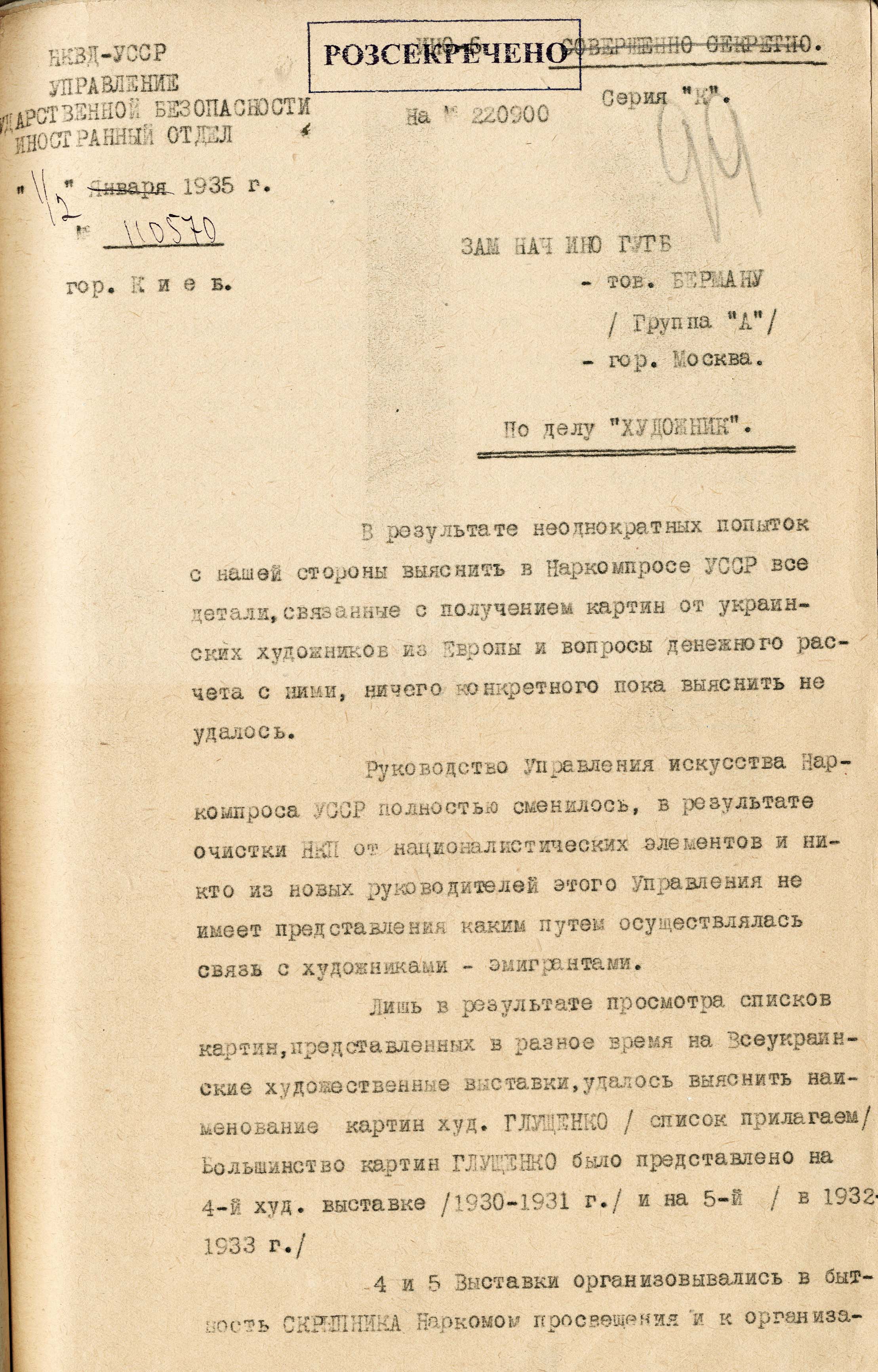 The circumstances of M. Hlushchenko's involvement in the work of the Soviet Foreign Intelligence, as evidenced by archival documents, were as follows. In January 1931, the artist wrote a letter to the All-Ukrainian Society for Cultural Relations with a proposal to organize in Kharkiv and Kyiv an art exhibition of paintings by Ukrainian emigrants living in Paris.