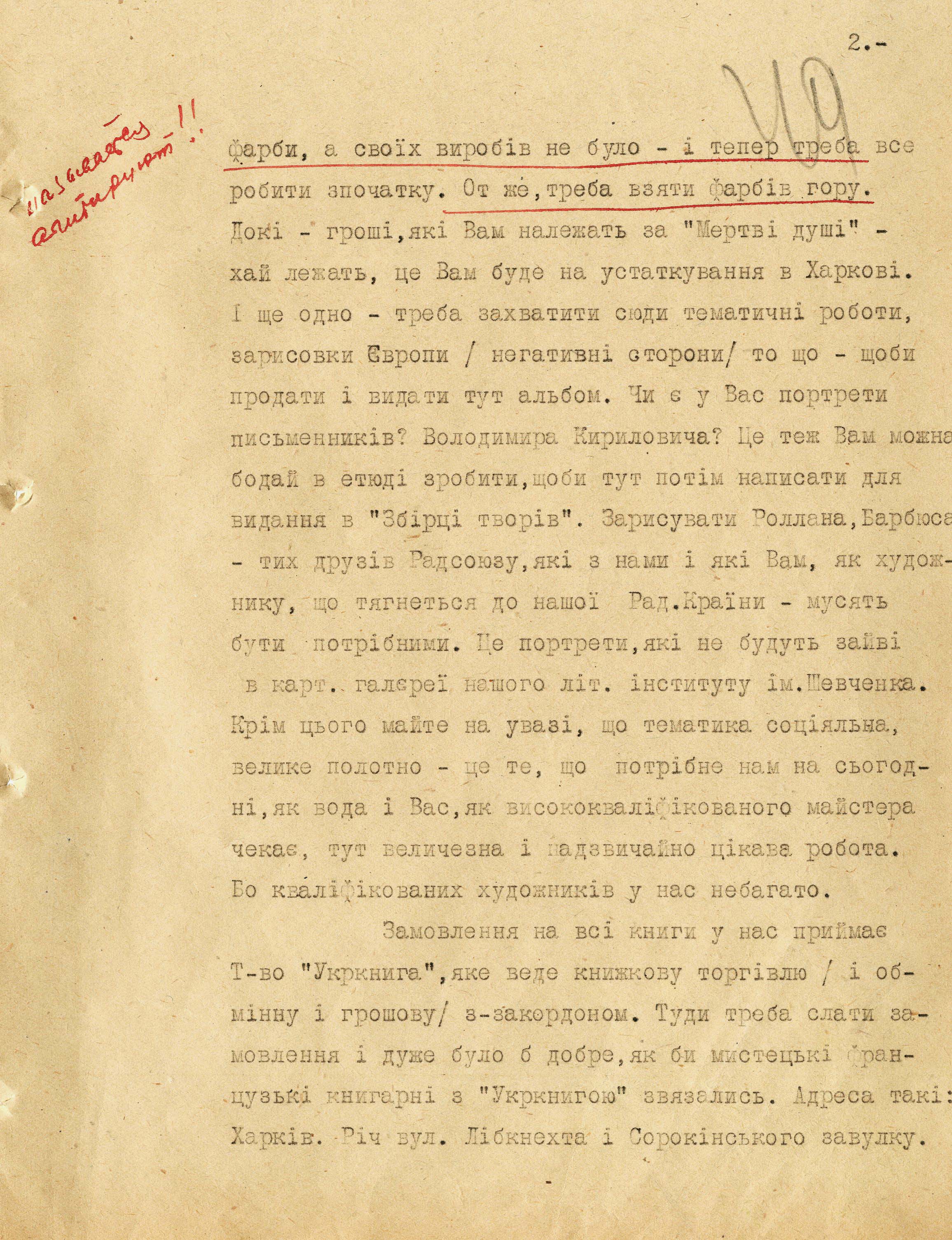 In his letters, M. Hlushchenko more than once asked his mother to visit state cultural institutions and publishing houses to find out about his paintings and receive money in case of their sale or a fee for a certain work. Sometimes it worked, and the fee was paid. Sometimes it involved lots of time and walking from one office to another. Thus, in a letter dated February 1, 1934, his mother wrote: “The “Mystetstvo” publishing house replied that they could not buy a painting of Barbusse and asked you to write them an instruction on where to send this painting… In addition, write to them about the painting of Romain Rolland. Should they pass it to the Shevchenko Institute because the Institute asks for it because allegedly through the People's Commissariat of Education they bought this picture from you, but the “Mystetstvo” doesn't know about this. If they did not buy it from you, then tell them what to do with it… ”(BSA of the SZR of Ukraine. - F. 1. - Case 1942. – P. 73–74). In another letter to M. Hlushchenko, Mykola Lebed, an employee of the People's Commissariat of Education, wrote: “I will take Barbusse, if it does not sell, I will transfer it to the Picture gallery”.