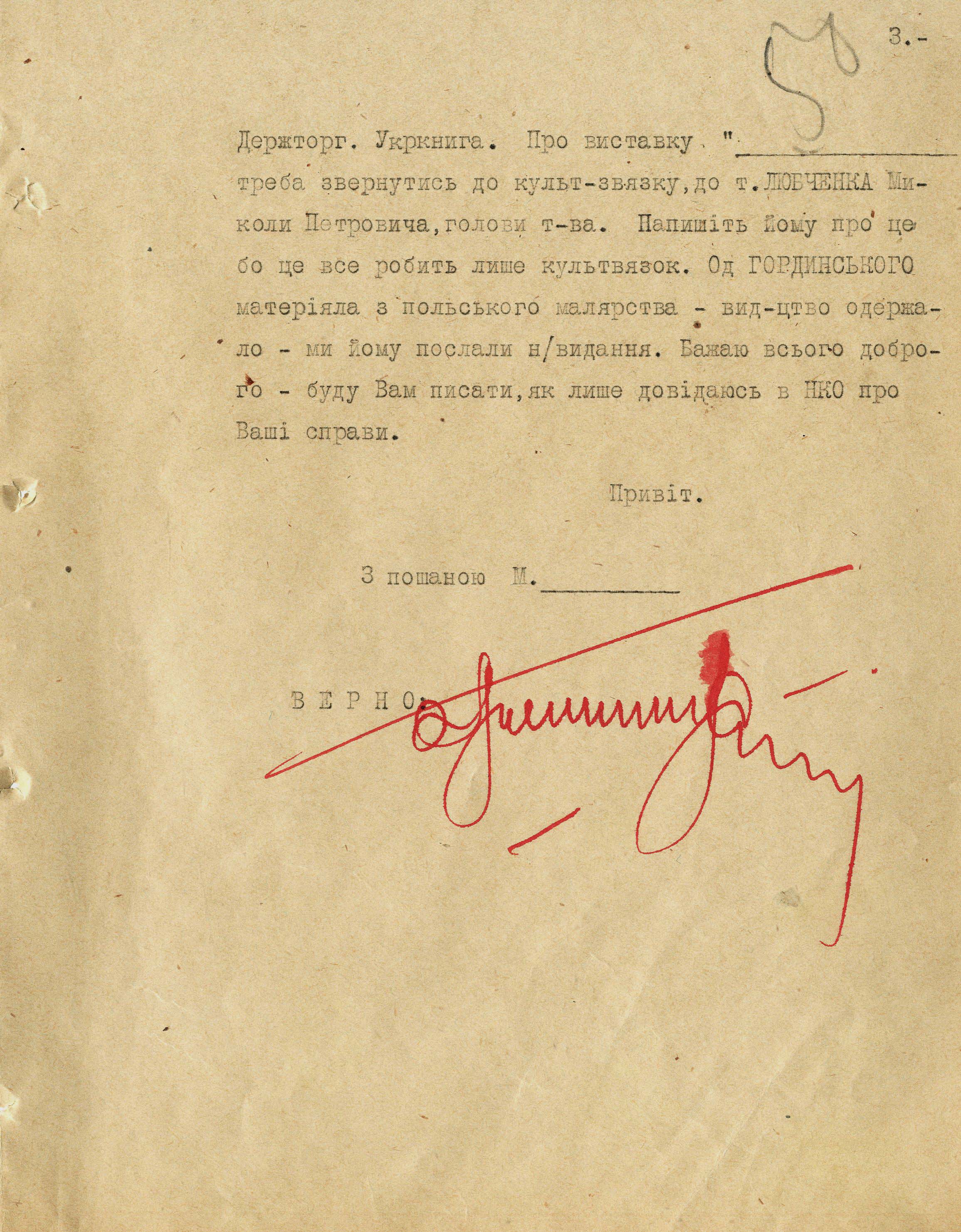 The answer was that it was very difficult to clarify, because the leadership of the Art Department of the People's Commissariat of Education had changed completely “as a result of cleansing from nationalist elements and none of the new chiefs of this Office has any idea how to contact immigrant artists”. M. Lebed, an employee of the agency, with whom the artist corresponded, was also arrested and sentenced to many years in prison. When M. Hlushchenko learnt about this in Paris, he tried to persuade an employee of the Soviet station that M. Lebed could not be an anti-Soviet element. He showed about thirty letters from him.