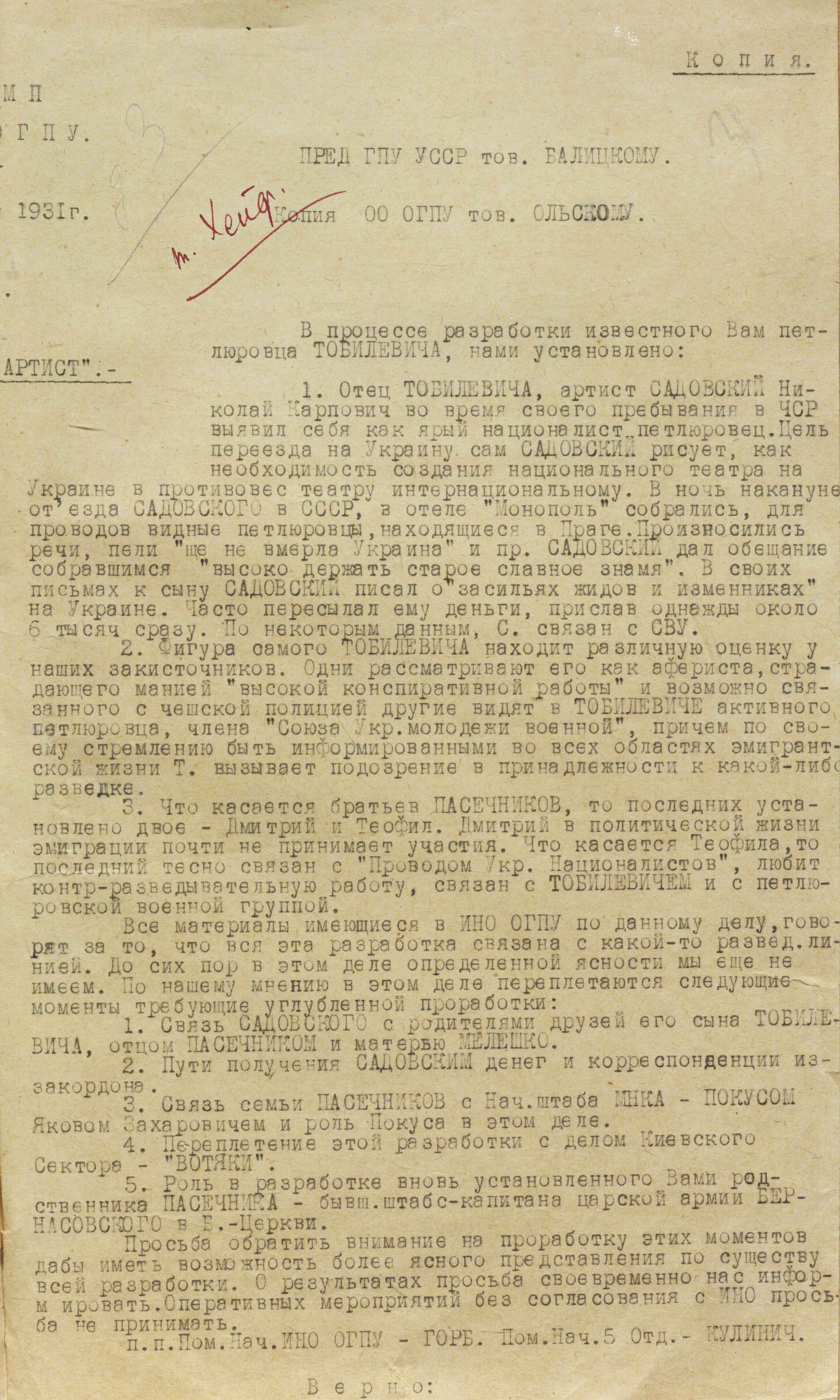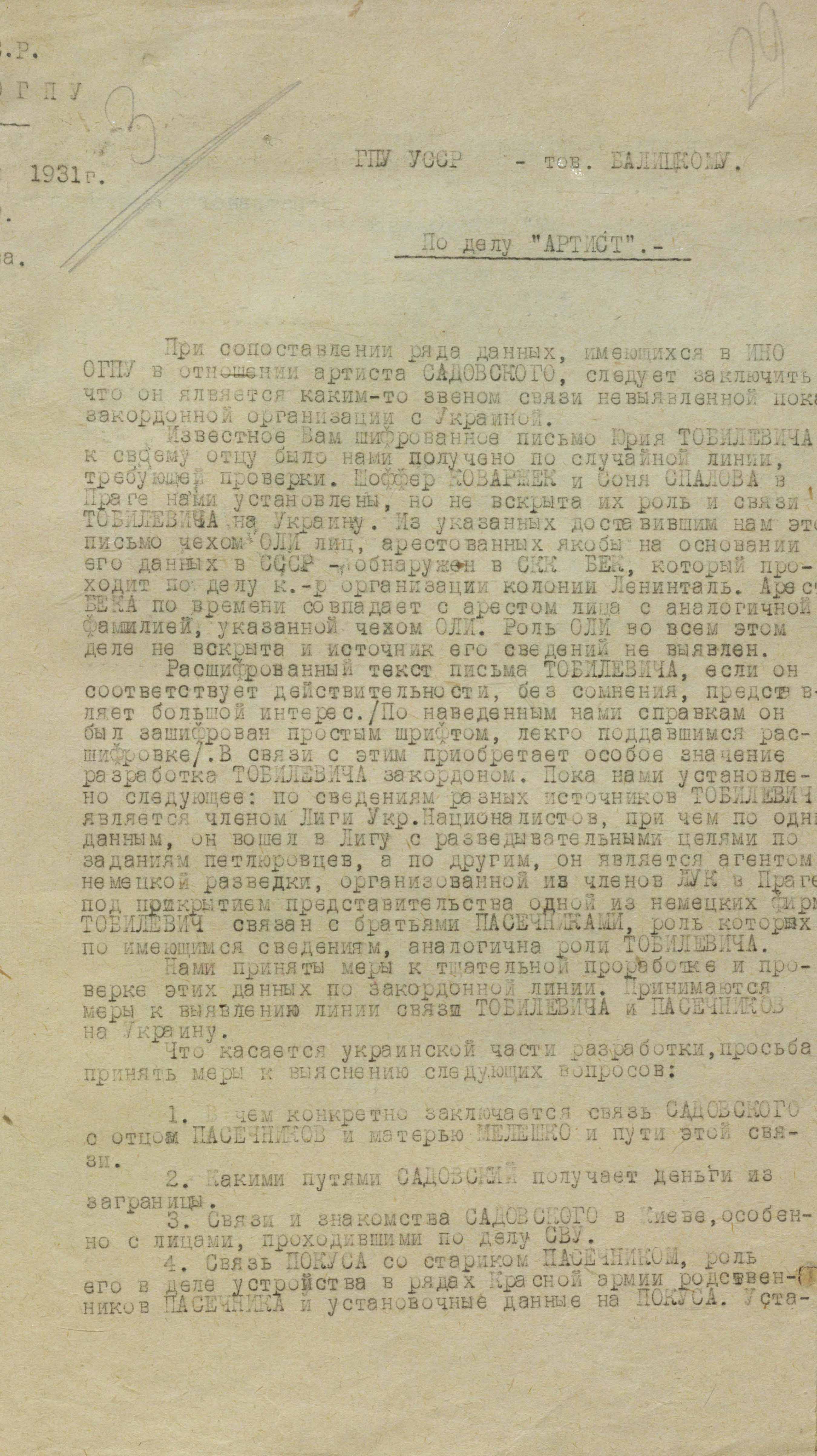 The Kyiv operational sector of the gpu was tasked to study M. Sadovskyi and his circle of acquaintances in more detail. At the same time, in June 1931, the foreign branch of the gpu of the Ukrainian ssr planned an operation to bring an agent to him. Later, the agent was supposed to be sent abroad, to Prague, to be infiltrated into M. Tobilevych's environment. Here is how it is described in the document: