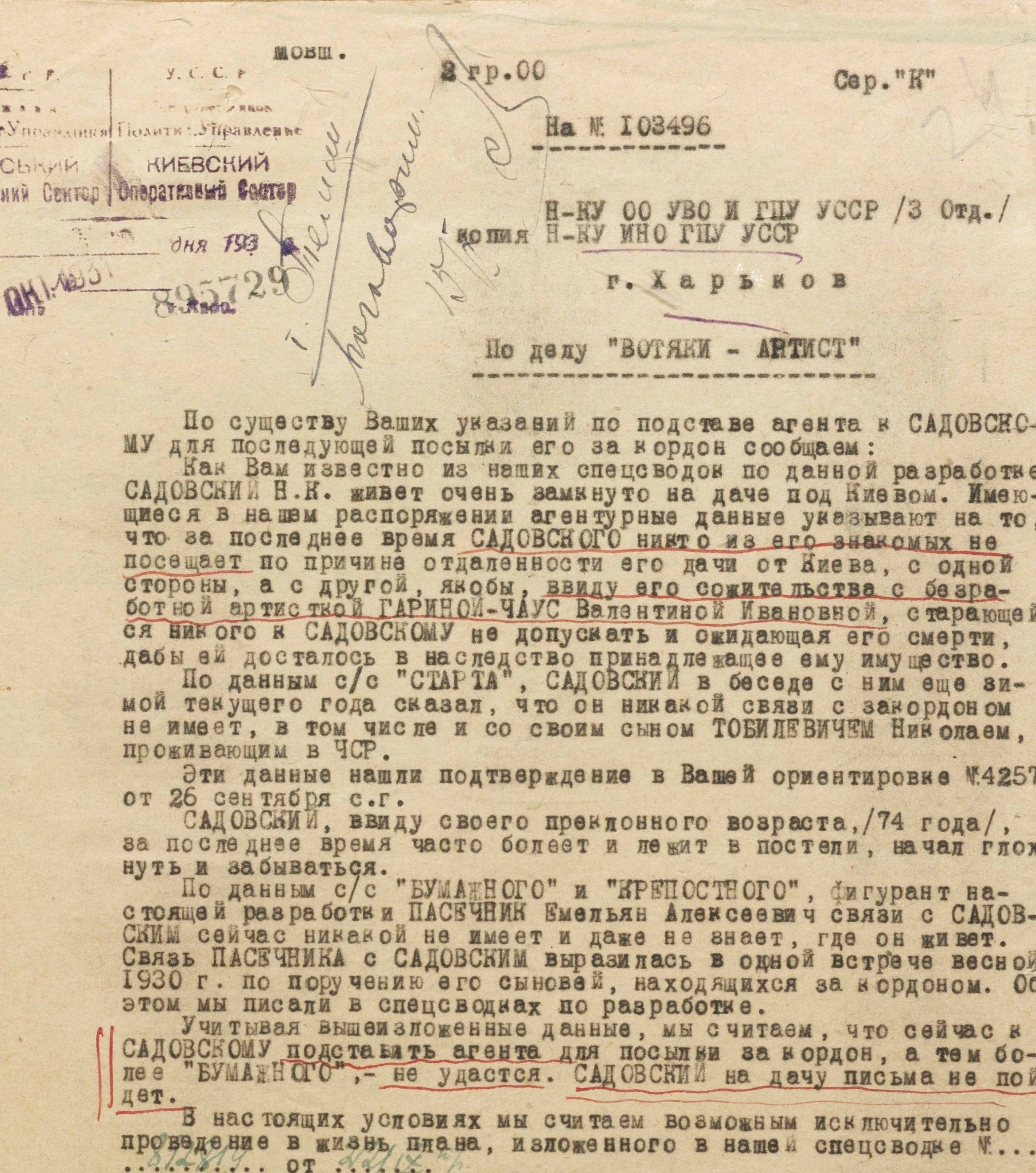“Sadovskyi lives a very secluded existence in a dacha near Kyiv. The agent information at our disposal shows that none of his acquaintances have been visiting Sadovskyi lately because of the remoteness of his dacha from Kyiv on the one hand, and, on the other hand, allegedly because he lives with an unemployed actress, Valentyna Ivanivna Harina-Chaus, who wants to keep Sadovskyi isolated from society and is looking forward to his death so that she can inherit all his property...