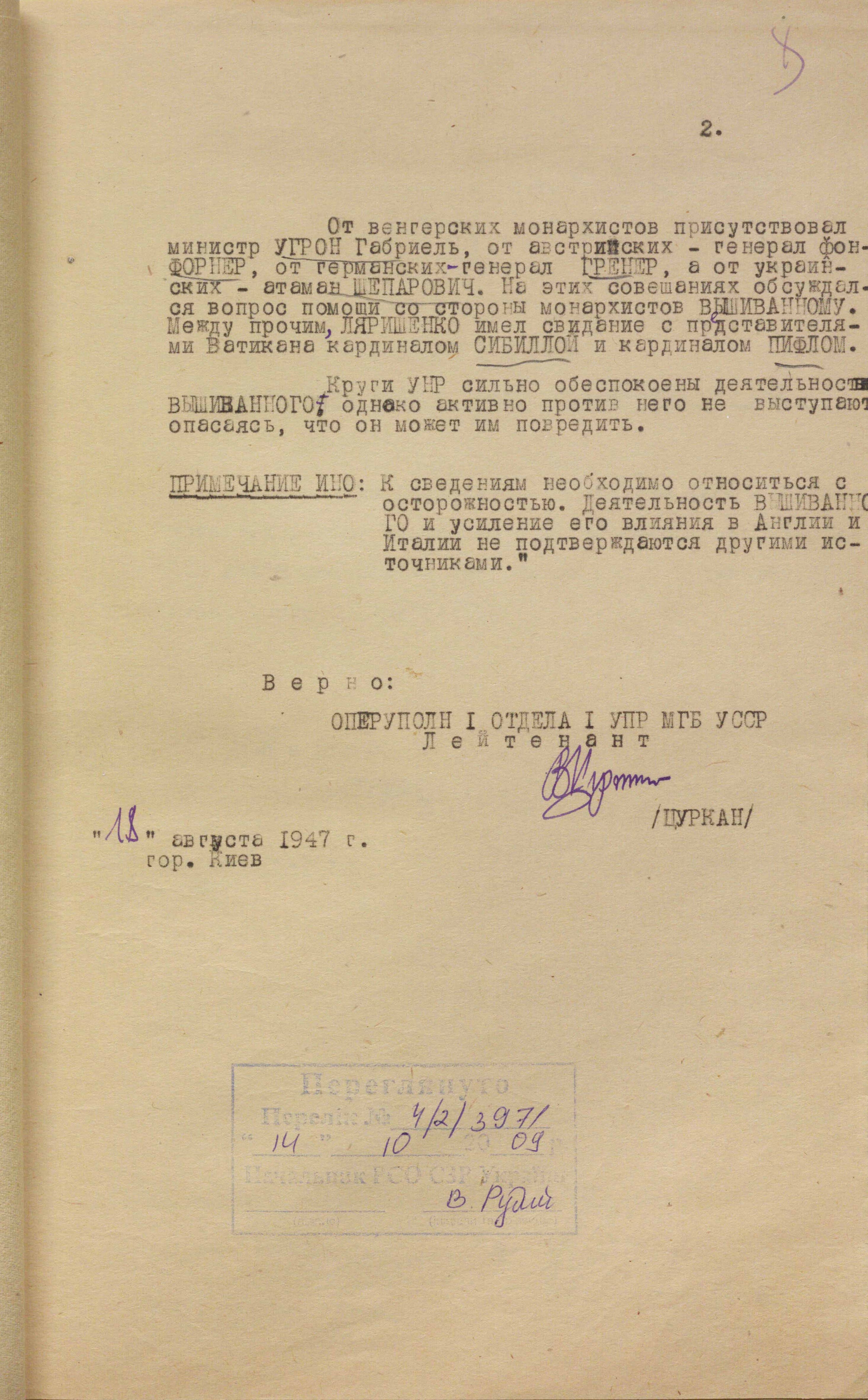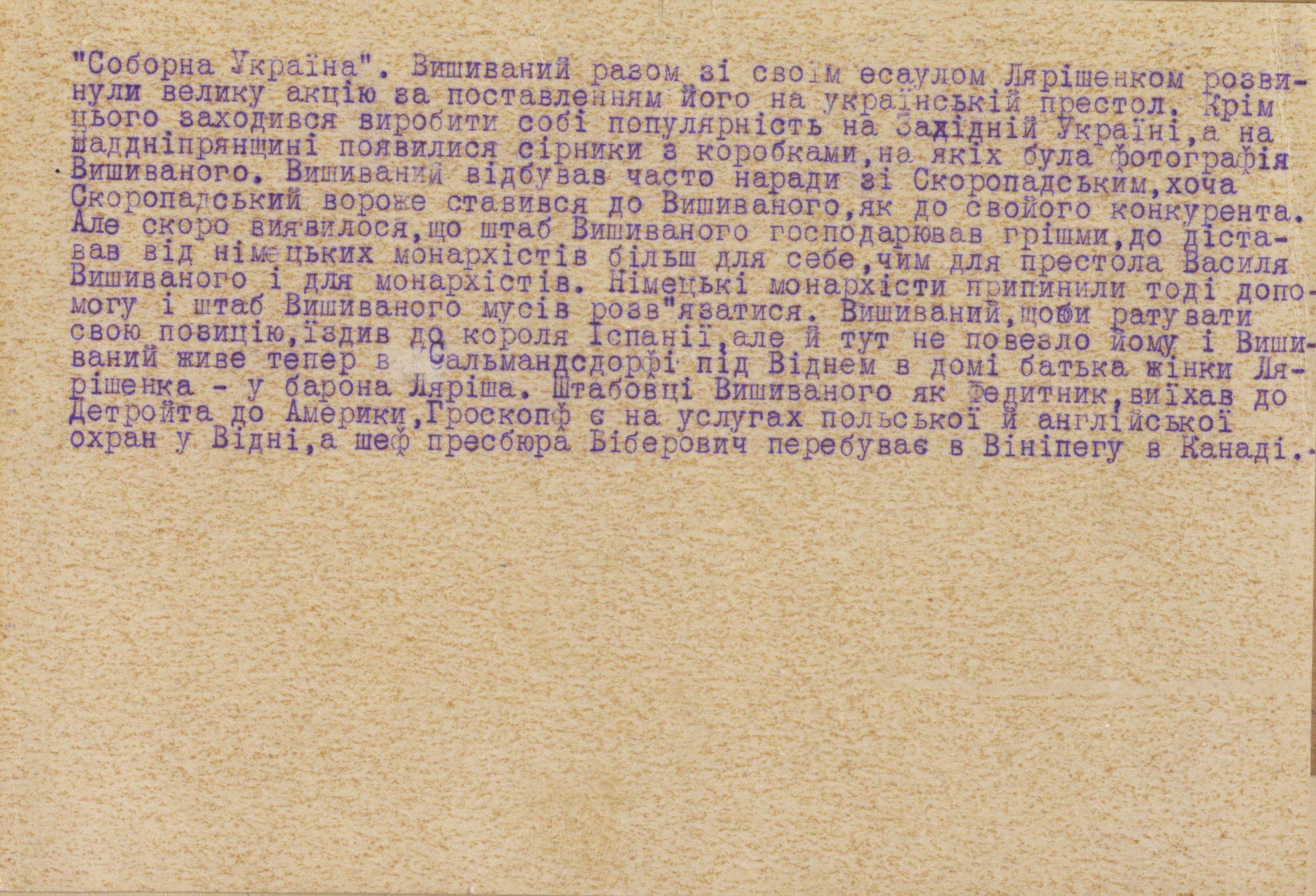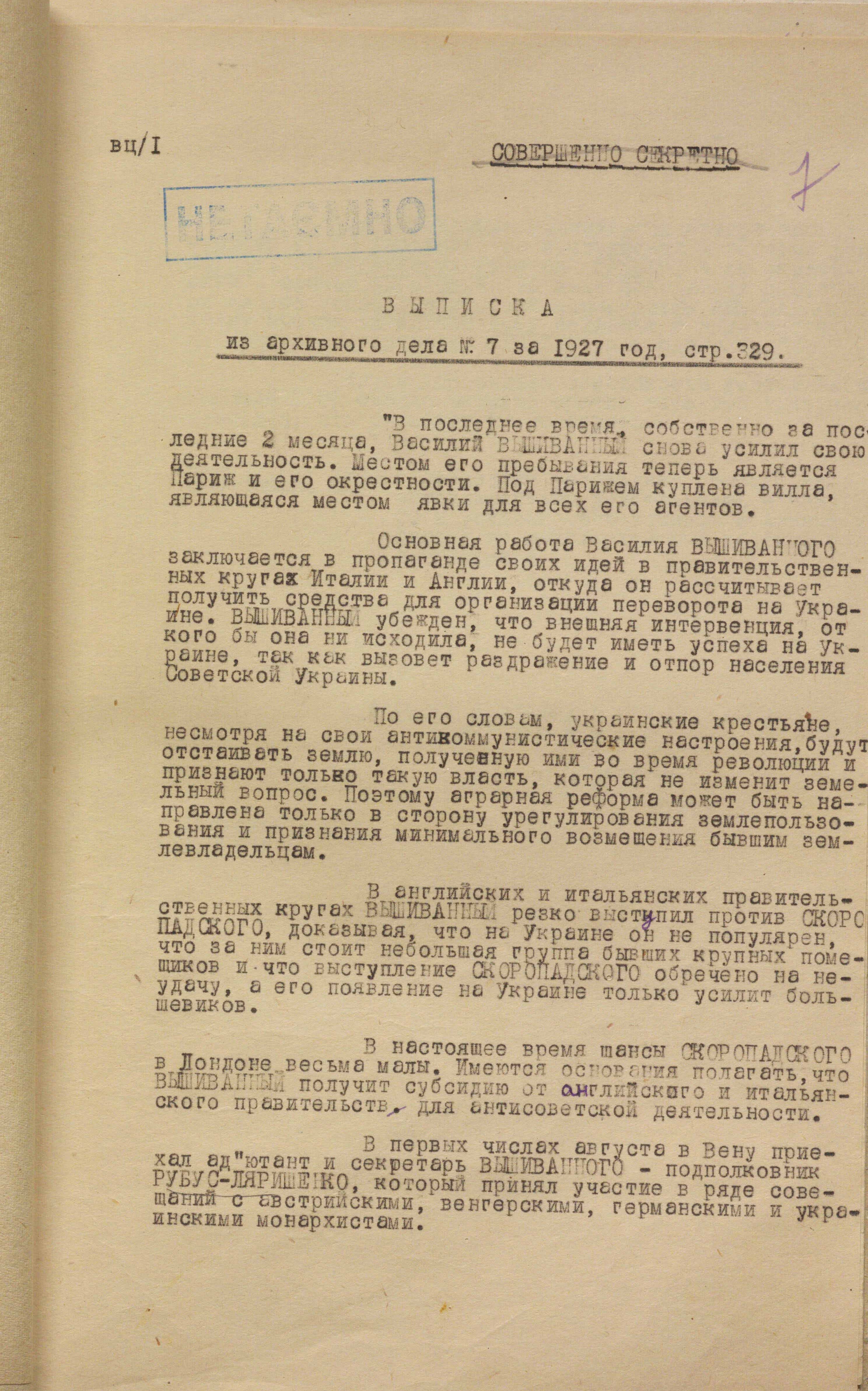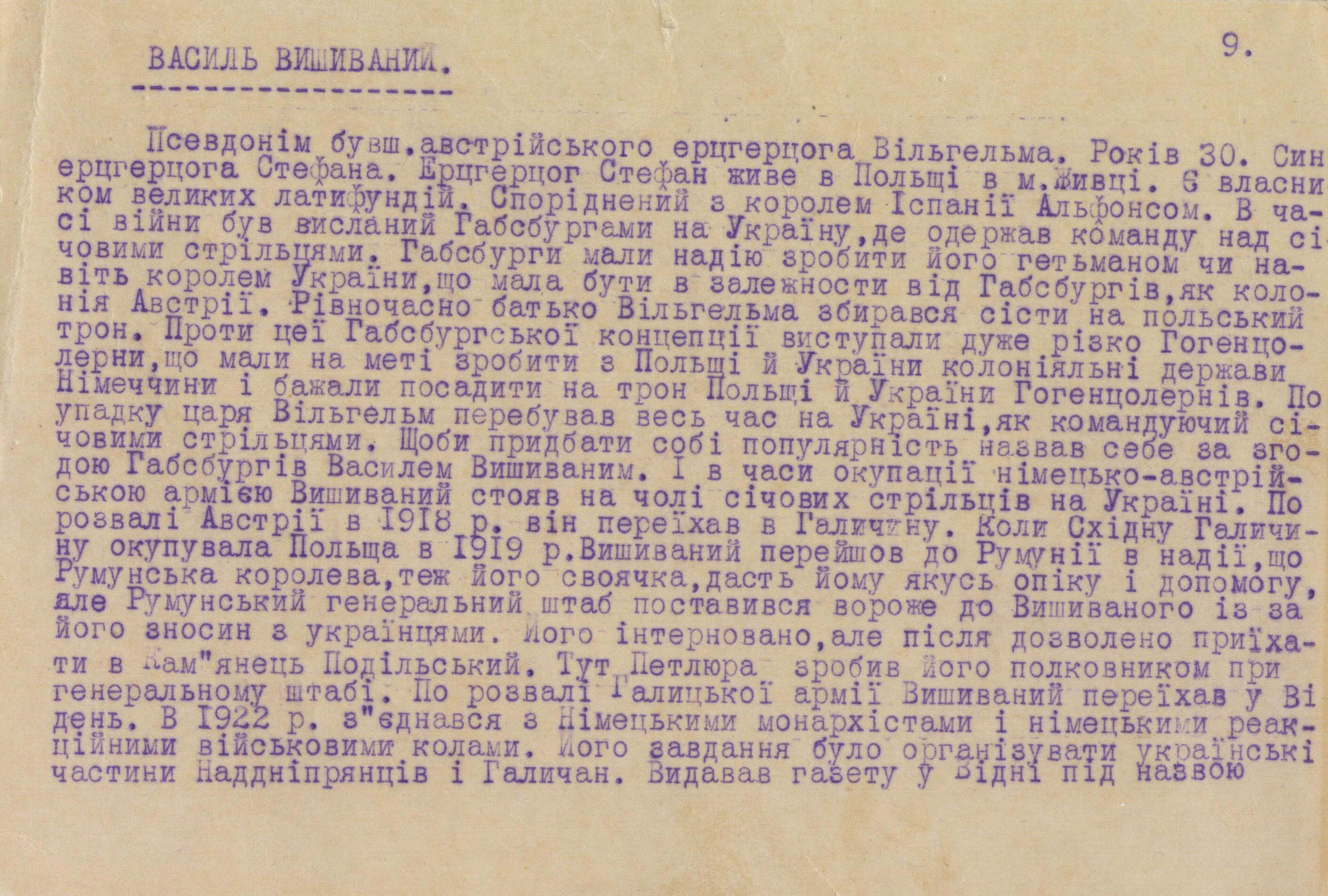 On the occasion of the 130th anniversary of the birth of Vasyl Vyshyvanyi (born February 10, 1895), Austrian Archduke Wilhelm Franz von Habsburg-Lothringen, the Foreign Intelligence Service of Ukraine is publishing new documents from the archival case file on him. They add to the information that was previously published and allow us to better understand the multifaceted image of the fighter for the Ukrainian cause, his attempts to persuade influential European politicians and statesmen to take his side and gain support in Ukraine’s getting rid of moscow's influence and joining civilized Europe. Among other things, they tell about his numerous contacts and meetings in Germany, Austria, France, Spain, Poland, Romania, Italy, and the Vatican.