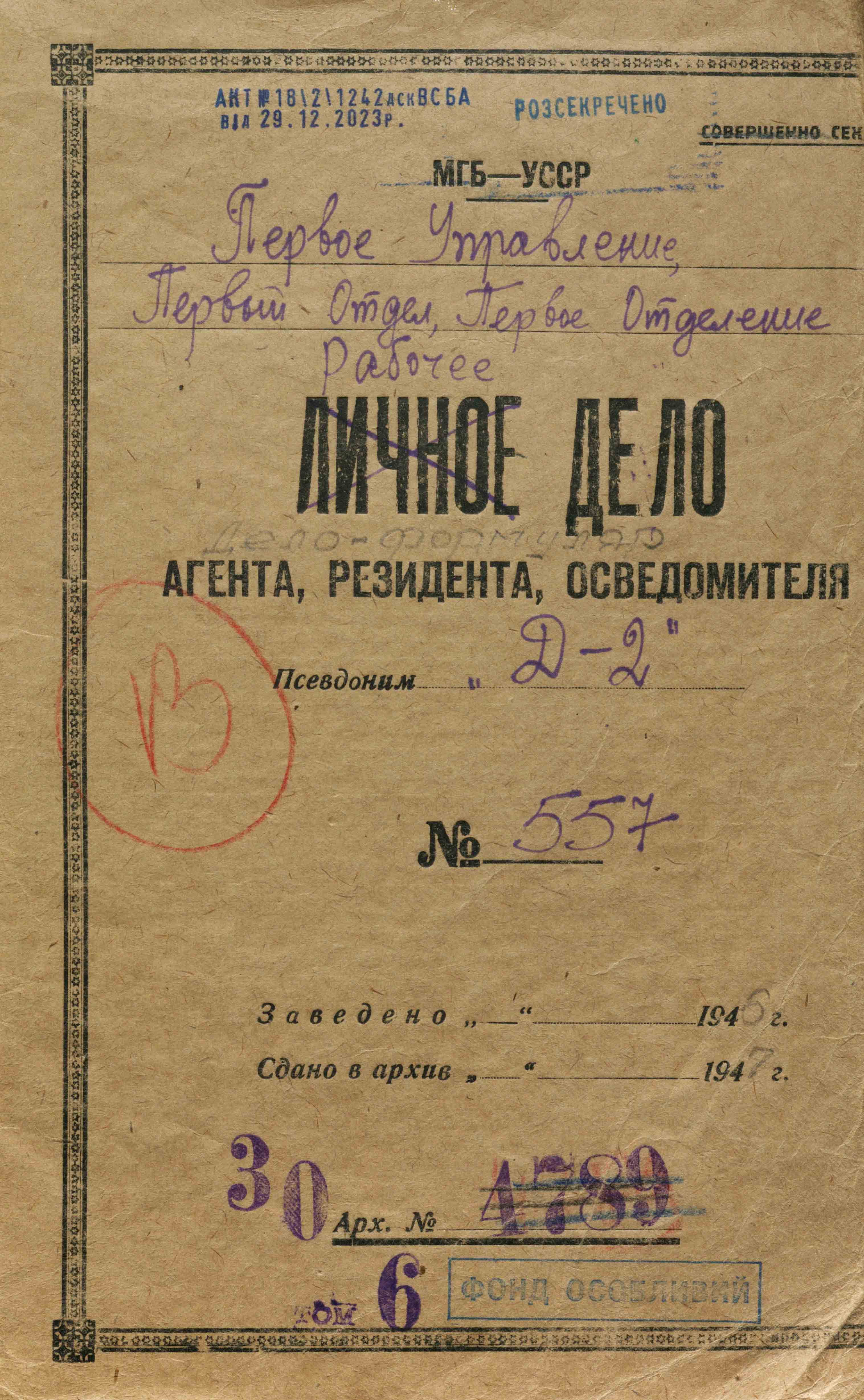 Після отримання згоди з москви вербування документально оформили, відібрали підписку, обрали агентурний псевдонім «Д-2» за назвою справи і сфотографували агента «на пам’ять» у компанії оперативних працівників. Так само, як це робили у випадку із «Зірчиним» та іншими агентами. Невдовзі його поселили на конспіративній квартирі в Києві і почали готувати до виведення за кордон та впровадження у керівні ланки ОУН.