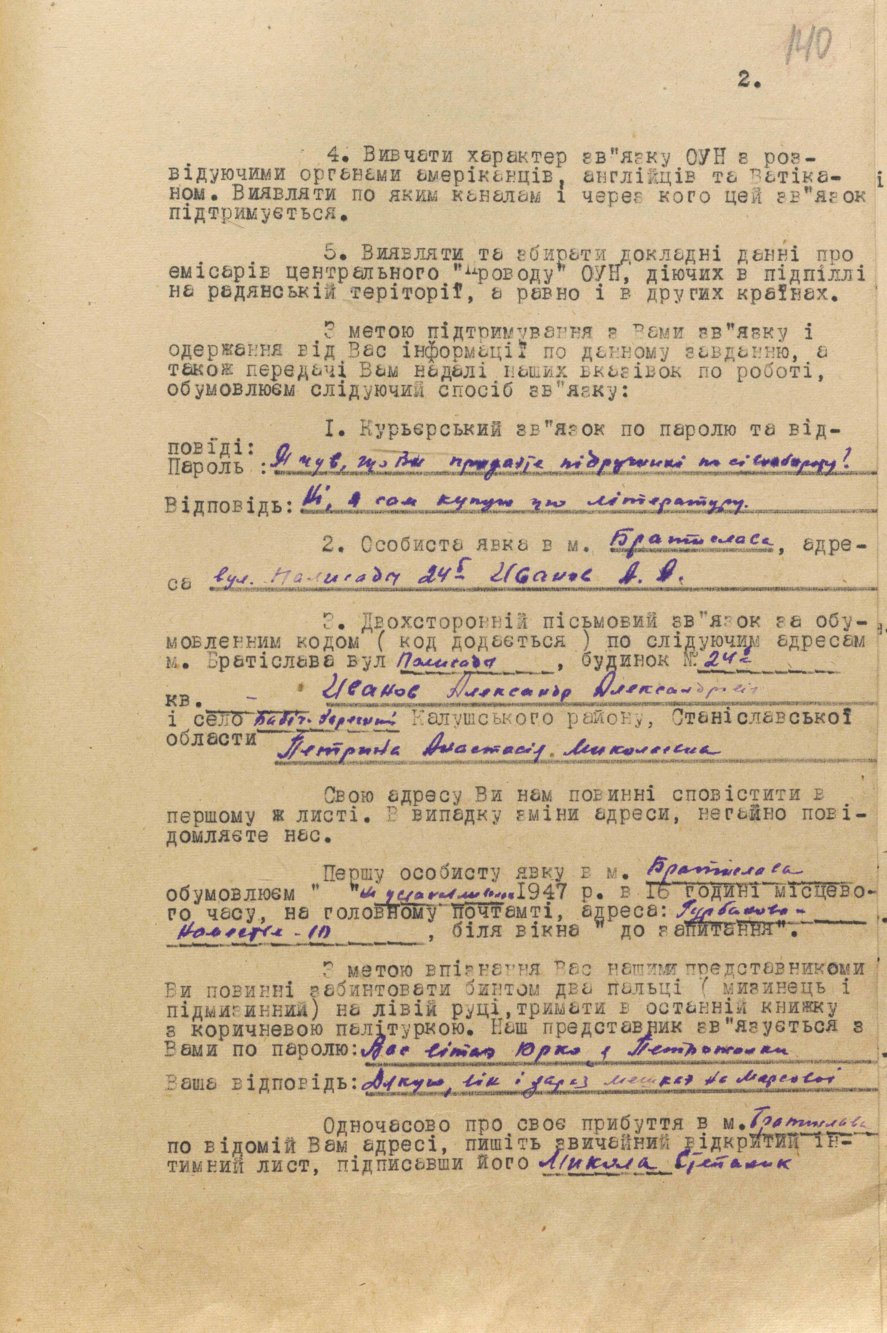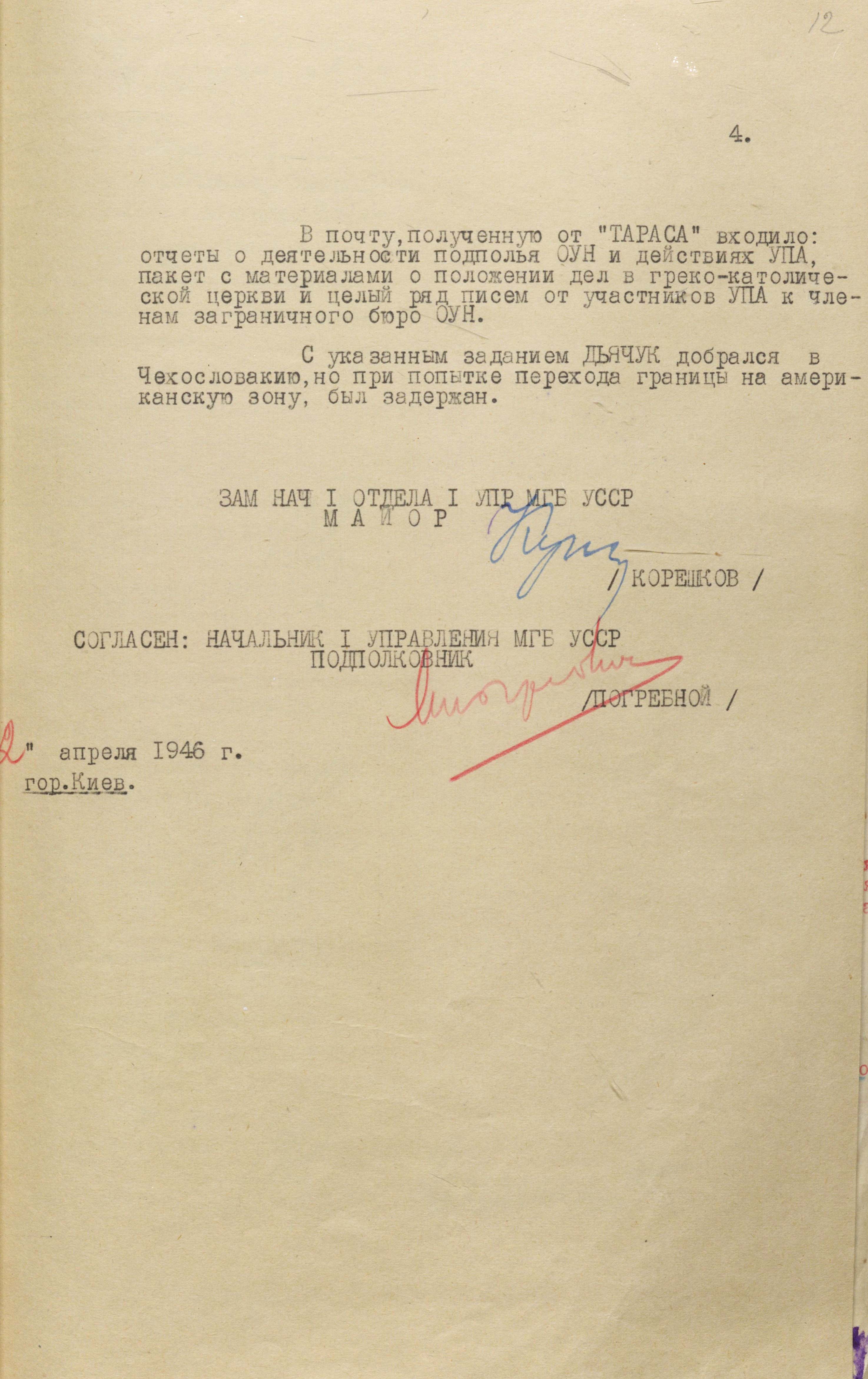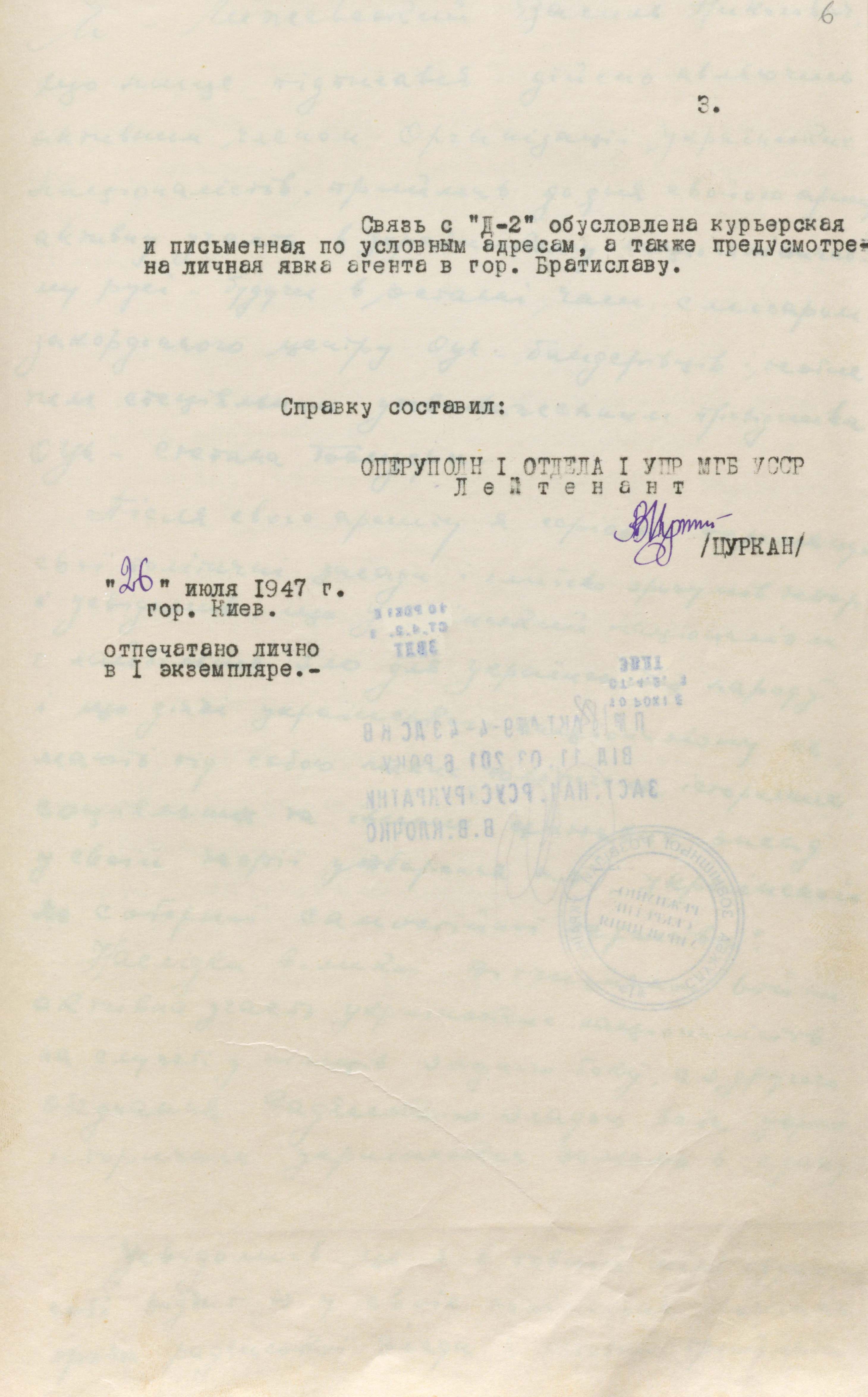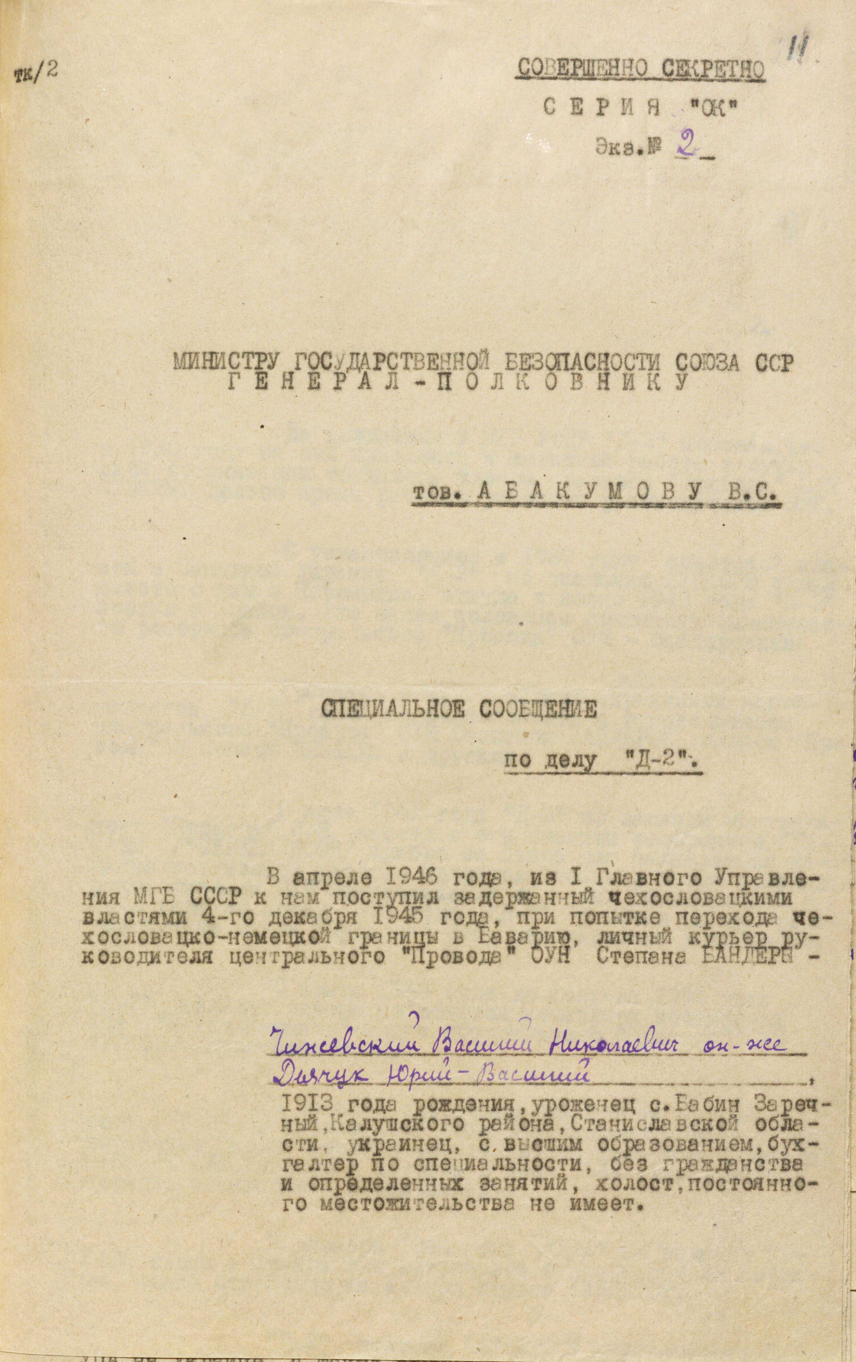 29 серпня 1946 року з Києва до москви на ім’я міністра держбезпеки В. Абакумова надіслали спецповідомлення, в якому зазначалося таке: «З урахуванням становища “Д-2” в організації ОУН, його довірчих взаємостосунків із Бандерою та наявності близьких зв’язків із визначними оунівцями, а також його позитивної поведінки під час слідства вважаємо можливим його вербування і виведення за кордон за “легендою”, що додається, для виконання наших завдань із впровадження до Закордонного центру організації українських націоналістів бандерівського спрямування і розробки їх антирадянської діяльності, а за сприятливого осідання й роботи використати агента для ліквідації Степана Бандери» (ГДА СЗРУ. – Ф. 1. – Спр. 30. – Т. 4. – Арк. 14).
