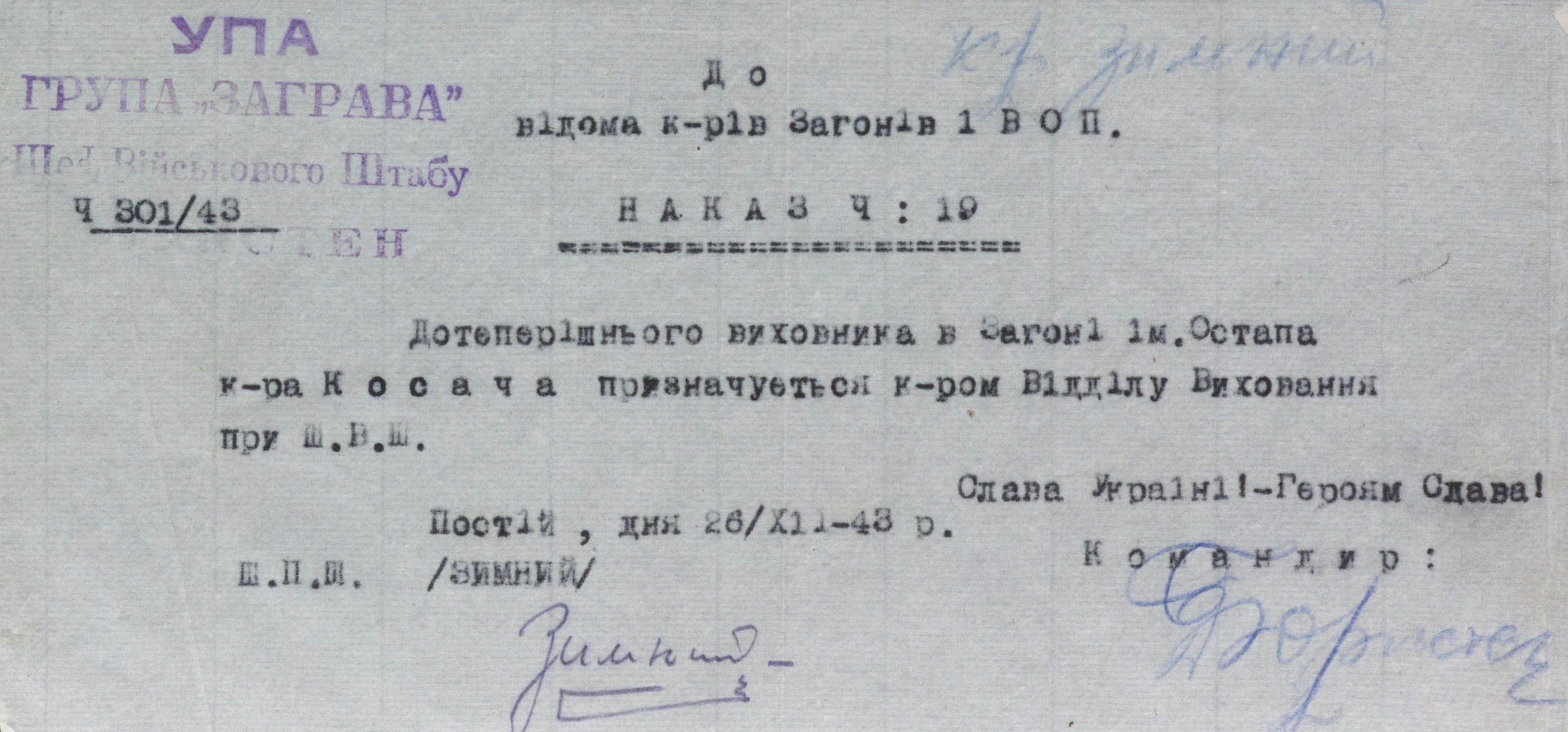 Визначальним і мотиваційним є наказ Ч. 22 від 26 листопада 1943 року, підписаний командиром УПА Панасом Мосуром (одне із псевд Дмитра Клячківського), і адресований командирам груп, командирам запілля, політкерівникам, Українському Червоному Хрестові. У ньому йдеться про зміни ситуації на фронті, про те, що на українські землі знову повертається нога московського окупанта – «на місце імперіалістичної Німеччини приходить імперіалістична москва у формі срср». Відтак доведеться боротися і проти одних, і проти інших. У нових умовах «треба нам в організованих лавах УПА, а то й в цілому народові скріпити духовні сили, підготувати УПА й цілий народ до дальшої, ще інтенсивнішої боротьби під новою займанщиною. Такі зміни захитують звичайно рівновагу духа в народі. Треба не допустити до духовного захитання, бо це загрозливо нашій визвольній справі».