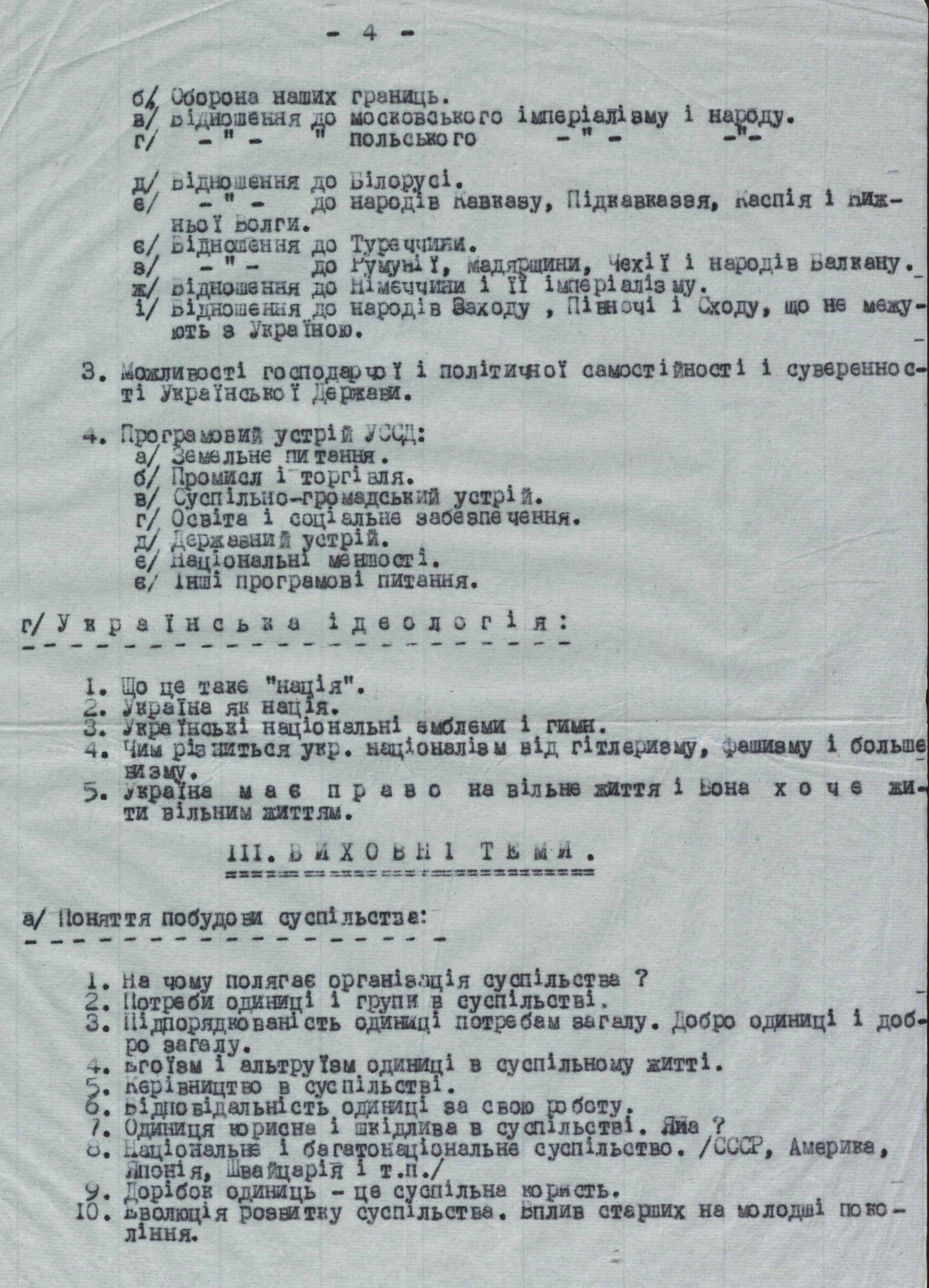 Більшість матеріалів датована другою половиною 1943 року. У них – методичні рекомендації з проведення політико-виховної роботи, інструкції, накази, конспекти, листівки і власноруч зроблені нотатки. Один із перших наказів зобов’язує політвиховників УПА сконтактуватися з політичними референтами ОУН на тих теренах, де перебуває військо, і спільно вести роботу. Тобто обговорювати назрілі питання, проводити різні заходи для населення, зокрема до свят, обмінюватися літературою.