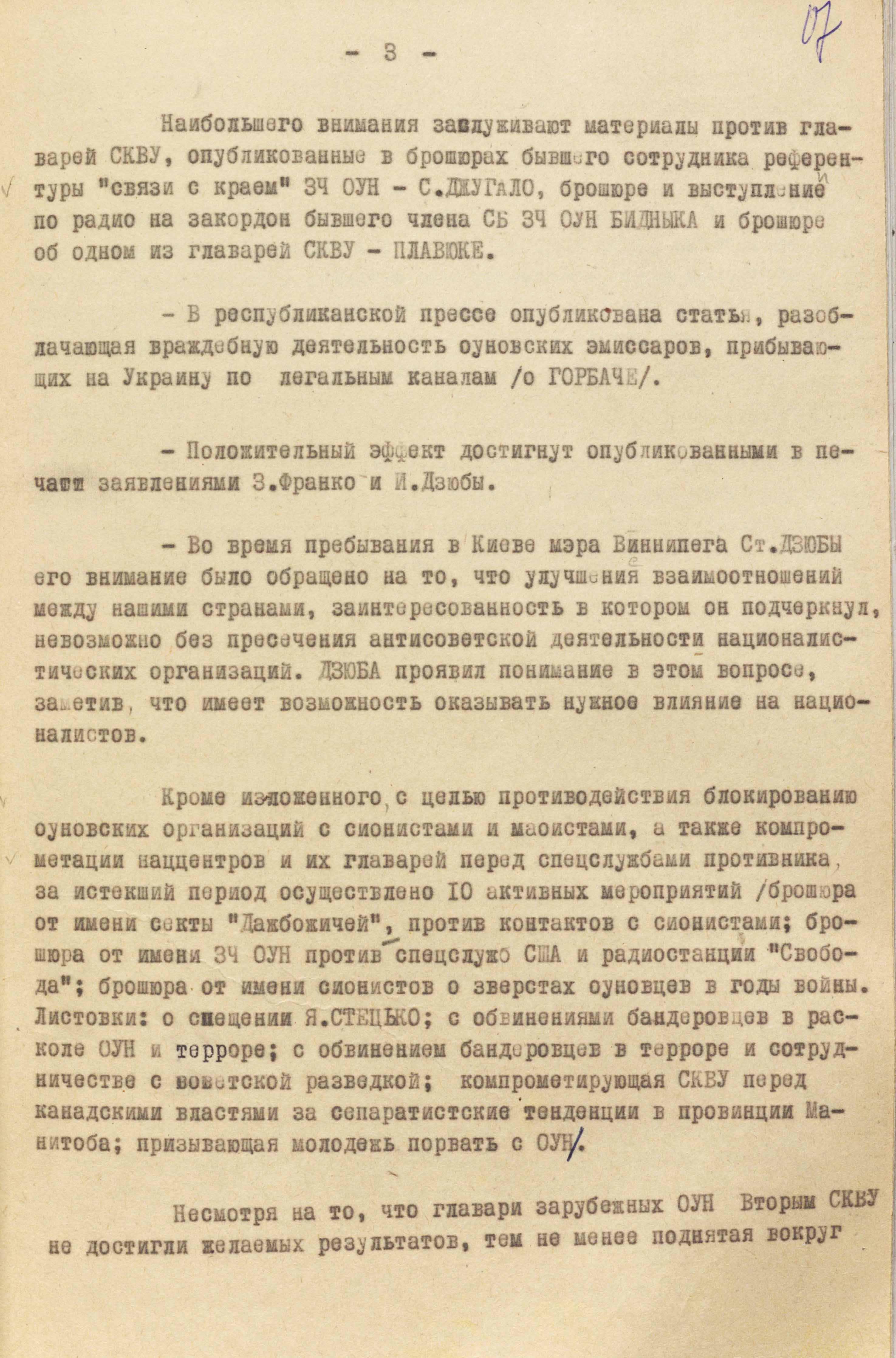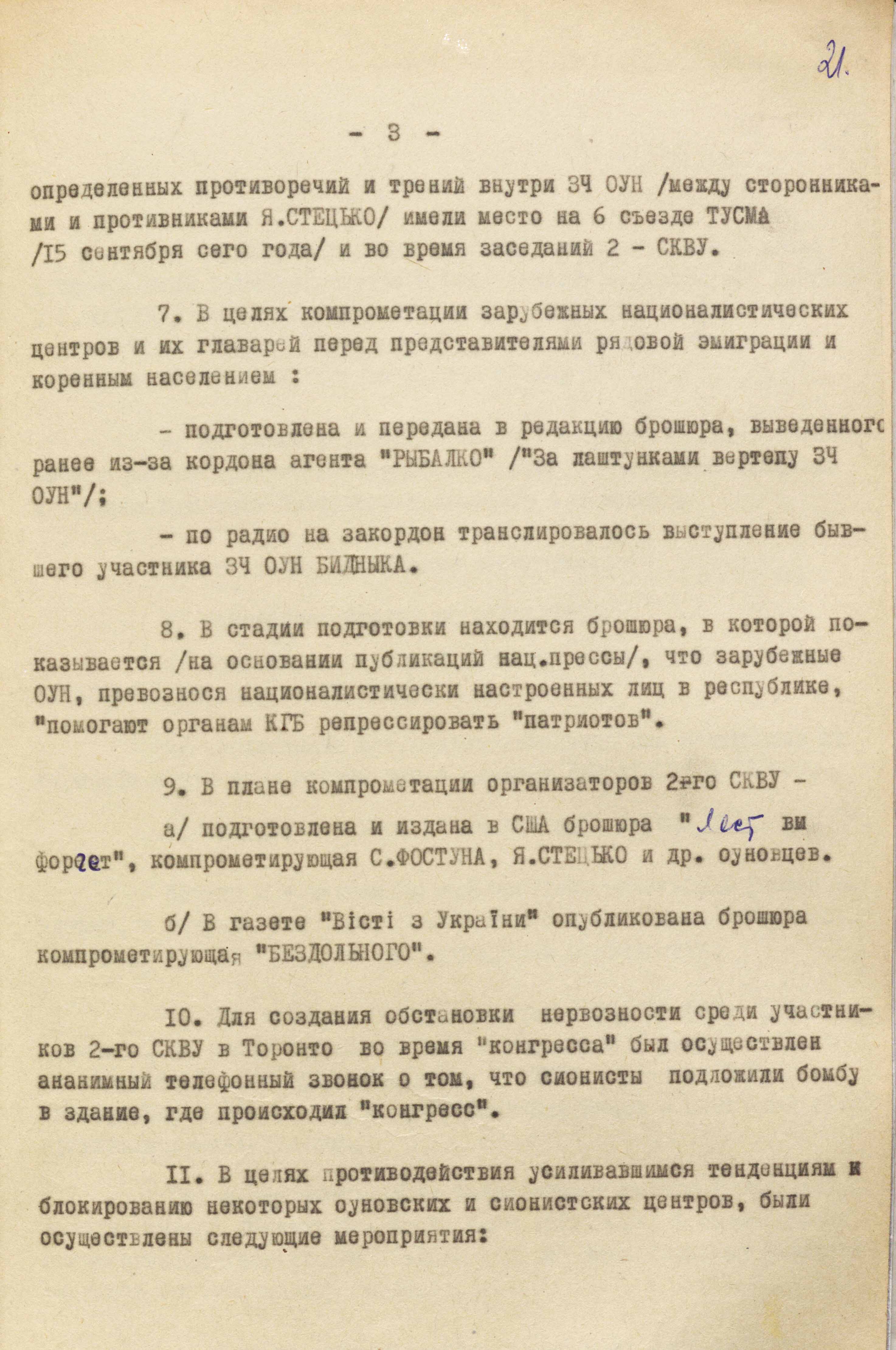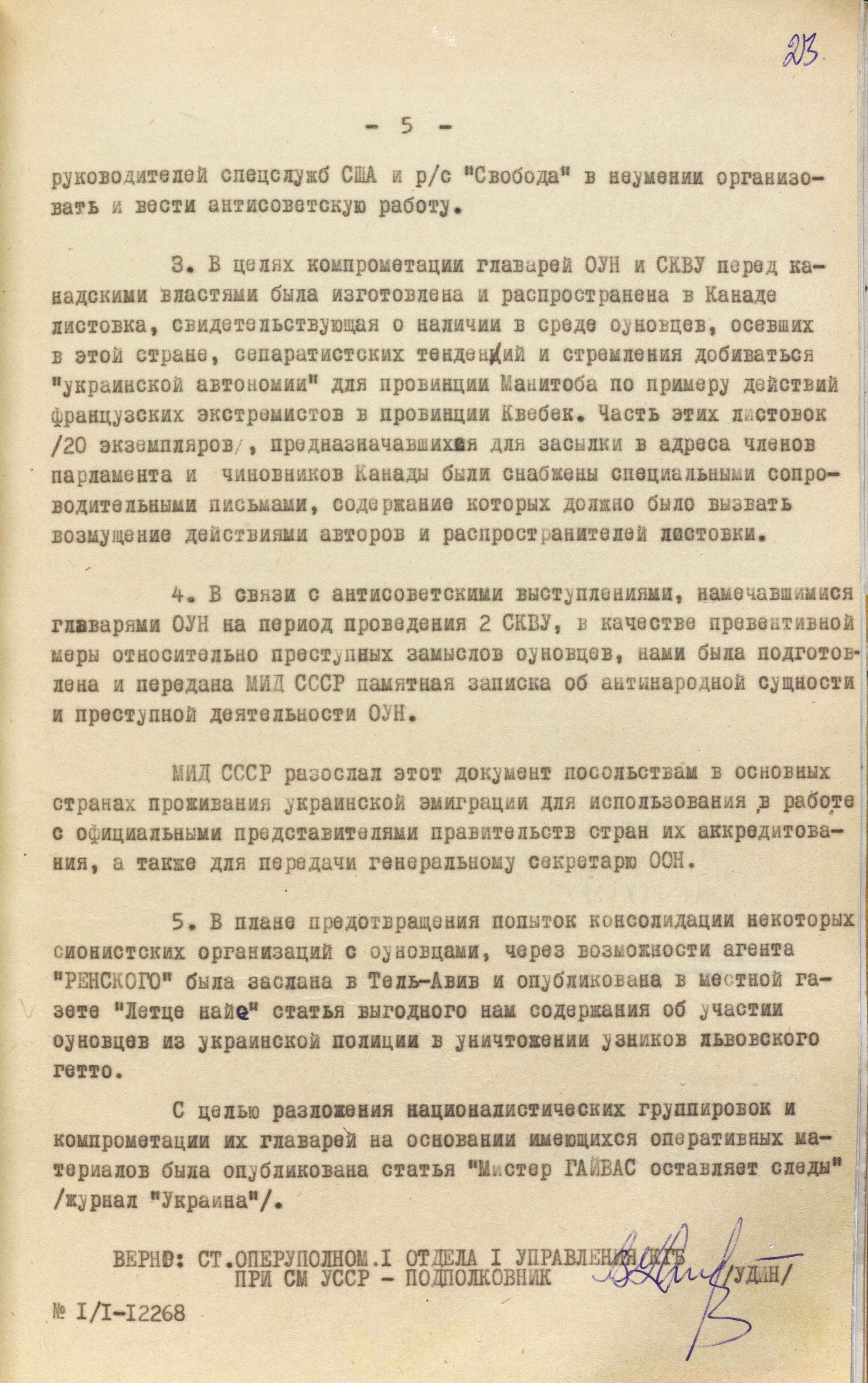 «З метою компрометації лідерів ОУН та СКВУ перед канадською владою, – йшлося в іншому пункті, – була підготовлена і поширена в Канаді листівка, яка свідчить про наявність у середовищі оунівців, які осіли на мешкання в цій країні, сепаратистських тенденцій і прагнення добиватися “української автономії” для провінції Манітоба за прикладом дій французьких екстремістів у провінції Квебек. До частини цих листівок (20 примірників), які призначалися для надсилання на адреси членів парламенту і чиновників Канади, долучили спеціальні листи, зміст яких мав викликати невдоволення діями авторів і поширювачів листівок» (ГДА СЗРУ. – Ф. 1. – Спр. 12568. – Т. 4. – Арк. 23).