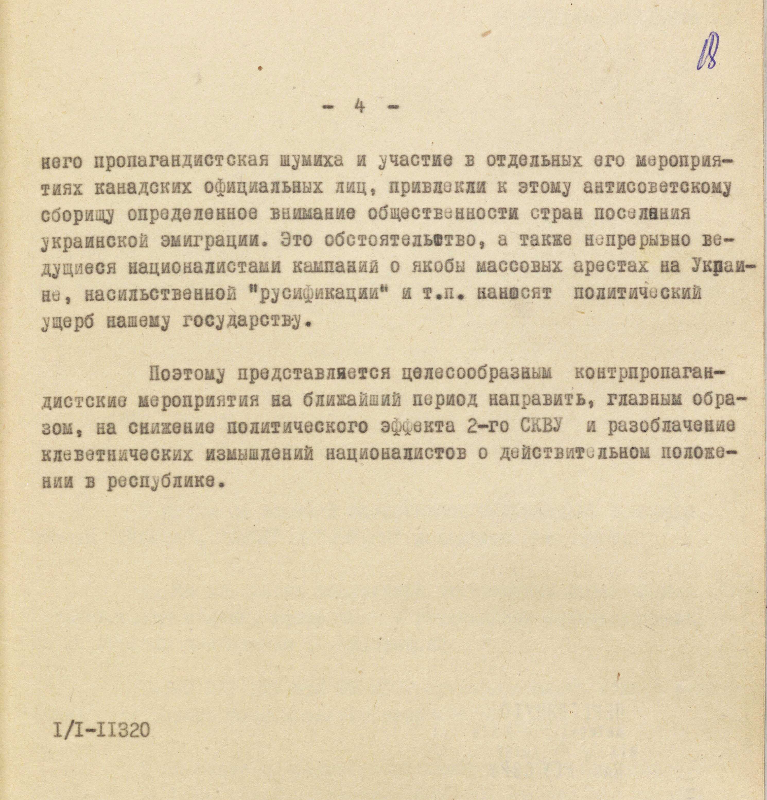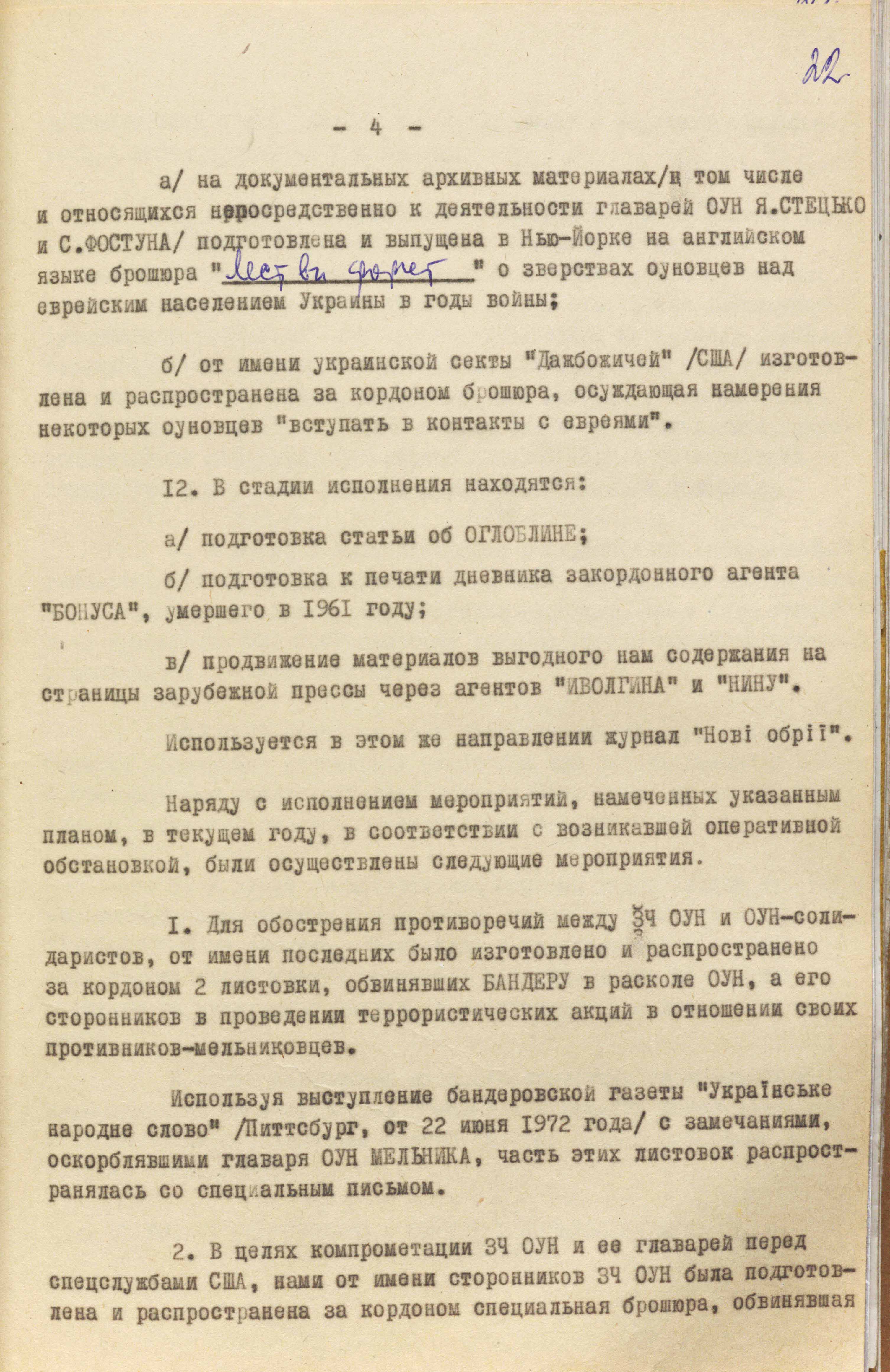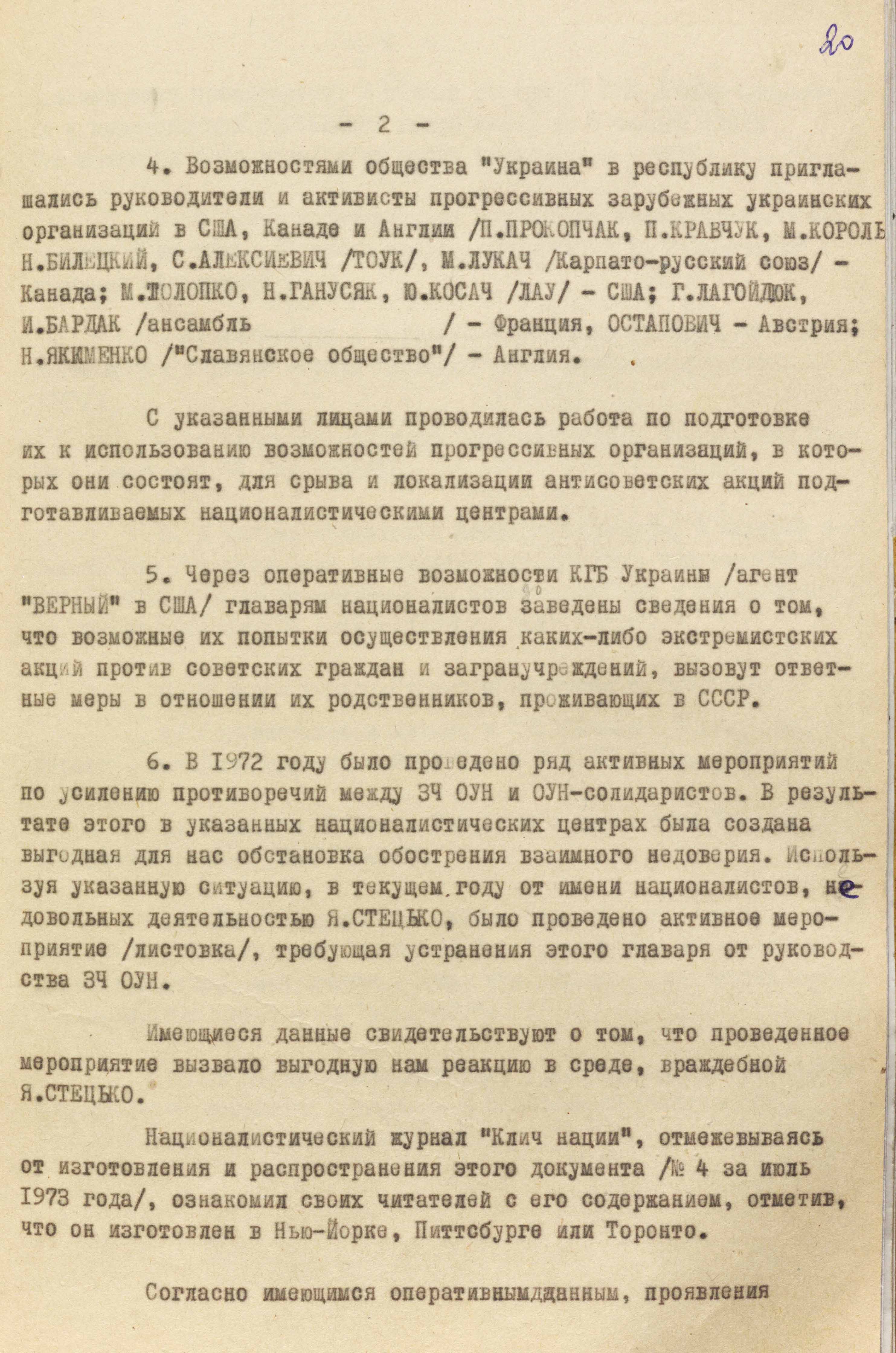 «З метою компрометації лідерів ОУН та СКВУ перед канадською владою, – йшлося в іншому пункті, – була підготовлена і поширена в Канаді листівка, яка свідчить про наявність у середовищі оунівців, які осіли на мешкання в цій країні, сепаратистських тенденцій і прагнення добиватися “української автономії” для провінції Манітоба за прикладом дій французьких екстремістів у провінції Квебек. До частини цих листівок (20 примірників), які призначалися для надсилання на адреси членів парламенту і чиновників Канади, долучили спеціальні листи, зміст яких мав викликати невдоволення діями авторів і поширювачів листівок» (ГДА СЗРУ. – Ф. 1. – Спр. 12568. – Т. 4. – Арк. 23).