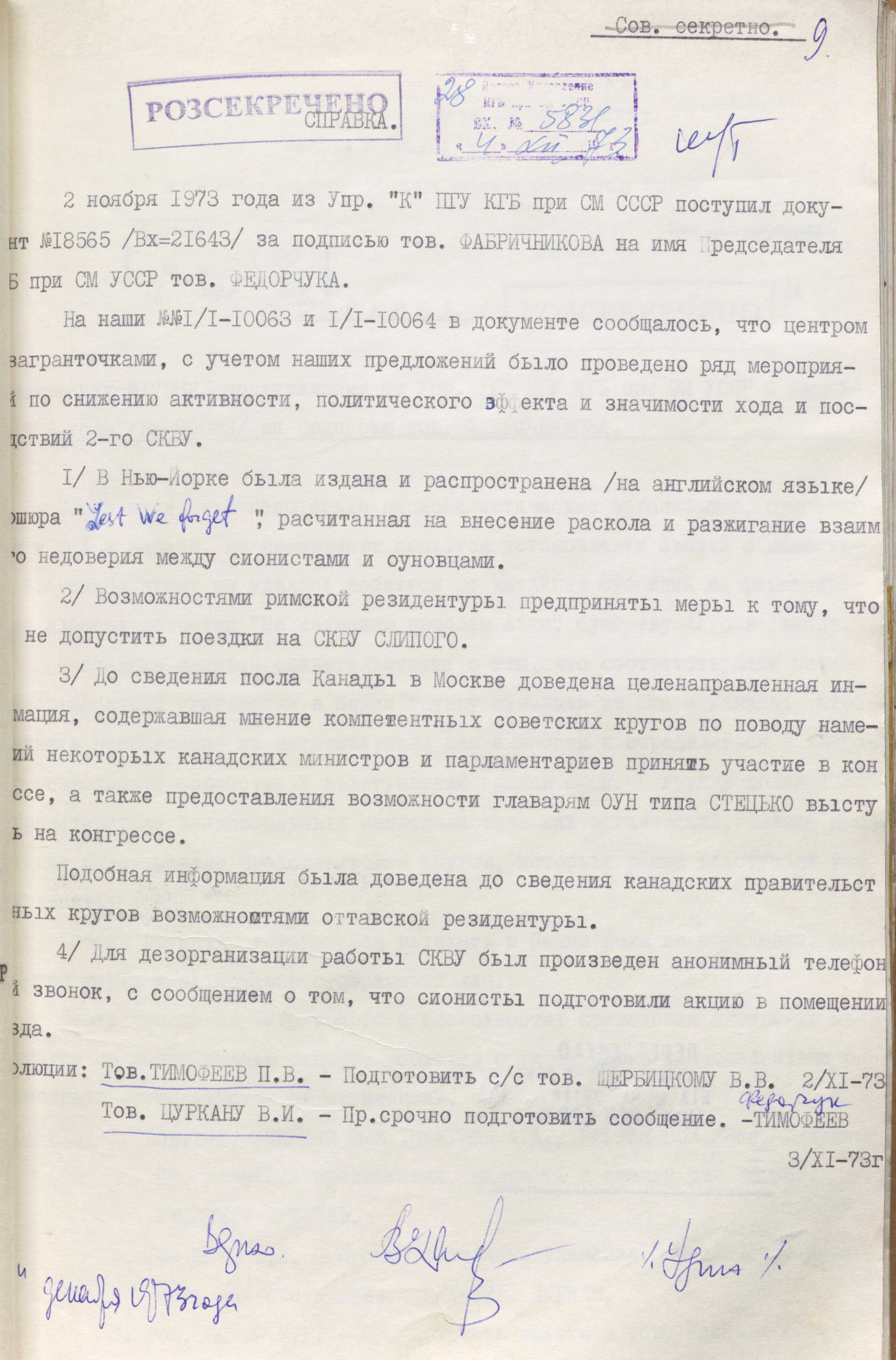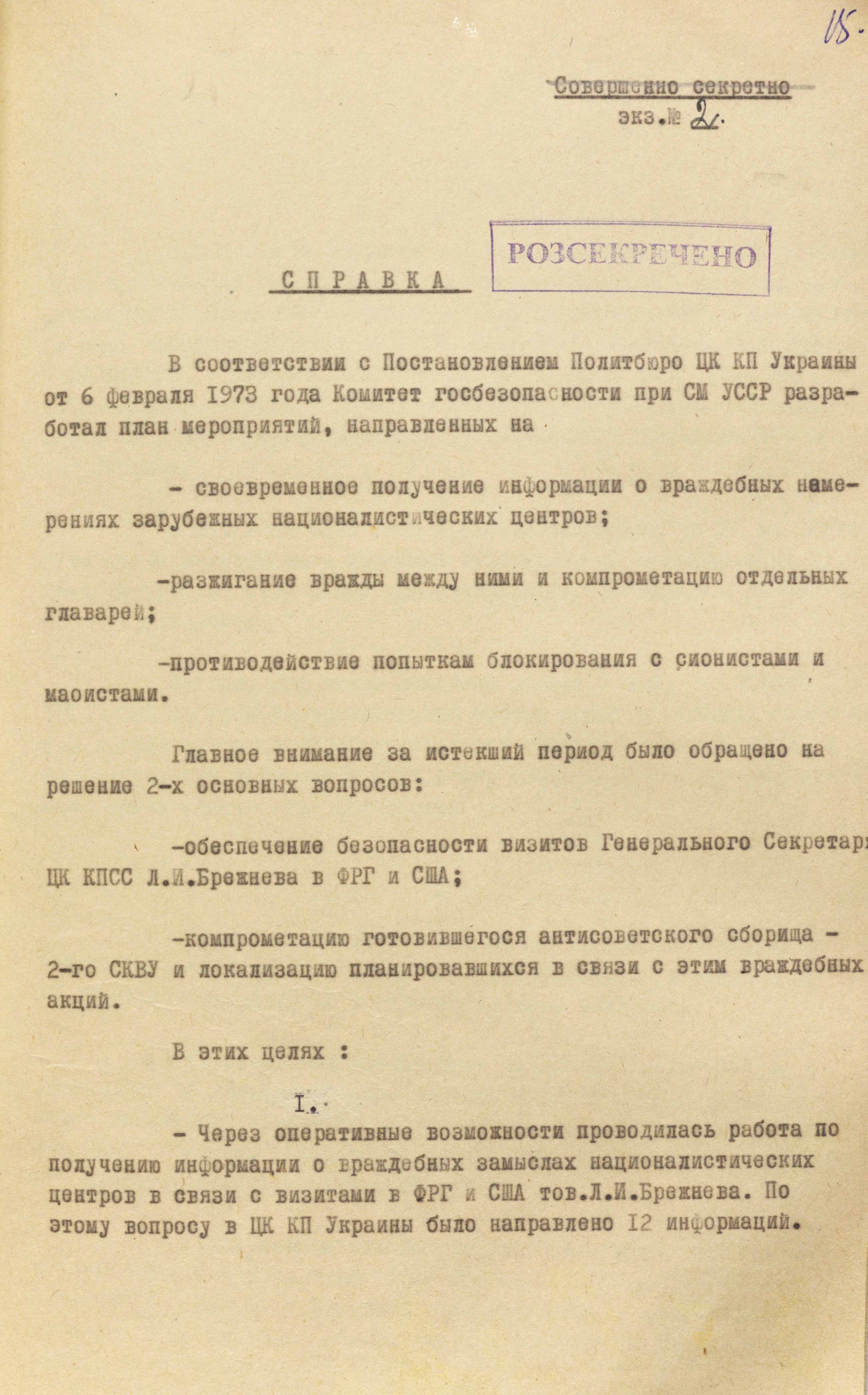 У лютому 1973 року на засіданні політбюро цк компартії України прийняли постанову «Про заходи щодо посилення інформаційно-пропагандистської роботи за кордоном і протидії ідеологічним диверсіям буржуазних і буржуазно-націоналістичних закордонних центрів». Окремими пунктами цієї постанови прописувалася «компрометація антирадянського зібрання – 2-го СКВУ і локалізація запланованих у зв’язку з цим ворожих акцій». На виконання цієї постанови в кдб урср розробили план спеціальних заходів.