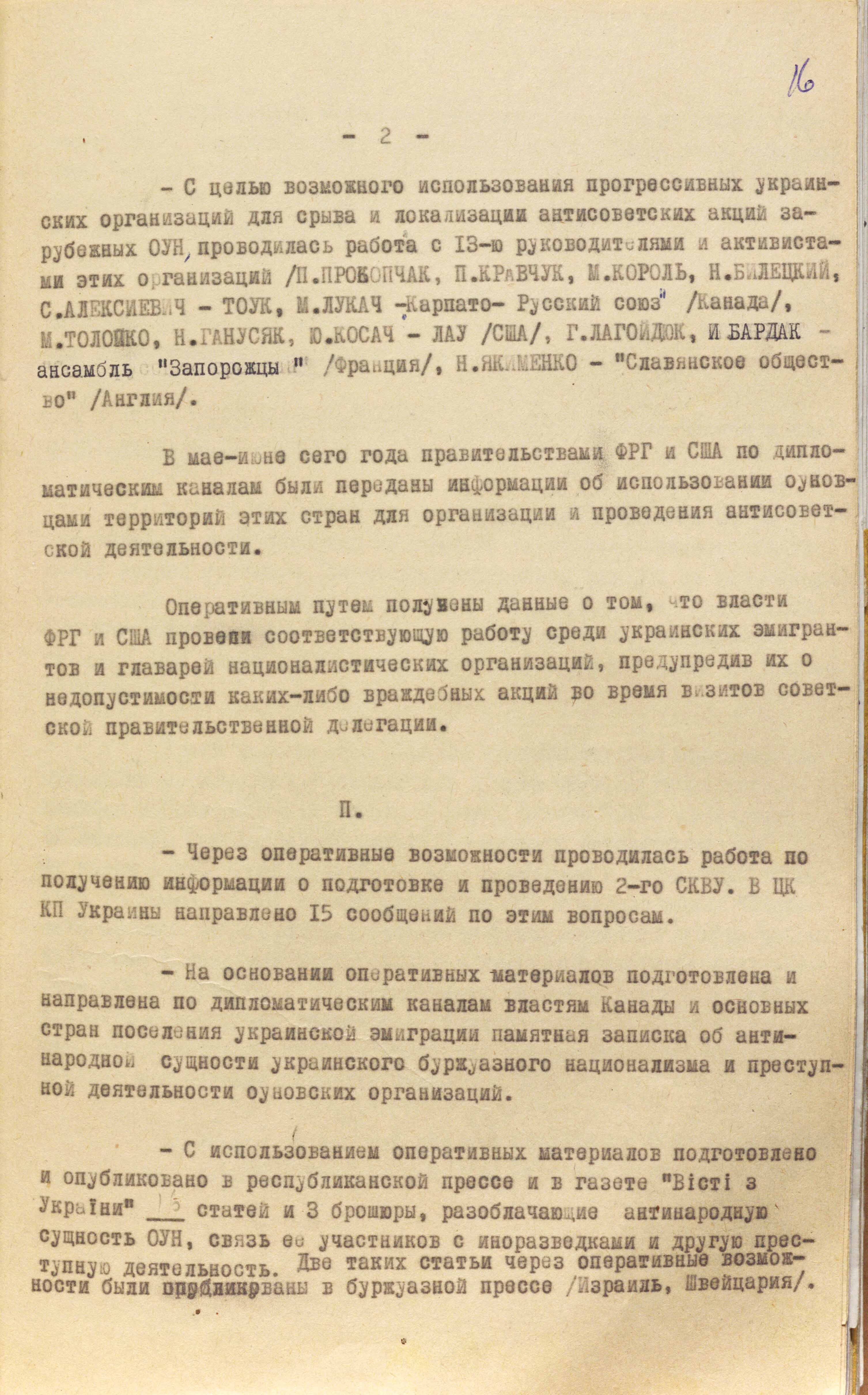 Крім того, центральний апарат кдб срср через закордонні резидентури проводив відповідну роботу з так званими прогресивними українськими організаціями – Товариством об’єднаних українців Канади, «Карпато-руським союзом» (Канада), «Лігою американських українців» (США), «Слов’янським товариством» (Англія) та іншими. Загалом із 13 керівниками й активістами цих організацій. У звіті, який надійшов із москви за підсумками здійснених заходів, у Києві дізналися, що окремо через можливості римської резидентури кдб срср вживав заходів, щоб не допустити поїздку на СКВУ кардинала Йосифа Сліпого.