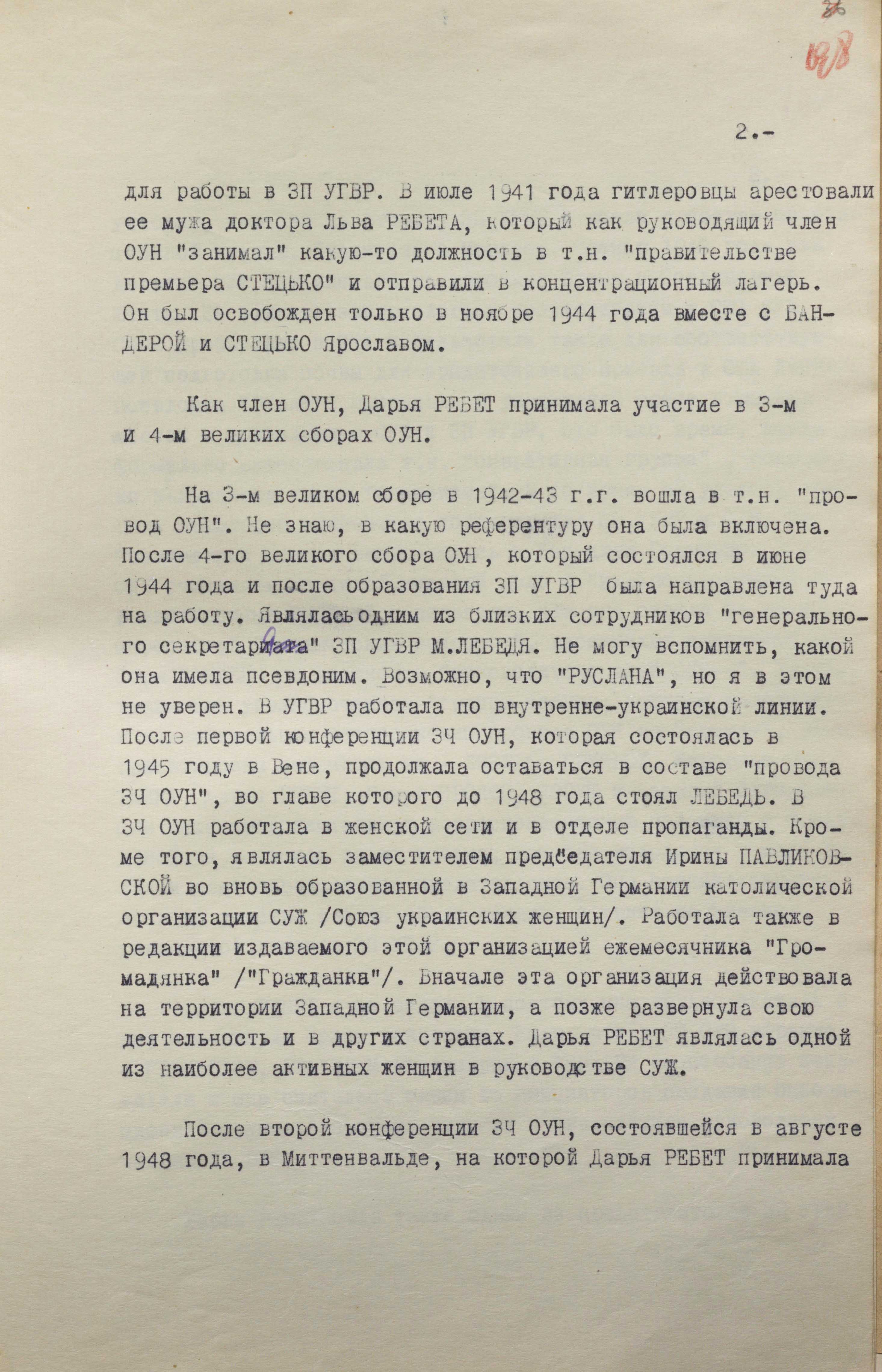 Про це в матеріалах справи зазначається таке: «У період перебування Бандери, Стецька, Ребета Л. та інших лідерів ОУН в ув’язненні (середина 1941 – листопад 1944 р.) Ребет Дарія спільно з Лебедем М., а потім Шухевичем Р. керувала антирадянською діяльністю центрального “проводу” ОУН і була одним із організаторів УГВР… За рішенням президії УГВР серед інших лідерів ОУН-УГВР виїздить до Братислави, а потім до Відня, одержавши від Шухевича Р. повноваження керувати всією організаційною роботою ОУН за кордоном» (ГДА СЗР України. – Ф. 1. – Спр. 13089. – Арк. 221).
