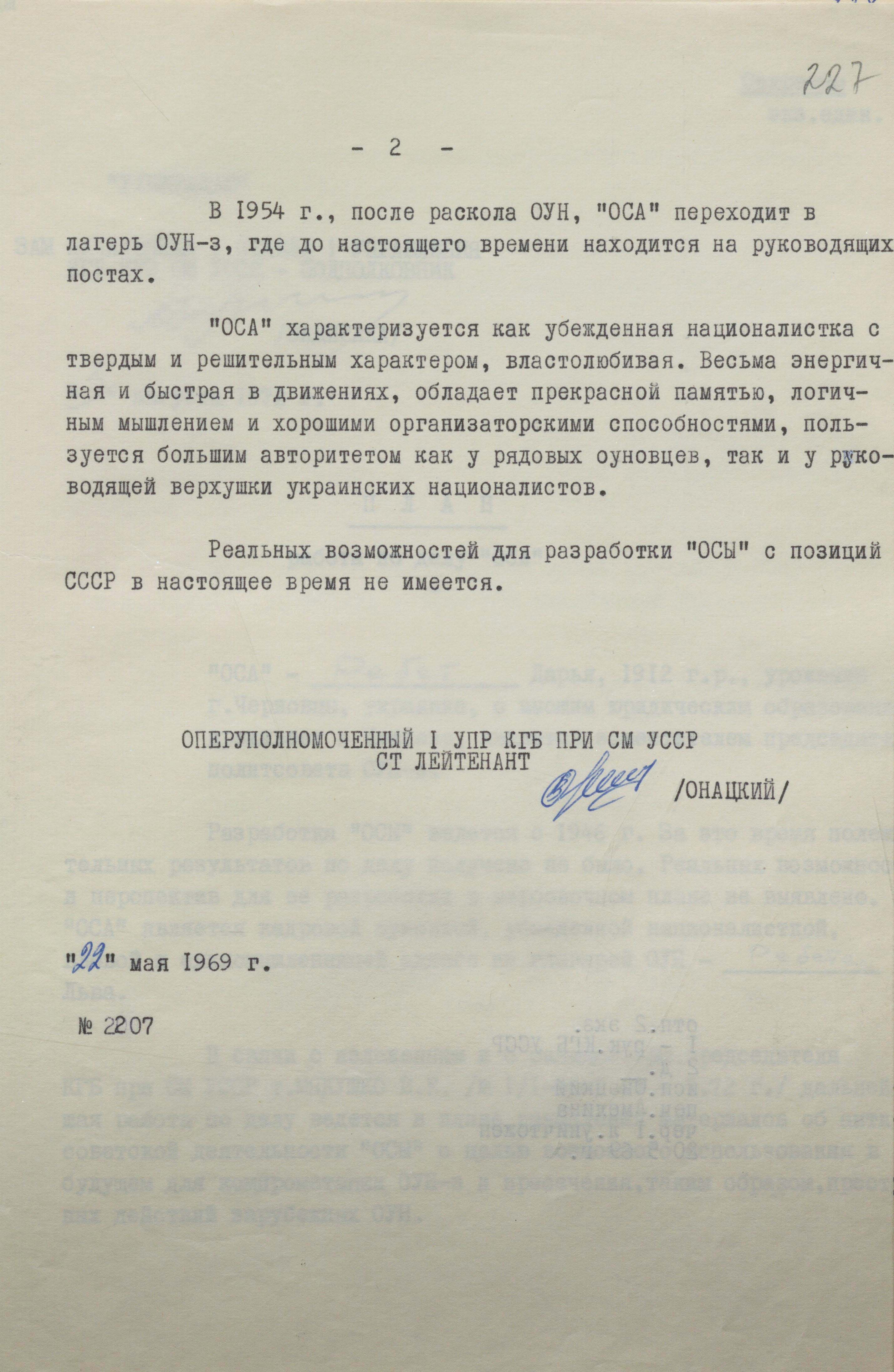 «”Оса” характеризується як переконана націоналістка з твердим і рішучим характером, владолюбна. Доволі енергійна і швидка в рухах, має чудову пам’ять, логічне мислення і хороші організаторські здібності, великий авторитет і серед рядових оунівців, і керівної верхівки українських націоналістів» (ГДА СЗР України. – Ф. 1. – Спр. 13089. – Арк. 227).