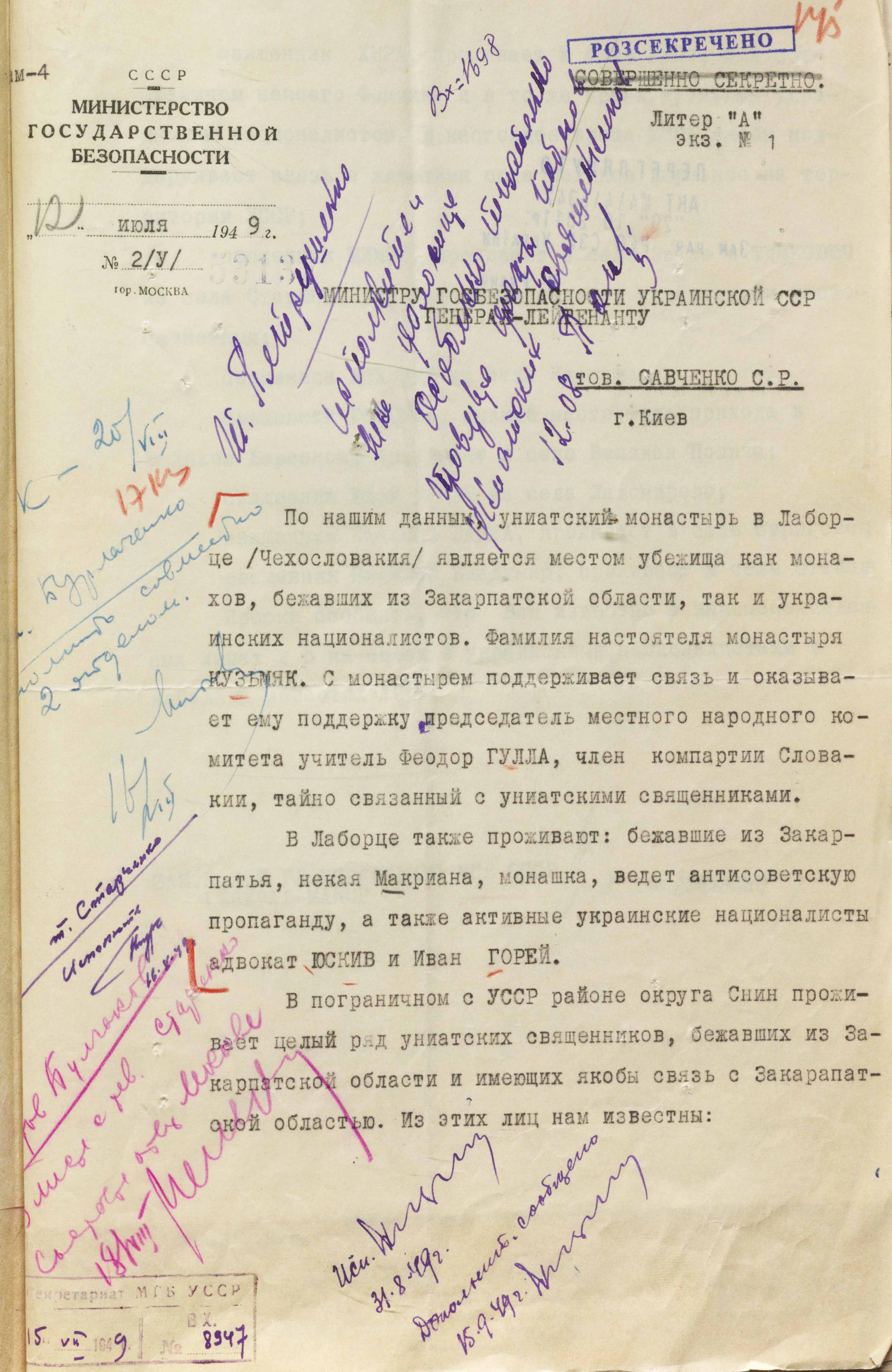 На початку 1947 року мдб урср завело агентурно-спостережну справу під назвою «УГКЦ за кордоном». У постанові про заведення справи зазначалося, що «уніатська греко-католицька церква під керівництвом Ватикану веде антирадянську діяльність в інтересах міжнародної реакції й підлягає розробці». Водночас органи мдб урср не обмежилися лише збиранням інформації та спостереженням за тим, як діють парафії ГКЦ за кордоном. Унаслідок встановлення тісних контактів з органами безпеки країн соціалістичного табору розроблялися спільні плани з впровадження агентури в духовне середовище, оцінювання ситуації на місцях і можливостей скликання псевдособорів на кшталт Львівського, щоб знищити греко-католицьку церкву так само на європейських теренах.