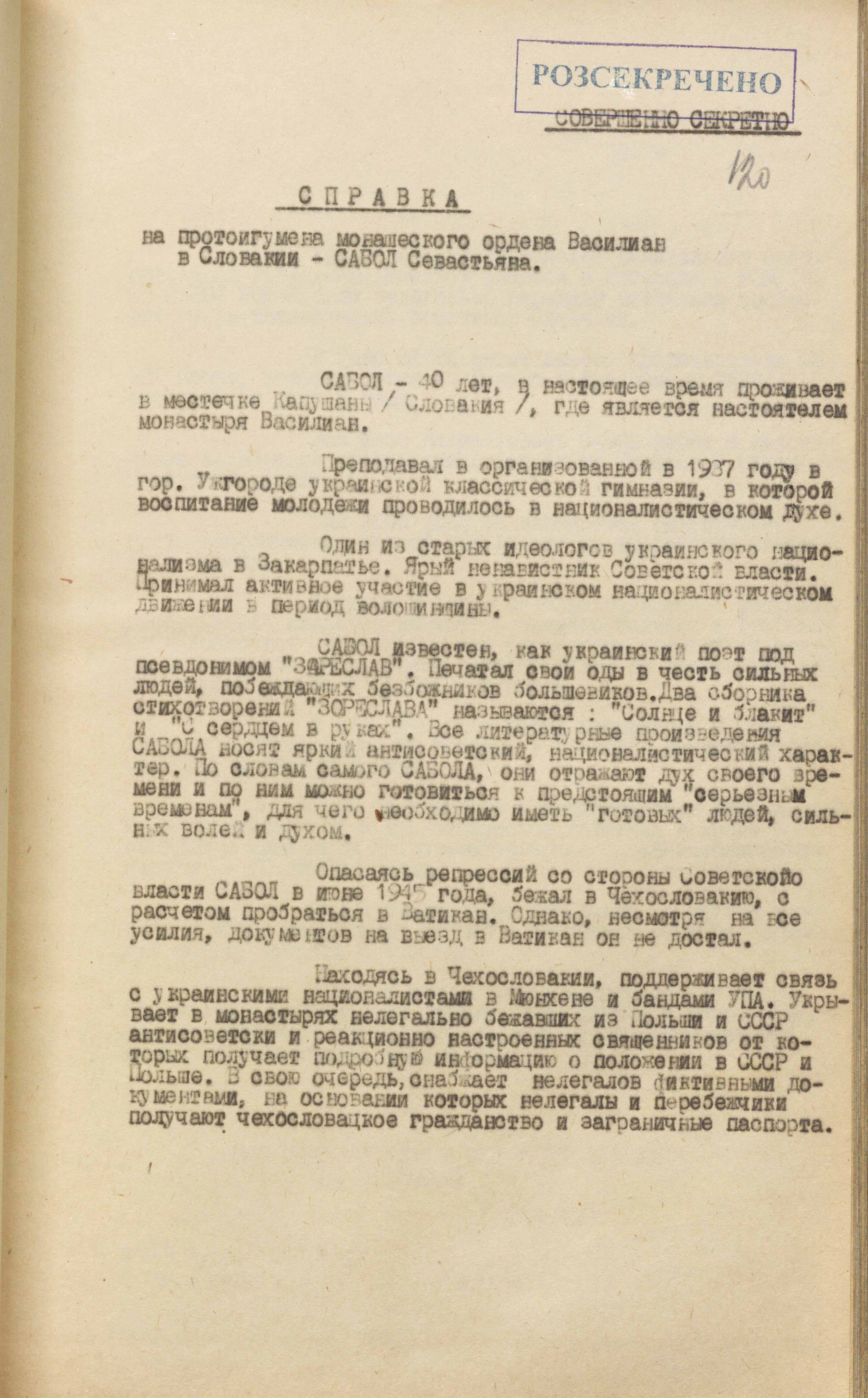 Також встановлено, що значну роль в антирадянській українській націоналістичній діяльності греко-католицького духовенства в Чехословаччині відіграє настоятель монастиря монашого ордену “Василіан” у м. Требишеві протоігумен Севастіян Сабол, який має велику підтримку у Ватикана. Сабол – один із ідеологів українського націоналізму, в Закарпатті відомий як поет (літературний псевдонім Зореслав), непримиренний ненависник Радянського Союзу. Він брав активну участь в українському націоналістичному русі на Закарпатті у період волошинщини. Після окупації угорцями Закарпатської України емігрував до Словаччини. Підтримує нелегальний зв’язок із греко-католицьким духовенством Закарпатської області і єпископом Ромжею, якому пересилає листи і директивні вказівки з Ватикану. У своєму монастирі він переховує бандерівців, забезпечує їх документами і переправляє за межі Чехословаччини в різні країни, зокрема до Америки»