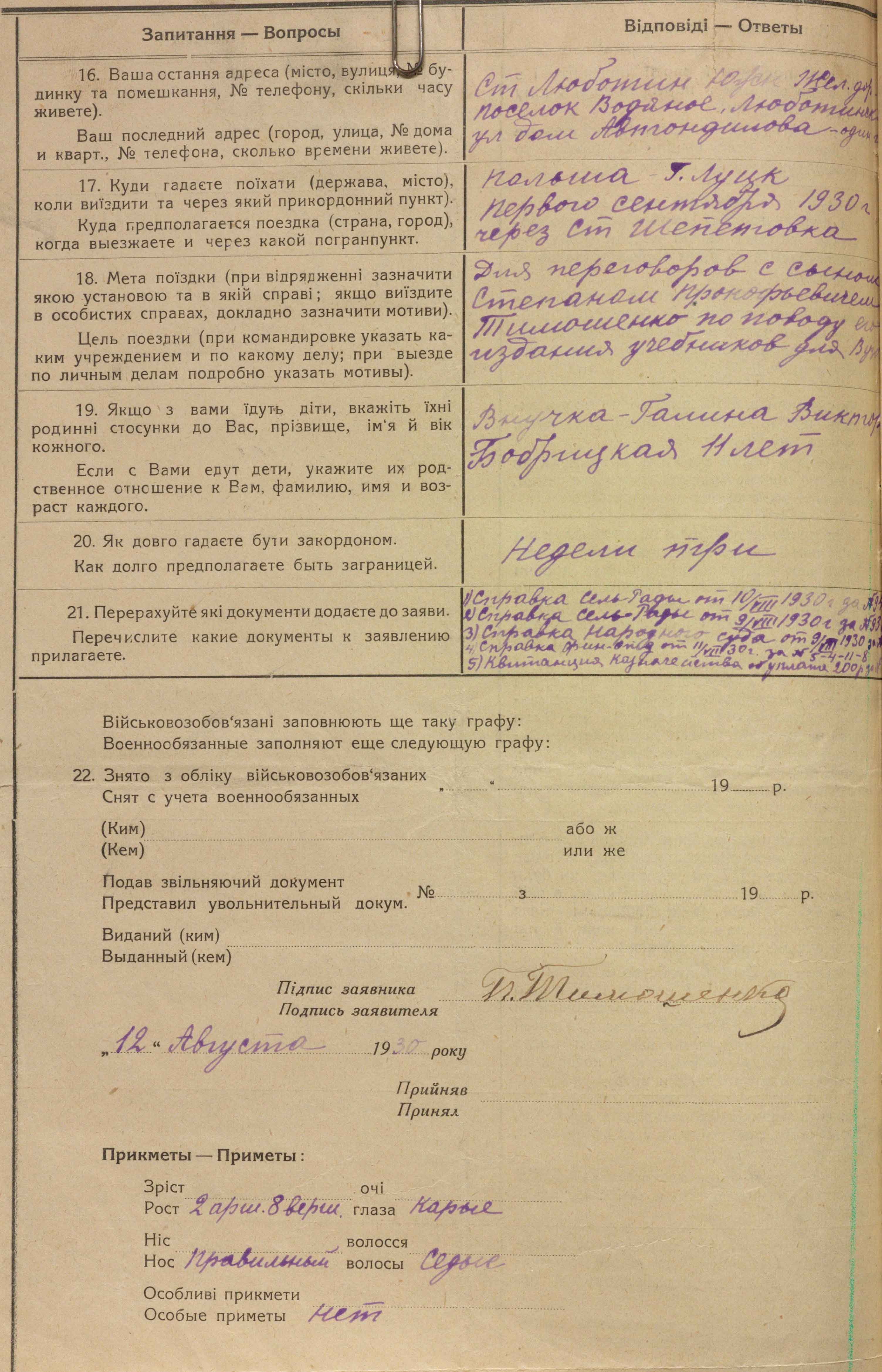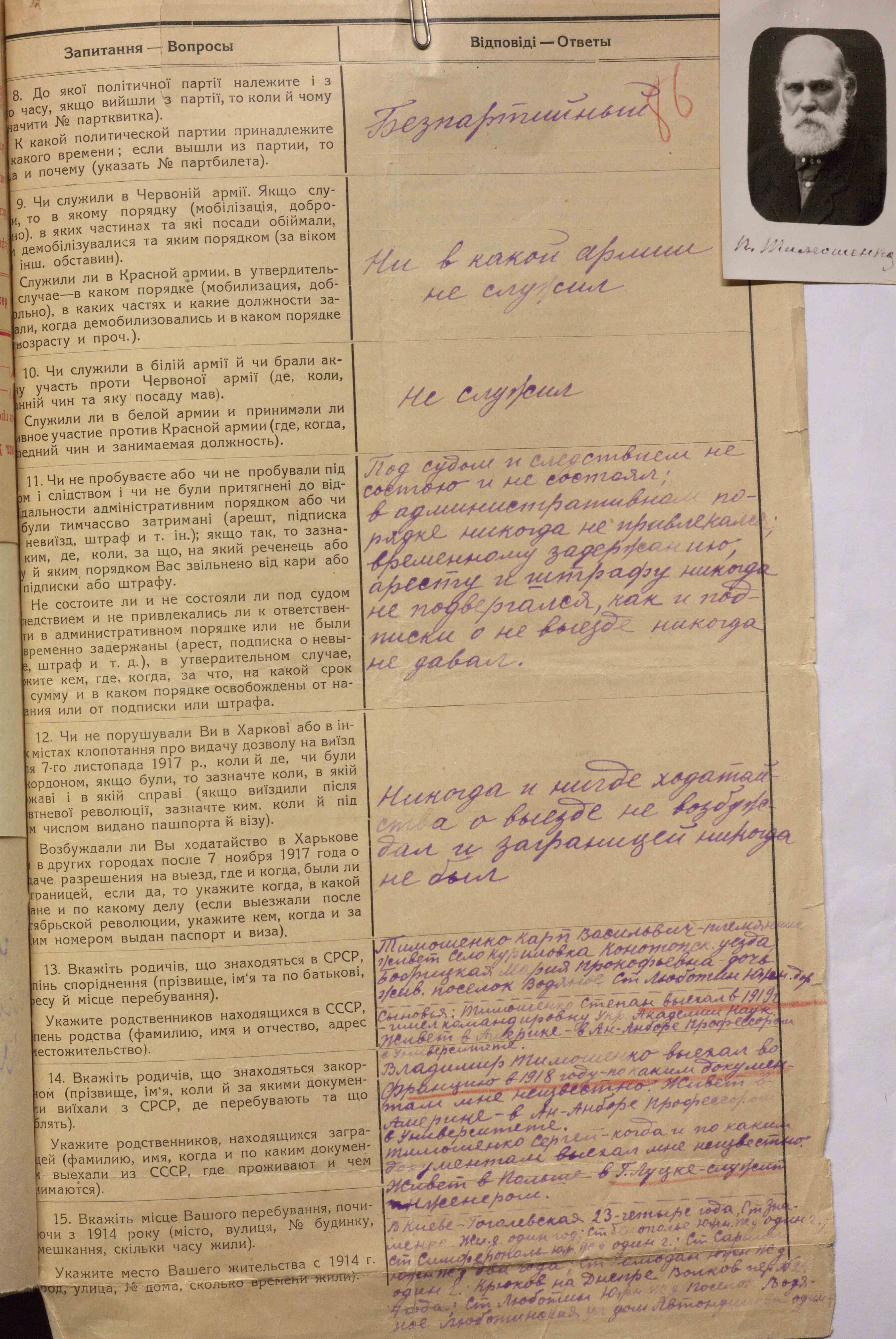 Як свідчать архівні документи, чекісти розшукали батька С. Тимошенка – Прокопа Тимофійовича. З’ясували, що він порушував клопотання перед радянською владою про отримання дозволу на поїздку за кордон до синів, але йому щоразу відмовляли. До справи долучена анкета і світлина батька, а також самого Сергія на груповому фотознімку.