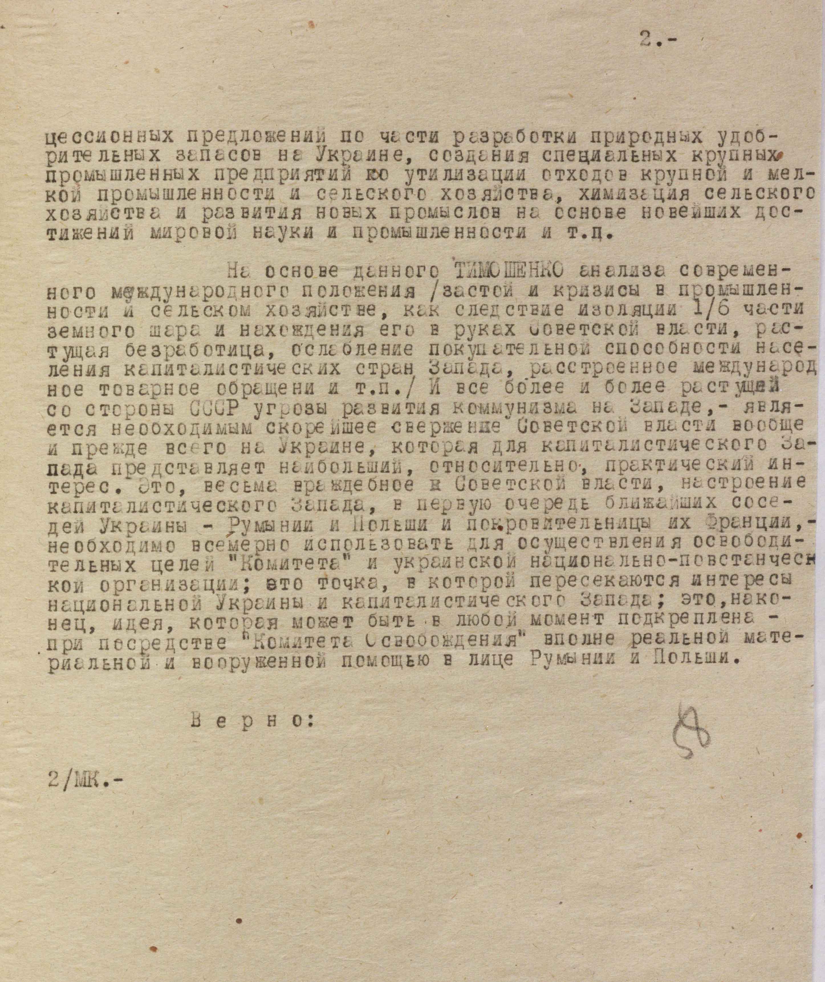 «Українська національна ідея загалом, – нібито говорив С. Тимошенко, – а особливо ідея звільнення України з-під влади більшовиків і створення незалежної Української національної дрібнобуржуазної республіки нині дуже популярна в широких громадських, політичних, урядових, кооперативних, промислових і фінансових колах капіталістичного Заходу. Ці кола співчувають визвольним національним прагненням українського народу і в потрібний момент готові надати йому реальну підтримку, а в подальшому – тісно з ним співпрацювати в галузі розвитку промисловості, сільського і народного господарства України, взагалі в справі максимального розвитку її виробничих сил. У розпорядженні «Комітету» є ціла низка доволі конкретних стосовно цього і солідних пропозицій з боку великих банків, акціонерних промислових і торговельних товариств, синдикатів, концесійних груп, культурно-промислових підприємств, авіаційних товариств; також є пропозиції великих сільськогосподарських об’єднань стосовно постачання до України хороших порід сільськогосподарських тварин, селекційного насіння, мінеральних добрив; є низка концесійних пропозицій на розробку природних запасів в Україні, створення великих промислових підприємств із утилізації відходів промисловості і сільського господарства, хімізації сільського господарства і розвитку нових галузей на основі новітніх досягнень світової науки та промисловості…»