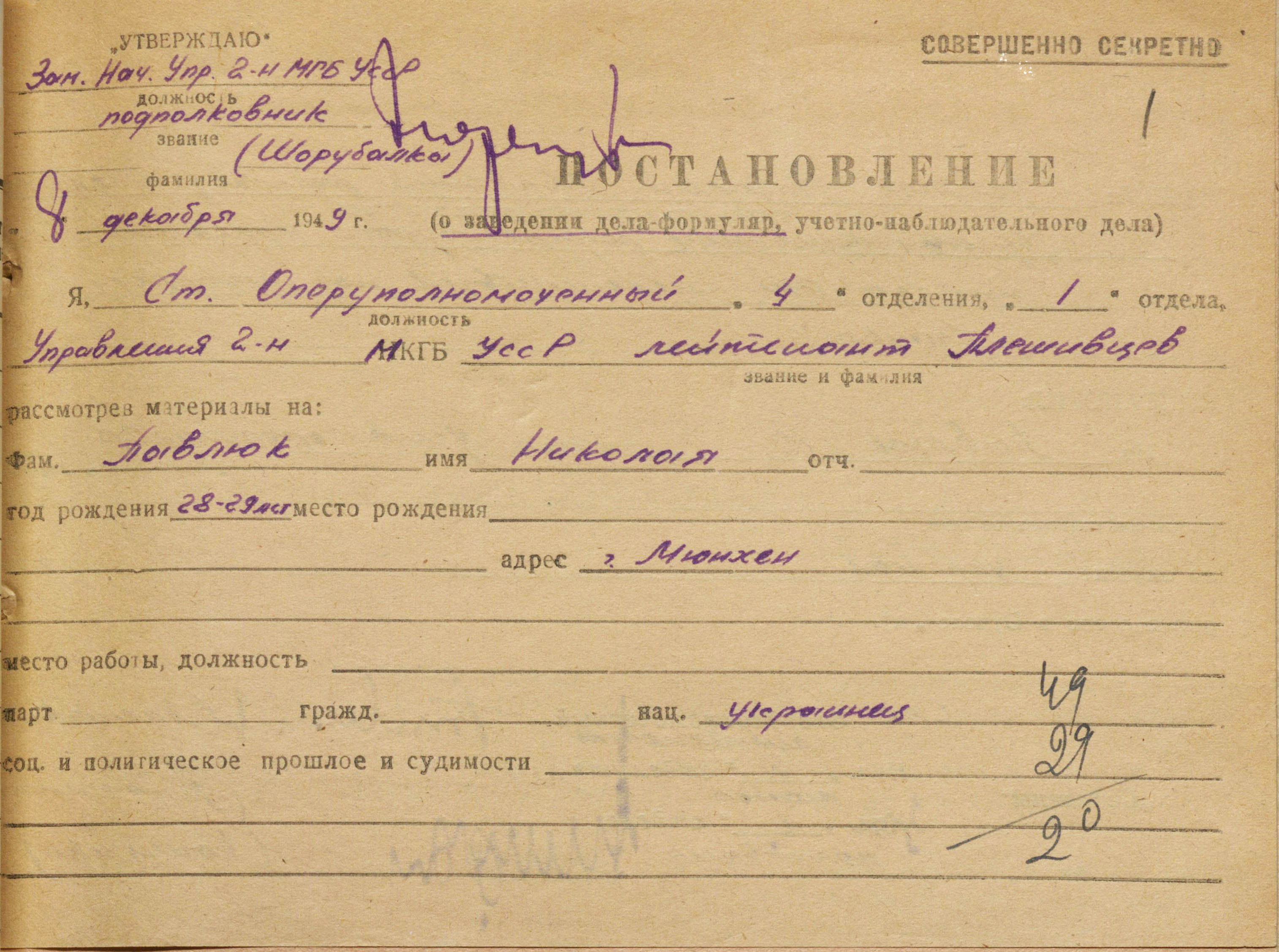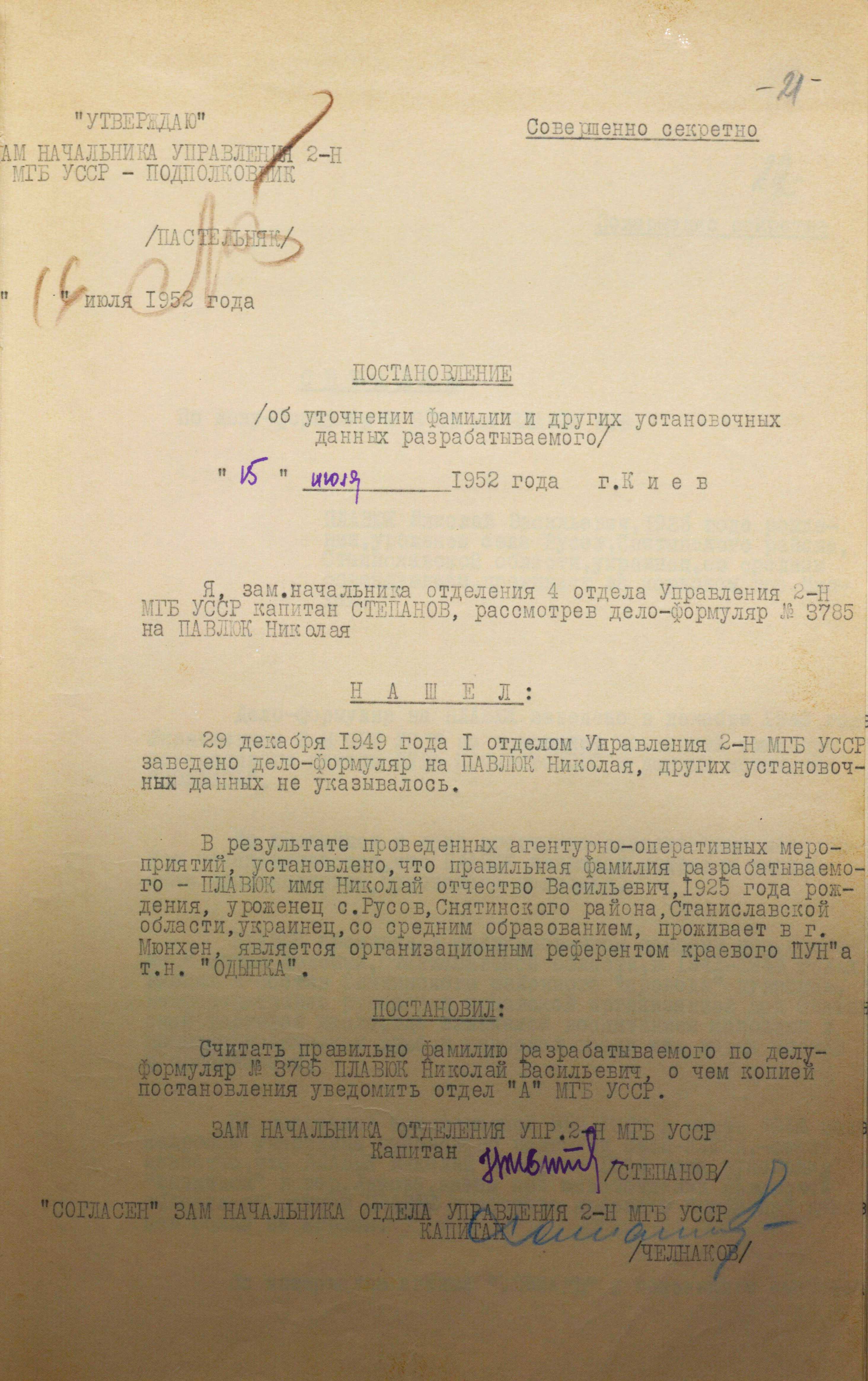 Наприкінці грудня 1949 року старший оперуповноважений управління 2-н (боротьба з українським підпіллям) мдб урср лейтенант Плєшивцев виніс постанову про заведення справи на Миколу Павлюка, керівника організаційної референтури крайового проводу ОУН-мельниківців, що мав умовне найменування «Одинка». У довідках, агентурних повідомленнях і протоколах допитів, які накопичувалися в справі у той період, ішлося про те, що цей М. Павлюк, приблизно 25 років, родом із села Русів у Східній Галичині (нині це Снятинський район Івано-Франківської області). У роки Другої світової війни нібито був керівником районного проводу ОУН у Снятині, активним членом «юнацтва» у Львові, у 1944 році виїхав до Німеччини, навчався і жив у Мюнхені.