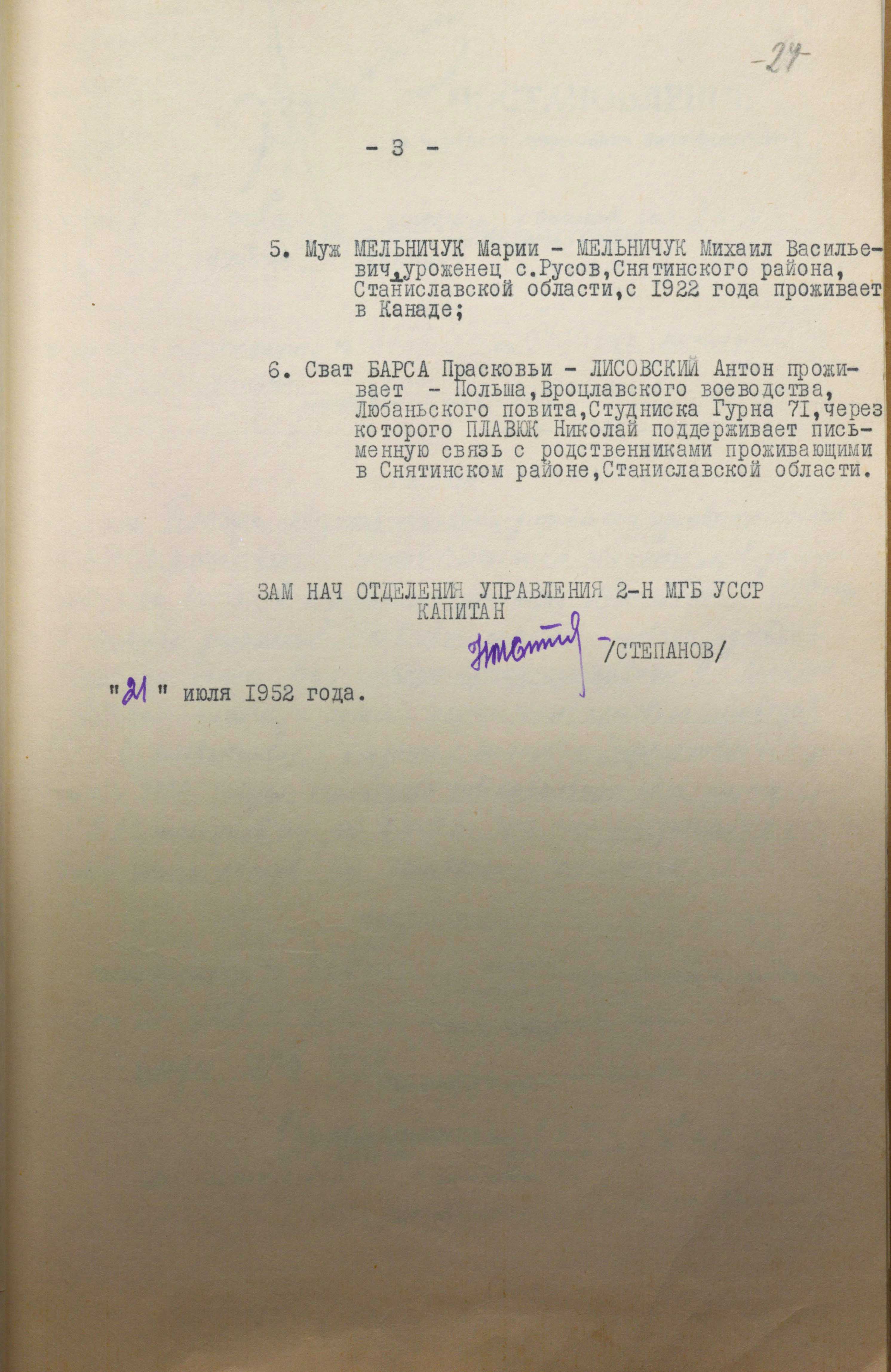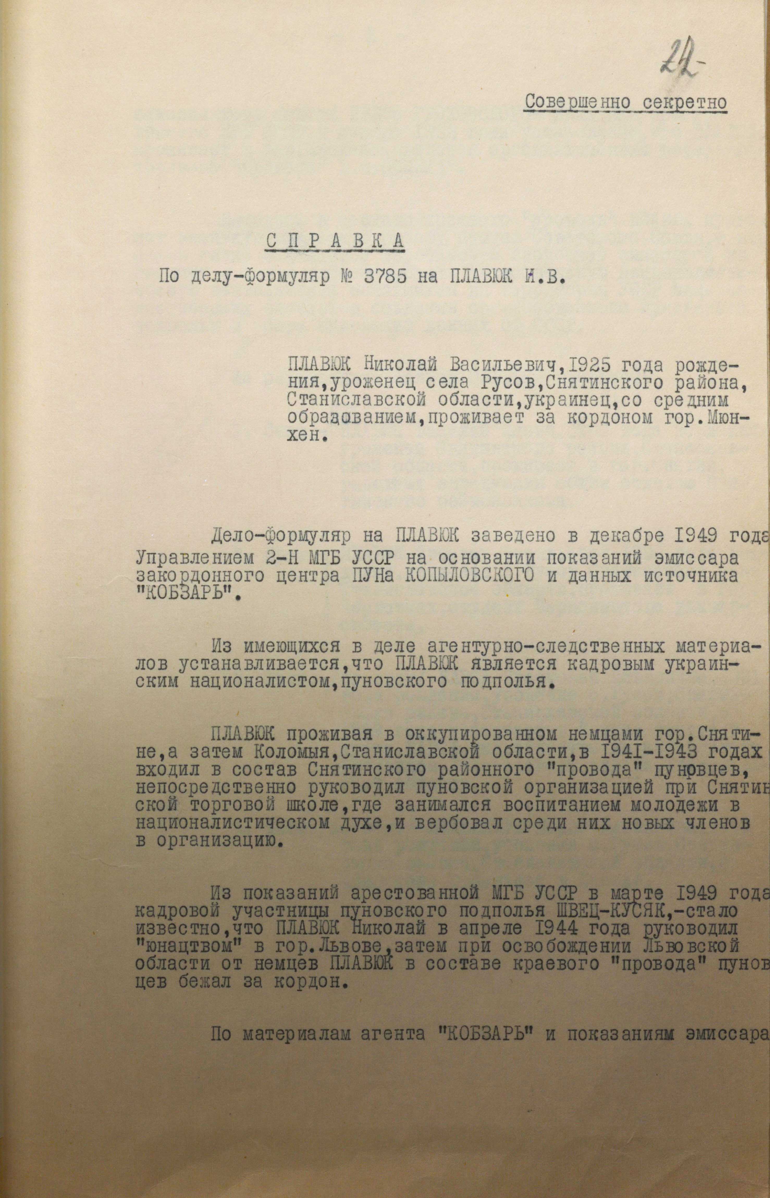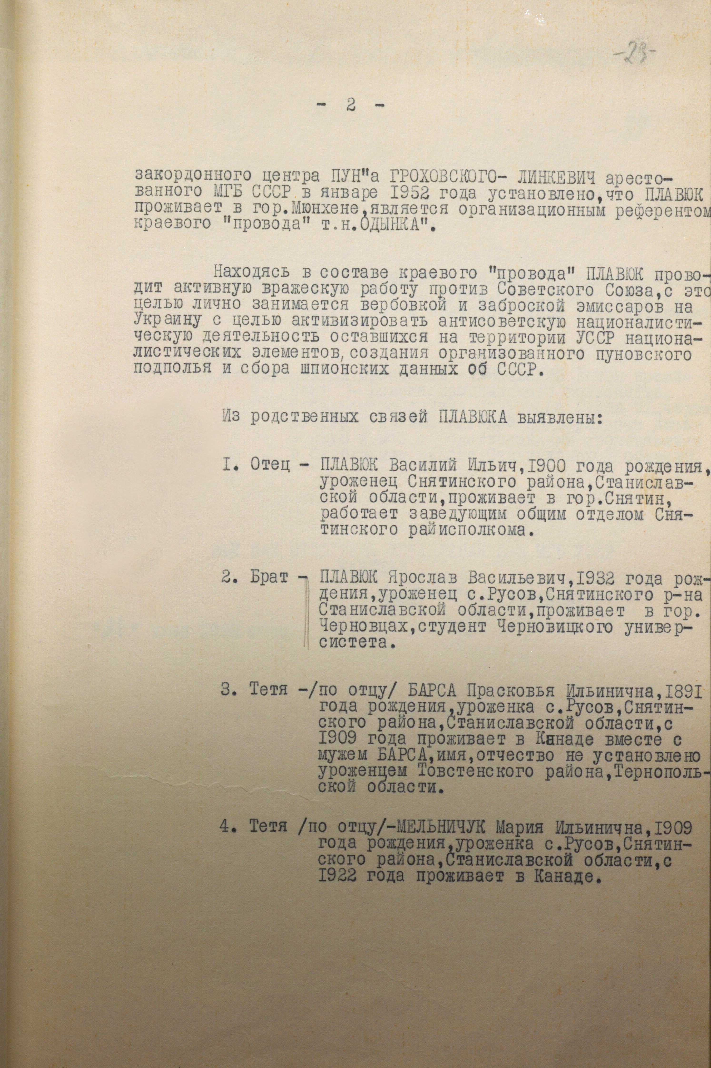Усі листи, які відправляли зі Снятина до Канади і які надходили звідти в урср, ще від початку 1950-х чекісти взяли на оперативний контроль. Їх зміст ретельно вивчали, а копії долучали до справи. То було листування побутового характеру, але й воно давало змогу збирати необхідну інформацію. У Снятині жив батько М. Плав’юка Василь, який працював завідувачем загальним відділом Снятинського райвиконкому. Брат Ярослав був першим секретарем райкому комсомолу. А в Канаді жили мама Василя Плав’юка і дві рідні сестри.