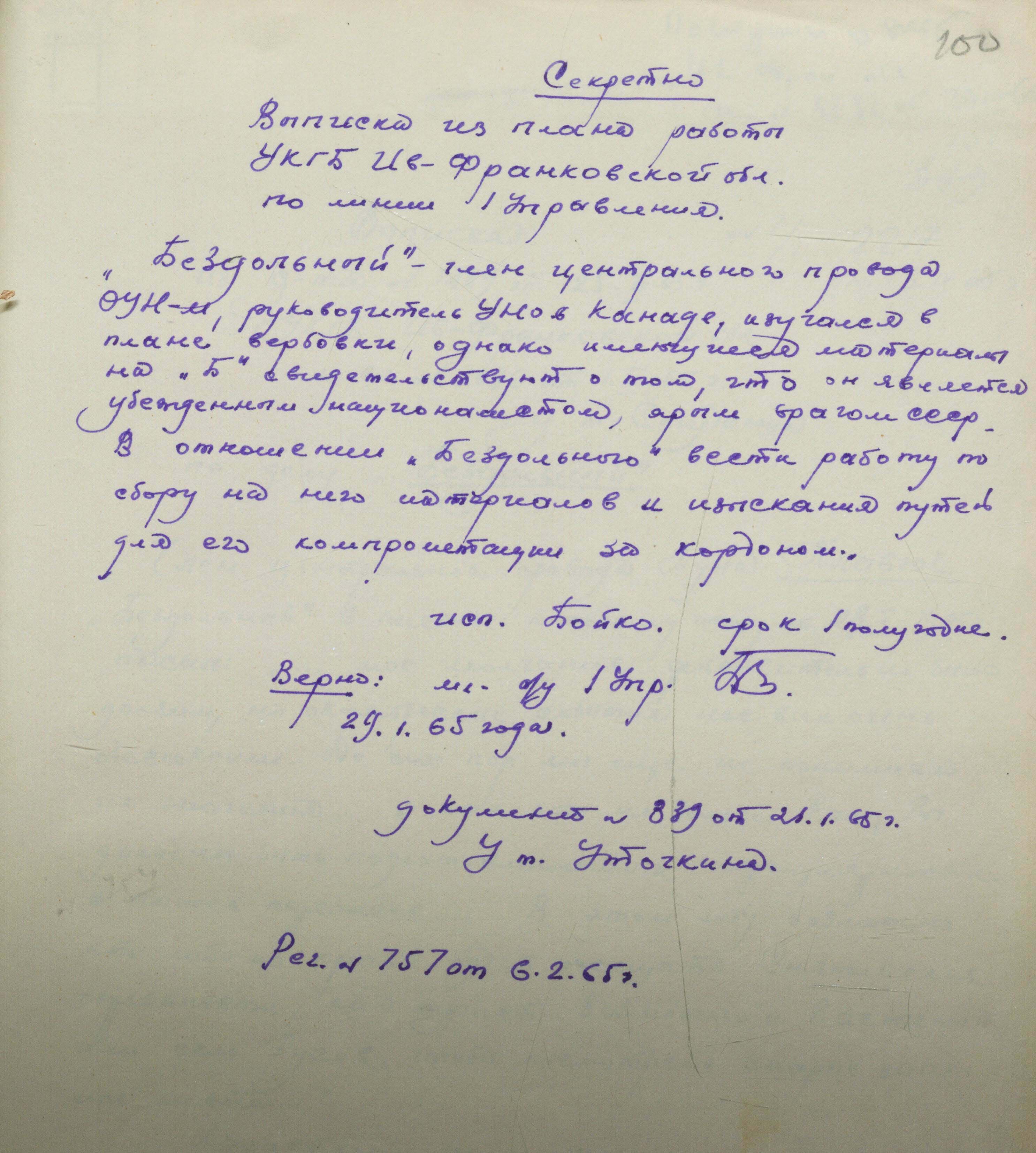 В одному з документів, датованих лютим 1965 року, зазначається: «Бездольний» – член центрального проводу ОУН-м, керівник УНО в Канаді, вивчався в плані вербування, однак наявні матеріали на «Б» свідчать про те, що він є переконаним націоналістом, злісним ворогом срср. Стосовно «Бездольного» вести роботу зі збирання на нього матеріалів і відшукування шляхів для його компрометування за кордоном» (ГДА СЗР України. – Ф. 1. – Спр. 15161. – Т. 1. – Арк. 100).