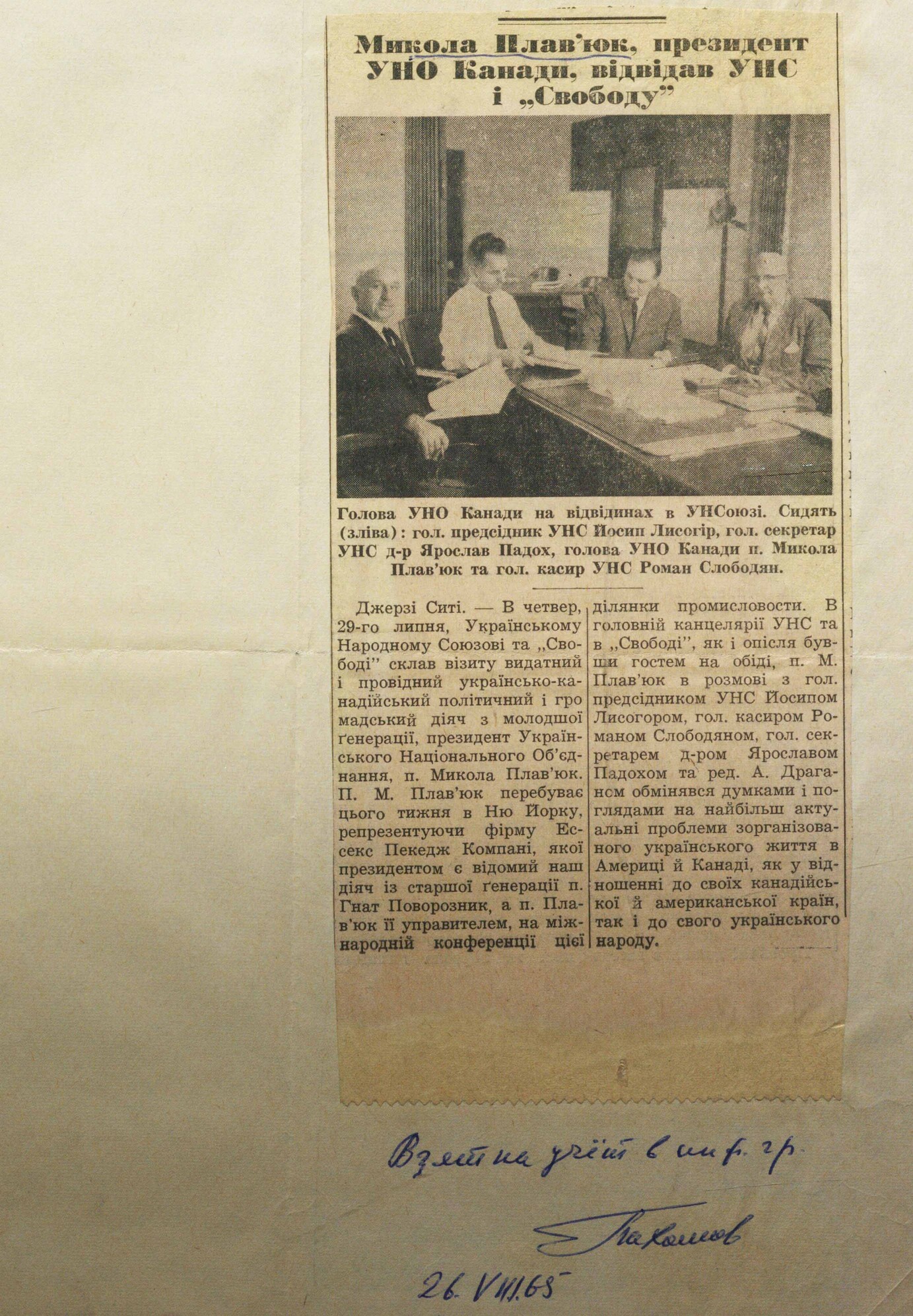 Одну з підстав для компрометування знайшли у травні 1967 року. Тоді, як свідчать архівні документи, М. Плав’юк відвідав США як віцепрезидент Комітету українців Канади (КУК) і член підготовчої комісії з проведення СКВУ. Під час виступу у Філадельфії він заявив, що «діячі урср за наказом з москви вживають заходів для розкладання, послаблення і знищення українців у еміграції, еміграція не може жити без України, відірваною від неї. Зв’язки повинні бути! Але потрібно відділити режим окупації від народу…» (ГДА СЗР України. – Ф. 1. – Спр. 15161. – Т. 2. – Арк. 299).