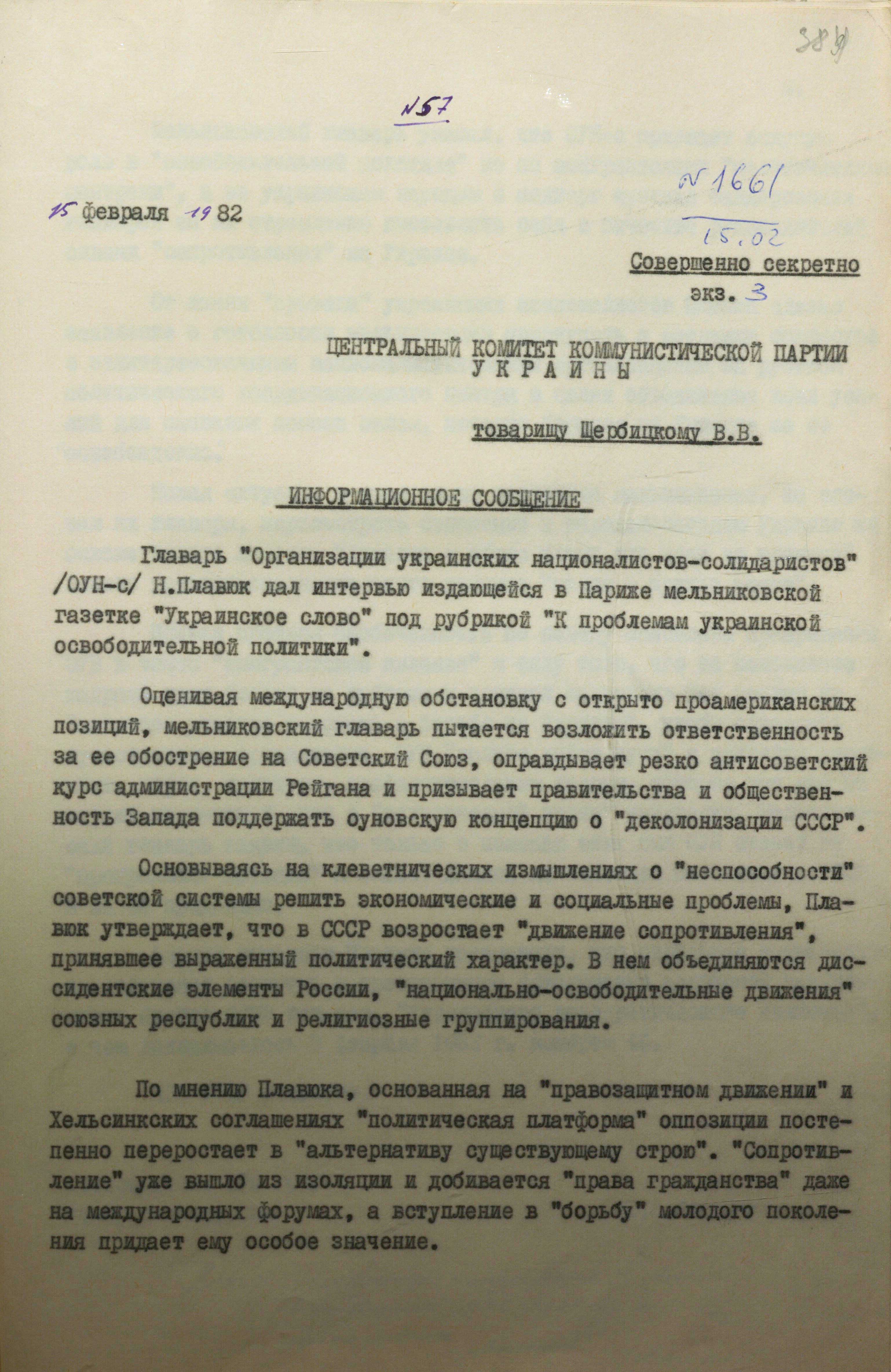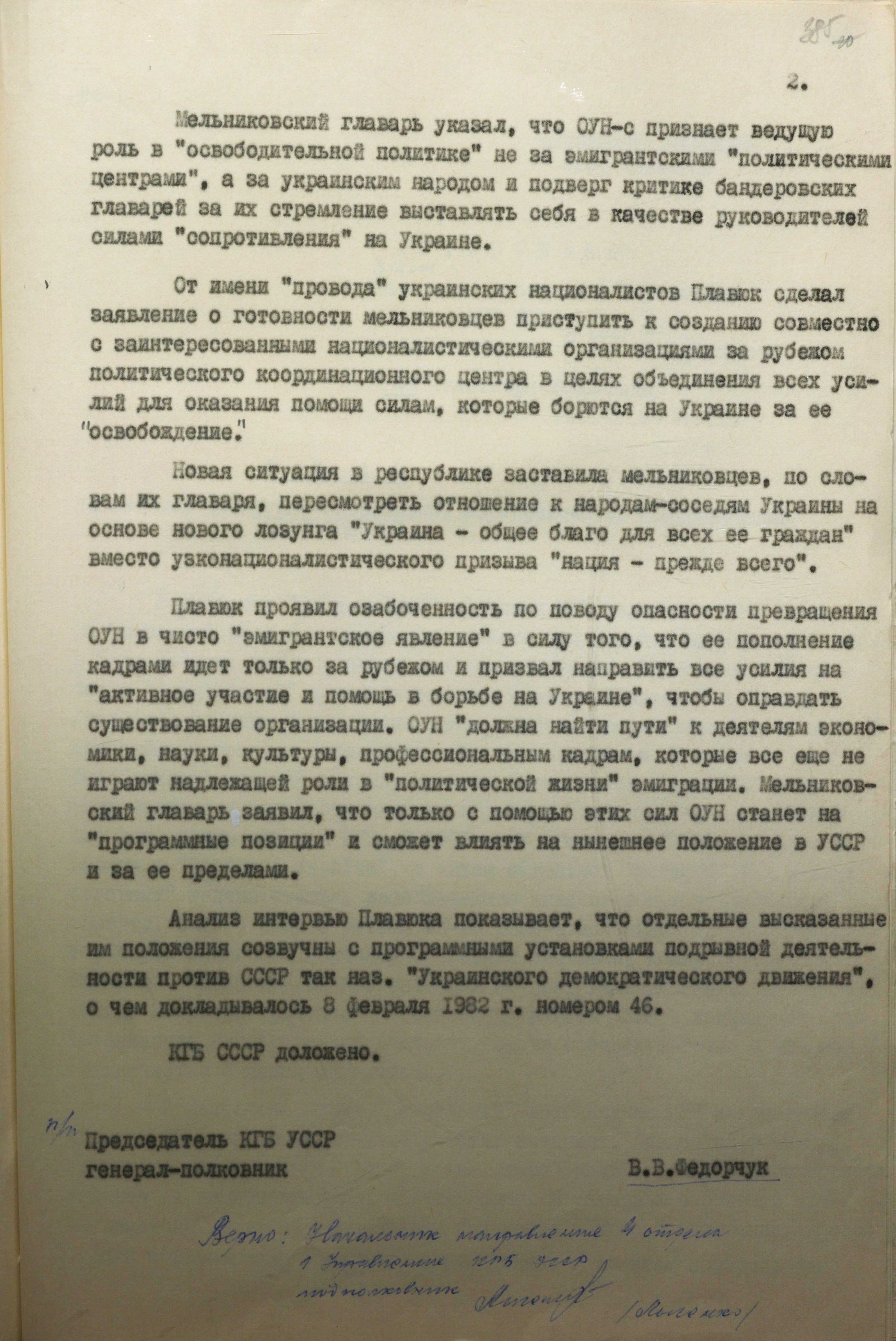 Планом заходів також передбачалося направлення на адресу М. Плав’юка листа, в якому містилися б фрази, підозрілі на нібито поновлення з ним конспіративного зв’язку радянськими спецслужбами. У подальшому зміст такого листа якимось чином планували довести до відома представників бандерівської течії ОУН за кордоном, щоб ті зі свого боку розгорнули пропагандистську кампанію зі звинуваченнями проти нього.