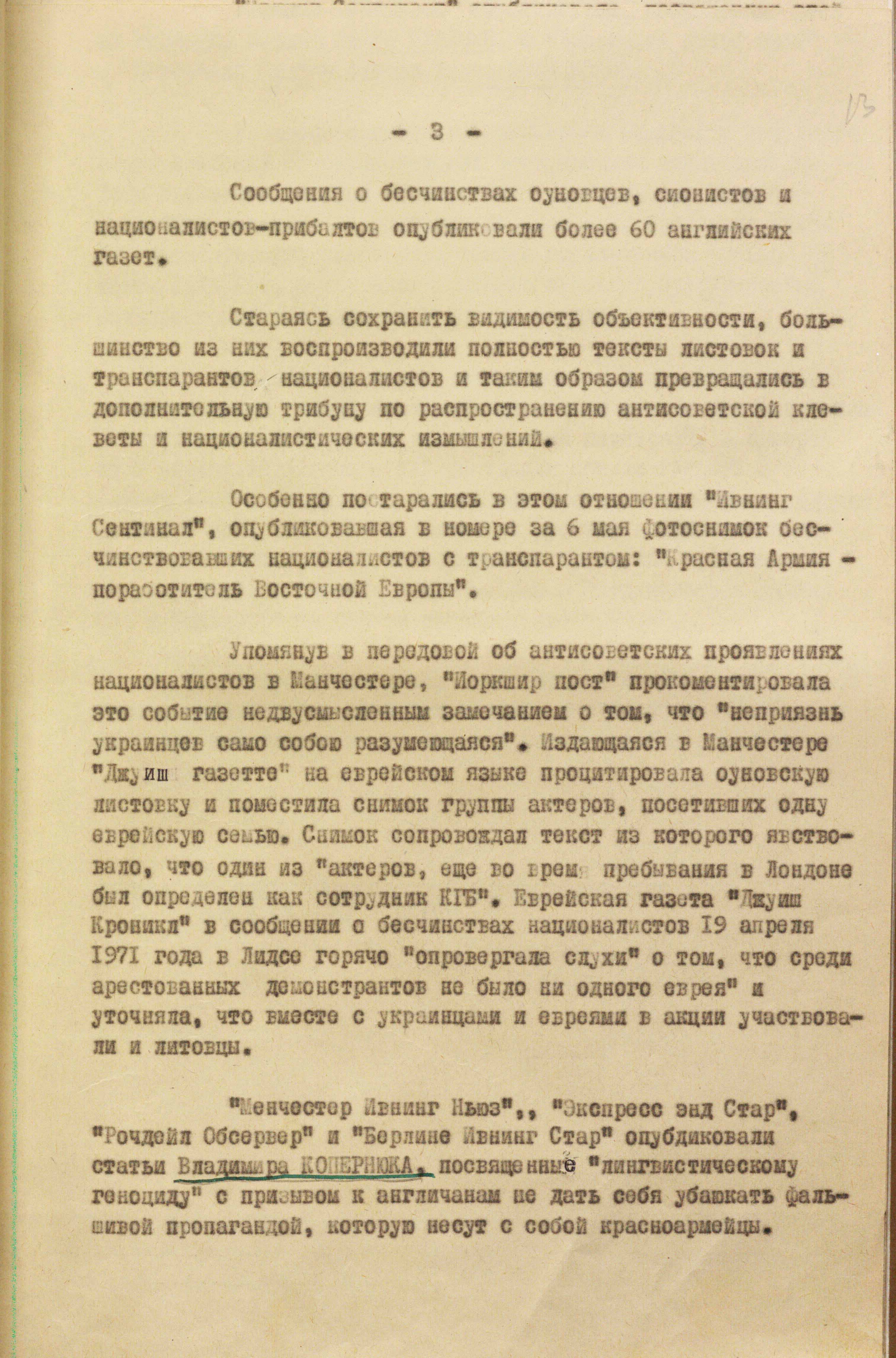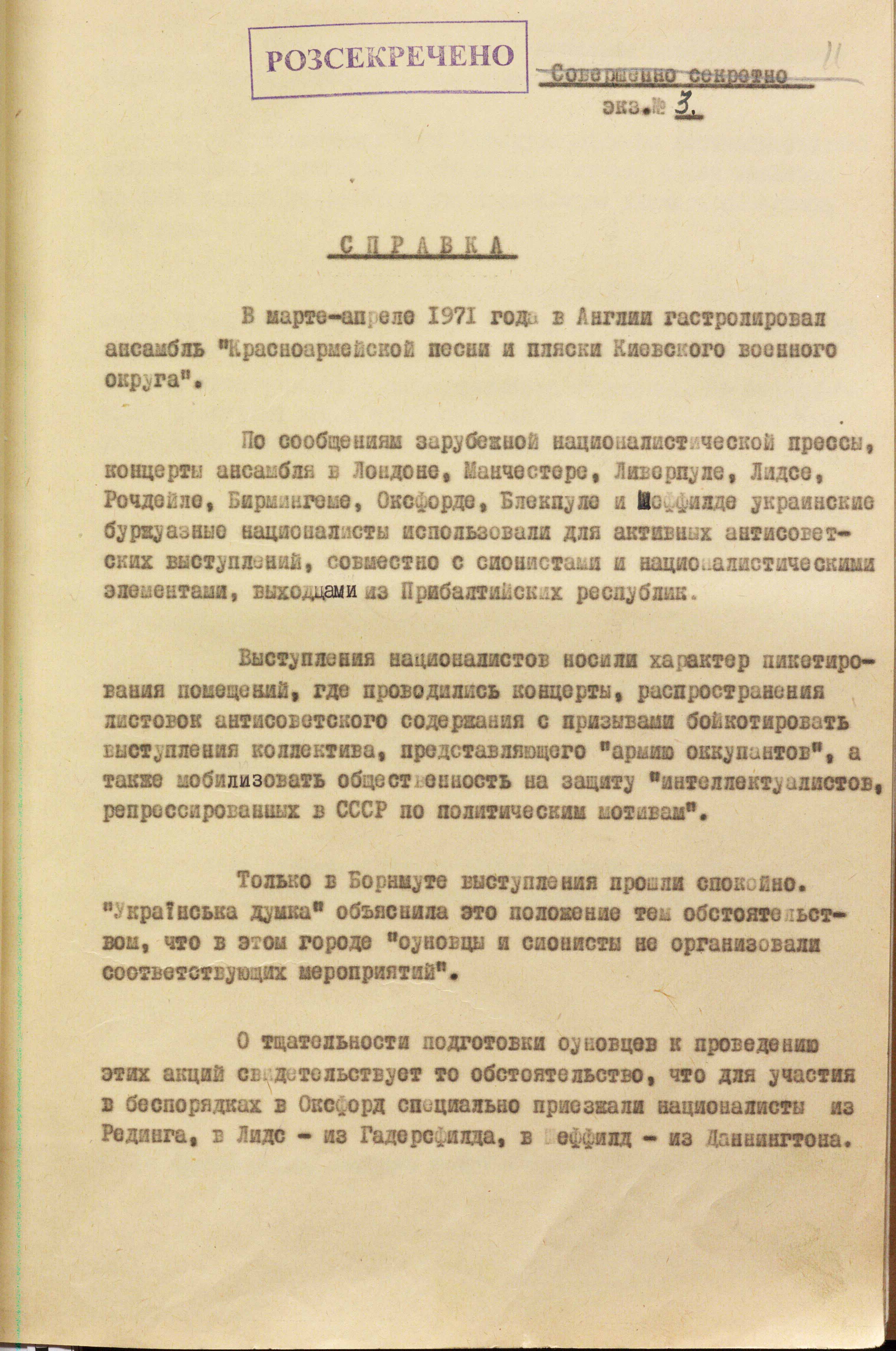 У довідці кдб при раді міністрів урср ідеться про те, що в березні–квітні 1971 року у Великій Британії гастролював ансамбль пісні і танцю Київського військового округу. Але гастролі були затьмарені численними акціями протесту практично в усіх містах – Лондоні, Манчестері, Ліверпулі, Лідсі, Рочдейлі, Бірмінгемі Оксфорді, Блекпулі та Шеффілді. При цьому у протестах брали участь не лише представники українських організацій, а й країн Балтії та інших.