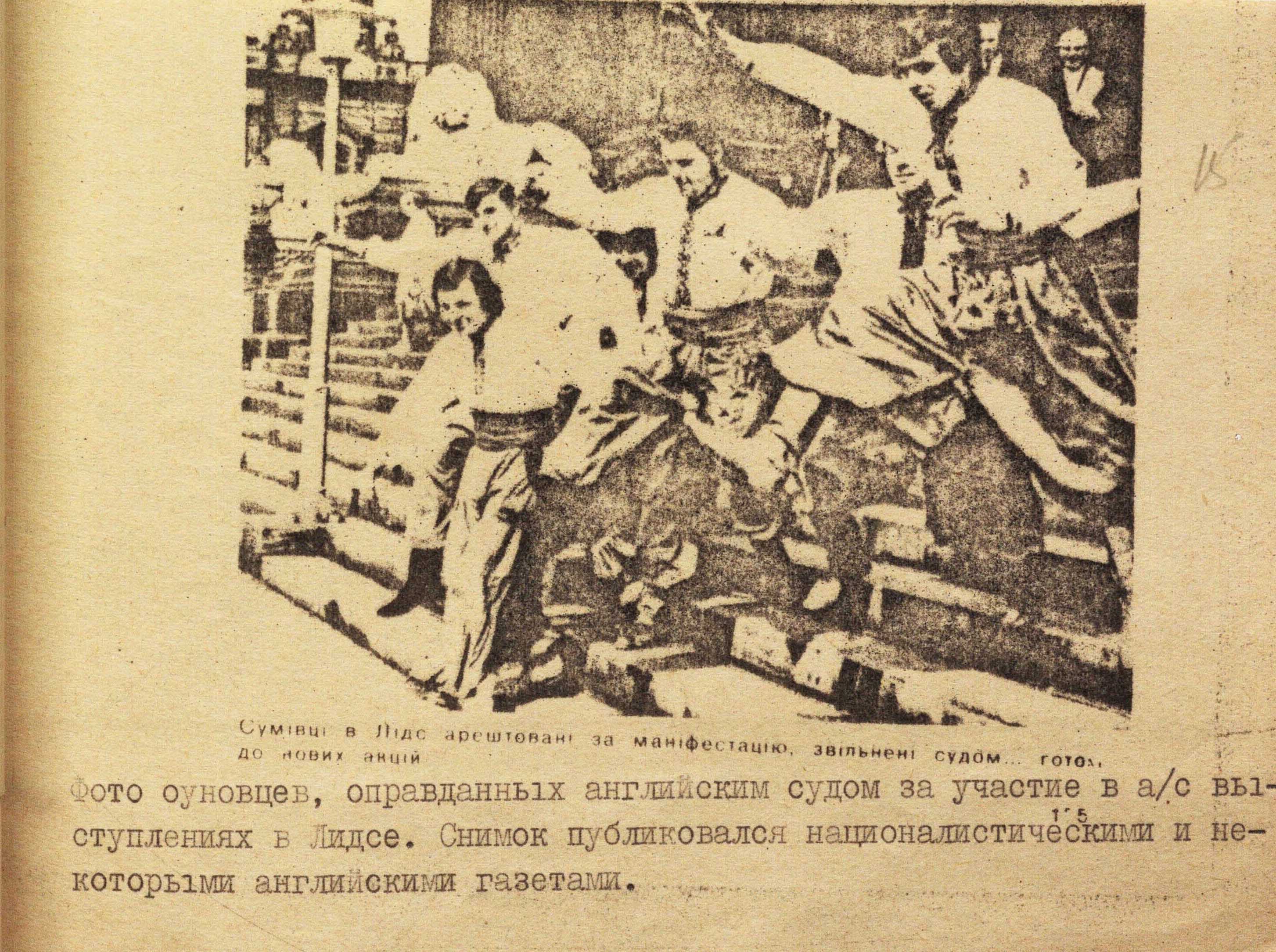 У Лідсі за активну участь у протестах було заарештовано 10 членів СУМу. У довідці зазначається, що невдовзі вони були виправдані судом і звільнені. З-поміж документів зберігається вирізка з української емігрантської газети зі світлиною, на якій зображені звільнені юнаки в національному одязі. Повідомляється, що цю світлину опублікували кілька британських газет. А загалом констатується, що «повідомлення про безлади оунівців, сіоністів та націоналістів-прибалтів опублікували понад 60 англійських газет».