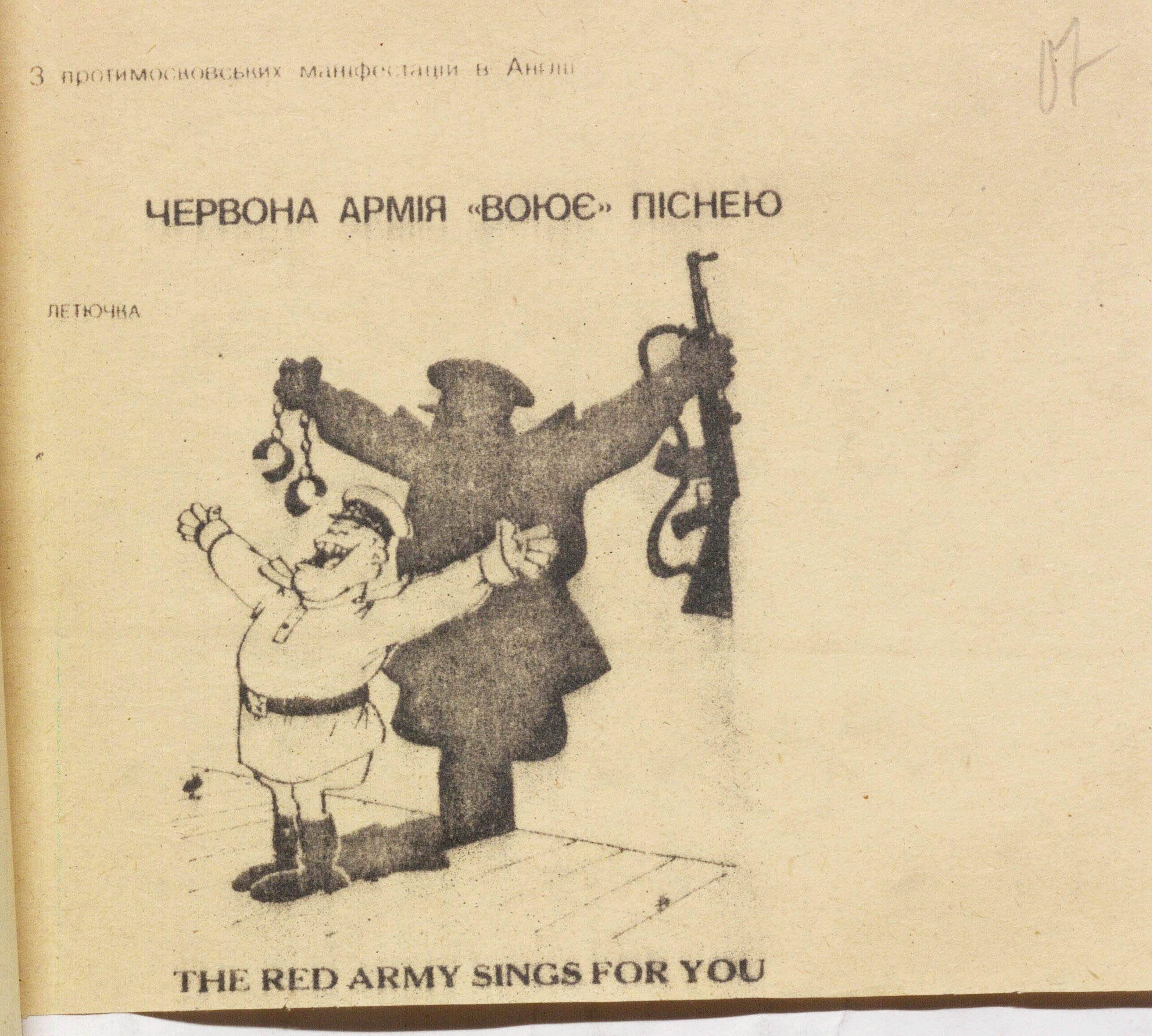 Під час протестних акцій поширювалася летючка з написом «червона армія «воює» піснею» і відповідною карикатурою (зберігається серед документів). Нарівні з цим у справі зберігається марка Антибільшовицького блоку народів на цю саму тему, на якій зображено червоноармійця, чобіт якого стоїть на карті Європи, а багнет спрямований у бік Німеччини та Франції.