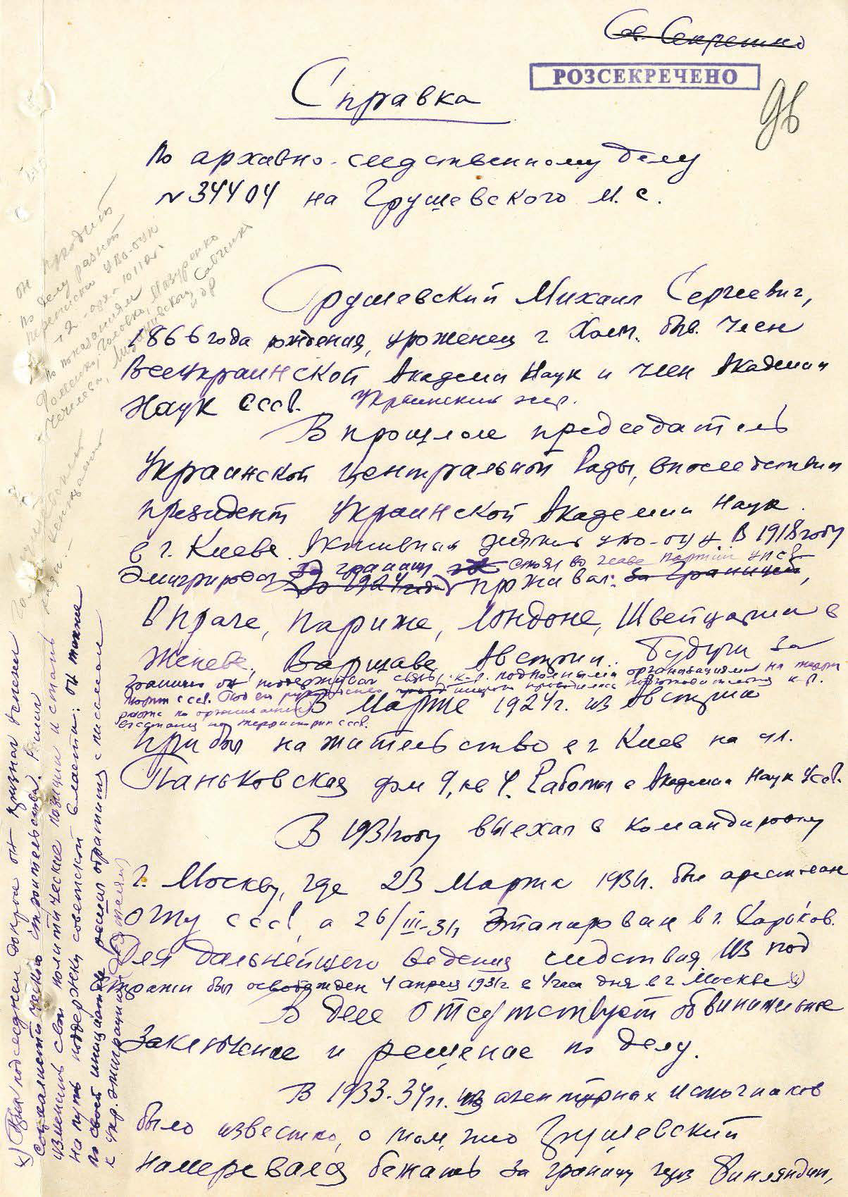 У довідці коротко викладалася біографія академіка, зокрема йшлося про еміграцію і повернення у 1924 року до Києва, подальший виїзд до москви, обставини арешту та слідства. Згадувалося, що в матеріалах справи є власноручні покази доньки М. Грушевського Катерини про арешт батька і його перебування у москві під наглядом нквс. Про обставини смерті зазначалося таке: «Помер Грушевський у другій половині 1934 року, де невідомо. Похований у м. Києві на Байковому цвинтарі» (ГДА СЗР України. – Ф. 1. Спр. 6760. – Т. 1. – Арк. 96–97). Наприкінці довідки надавалася інформація про близьких родичів і адресу мешкання дружини М. Грушевського з донькою Катериною в Києві на вул. Паньківська, 9, кв. 4.