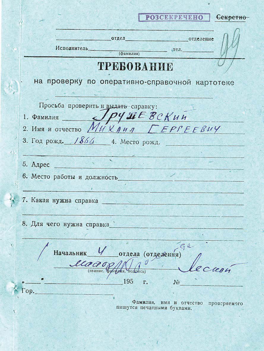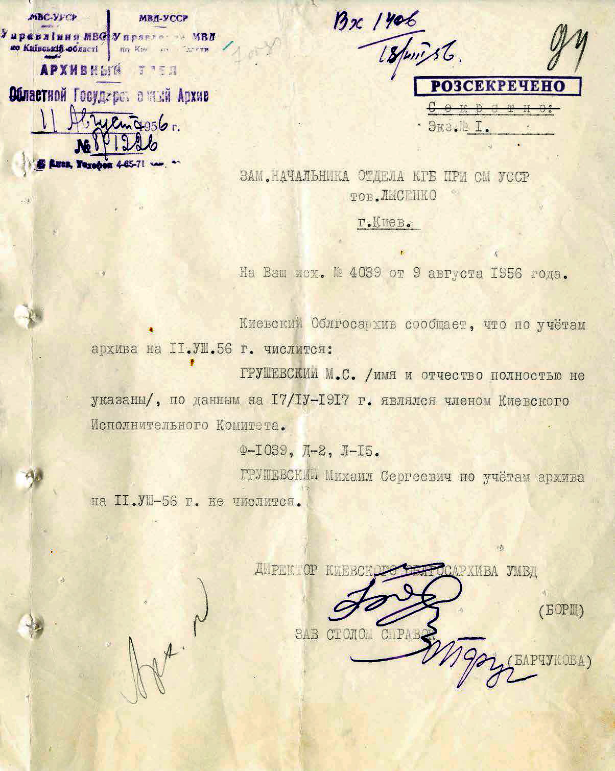 В одній із відповідей на запит зазначалося, що Грушевський Михайло Сергійович, 1866 року народження, уродженець м. Холм, жив у м. Києві, професор-історик. Проходив за справою-формуляром дпу усрр № 1732 за 1924 рік із забарвленням «Український націоналіст». Справа перебуває в архіві кдб урср, № 27031 (ГДА СЗР України. – Ф. 1. Спр. 6760. – Т. 1. – Арк. 100). В іншій ішлося про те, що він був заарештований дпу усрр за ст. 54–6 кримінального кодексу усрр, слідча справа без номера, рішення у справі немає, оскільки він під час слідства помер. Справа зберігається в архіві кдб урср за № 34404 (ГДА СЗР України. – Ф. 1. Спр. 6760. – Т. 1. – Арк. 99–99 зв.).