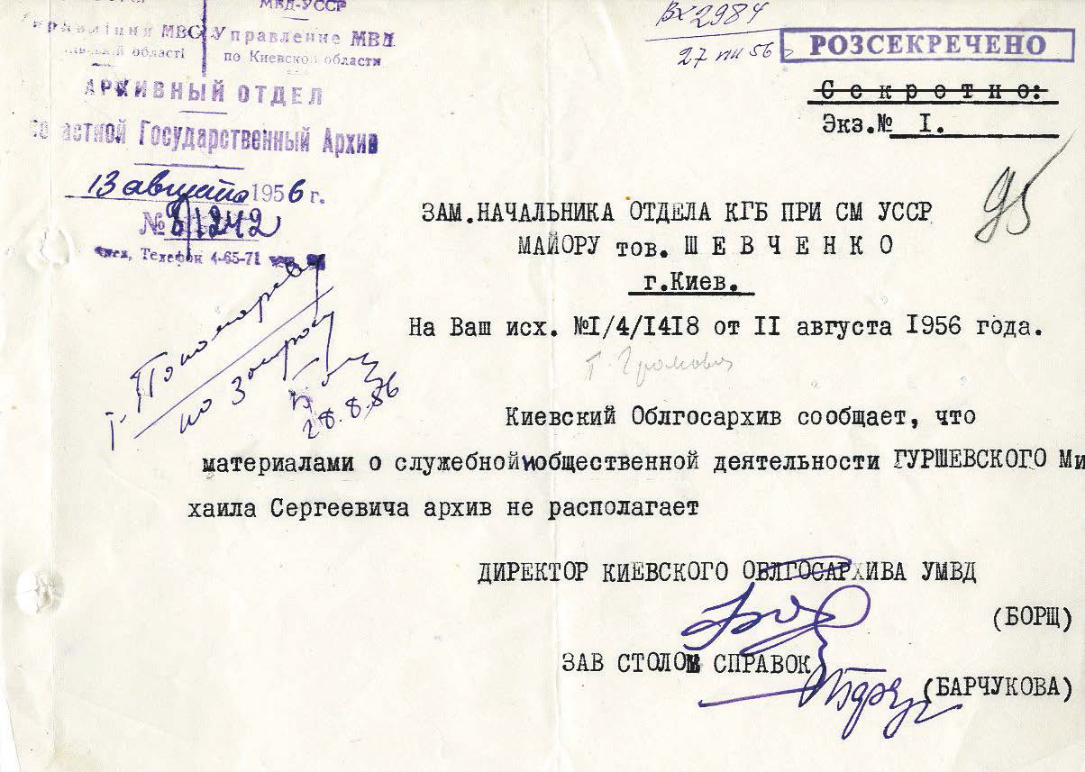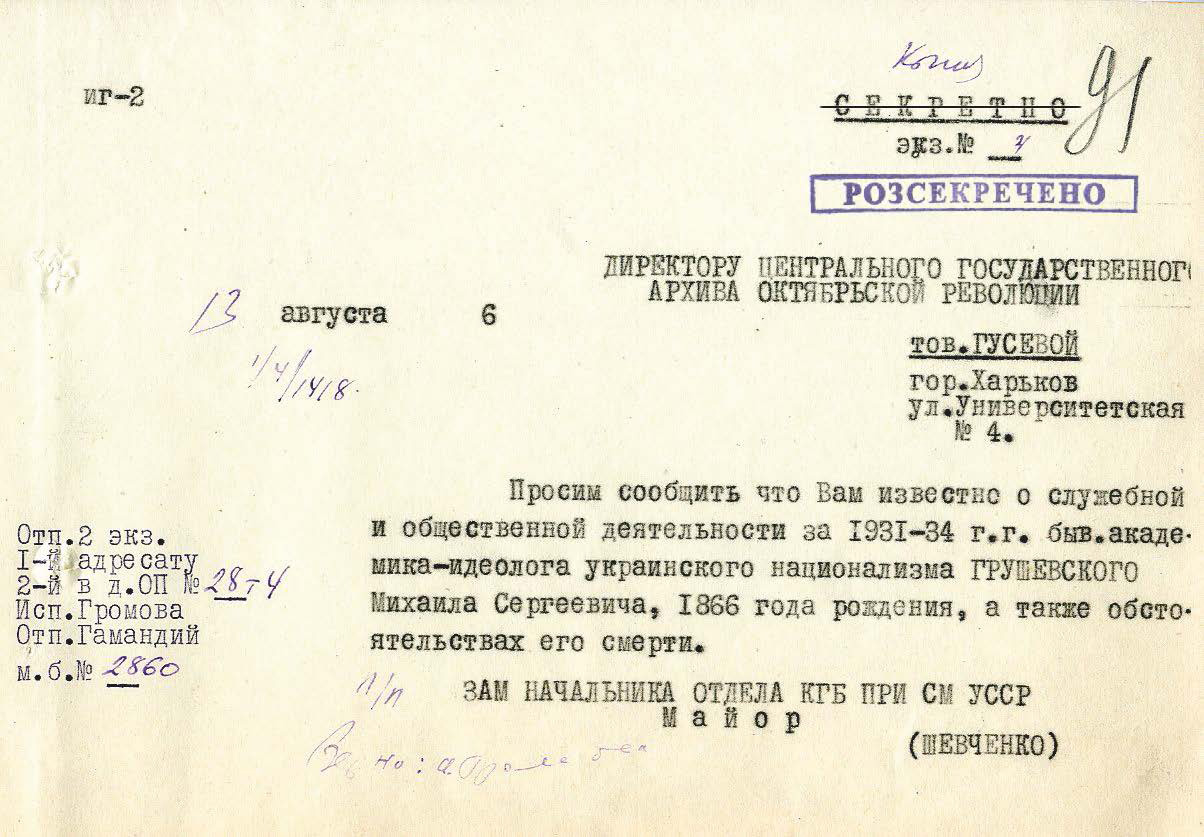 Водночас тоді ж, у серпні 1956 року, на адресу Центрального державного архіву жовтневої революції у Харкові, Київського обласного державного архіву, Архівного управління мвс урср та інших відомств надіслали запити з проханням повідомити, що відомо «про службову і громадську діяльність за 1931–34 рр. колишн. академіка – ідеолога націоналізму Грушевського Михайла Сергійовича, 1866 року народження, а також про обставини його смерті».