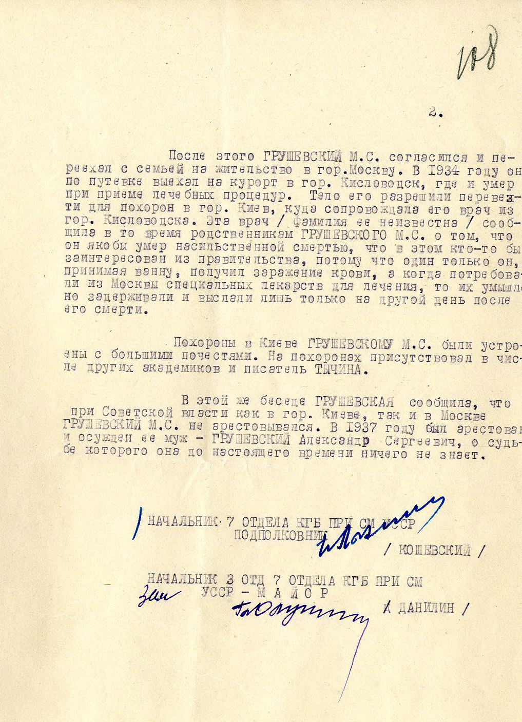 А далі в документі – найцікавіше, заради чого, зрештою, і затівався той легендований візит. «Після того Грушевський М. С., – наводяться в доповіді слова Ольги Грушевської, – погодився і переїхав на мешкання до москви. У 1934 році він по путівці виїхав на курорт у м. Кисловодськ, де й помер під час прийому лікарських процедур. Тіло його дозволили перевезти для поховання до м. Києва, куди супроводжувала його лікарка з м. Кисловодська. Ця лікарка (прізвище її невідоме) повідомила у той час родичам Грушевського М. С. про те, що він нібито помер насильницькою смертю, що в цьому хтось був зацікавлений з уряду, тому що лише він один, приймаючи ванну, отримав зараження крові, а коли вимагали надіслати з москви спеціальних ліків для лікування, то їх навмисне затримували і вислали тільки на другий день після його смерті» (ГДА СЗР України. – Ф. 1. Спр. 6760. – Т. 1. – Арк. 107–108).