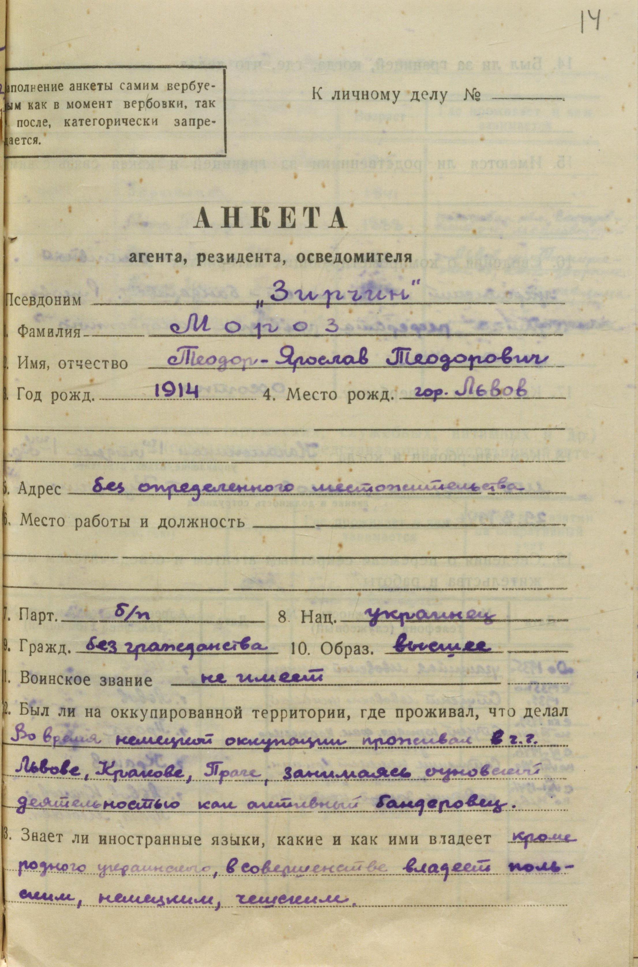 «За своїми особистими якостями, – зазначалося в довідці, –“Зірчин” є людиною грамотною, всебічно розвиненою і винахідливою, яка любить гроші і забезпечене життя. Хвастун, у розмовах багатослівний, самовпевнений. Любить висловлювати власну думку з будь-якого питання, що робить не завжди вдало. Швидко погоджується з думкою іншого, якщо вона логічна й оригінальна. Любить книги, ще більше гарні речі, картини, одяг… Родинні почуття розвинені слабко, водночас має прив’язаність до дружини і доньки» (ГДА СЗРУ. – Ф. 1. – Спр. 33. – Т. 2. – Арк. 11–12).