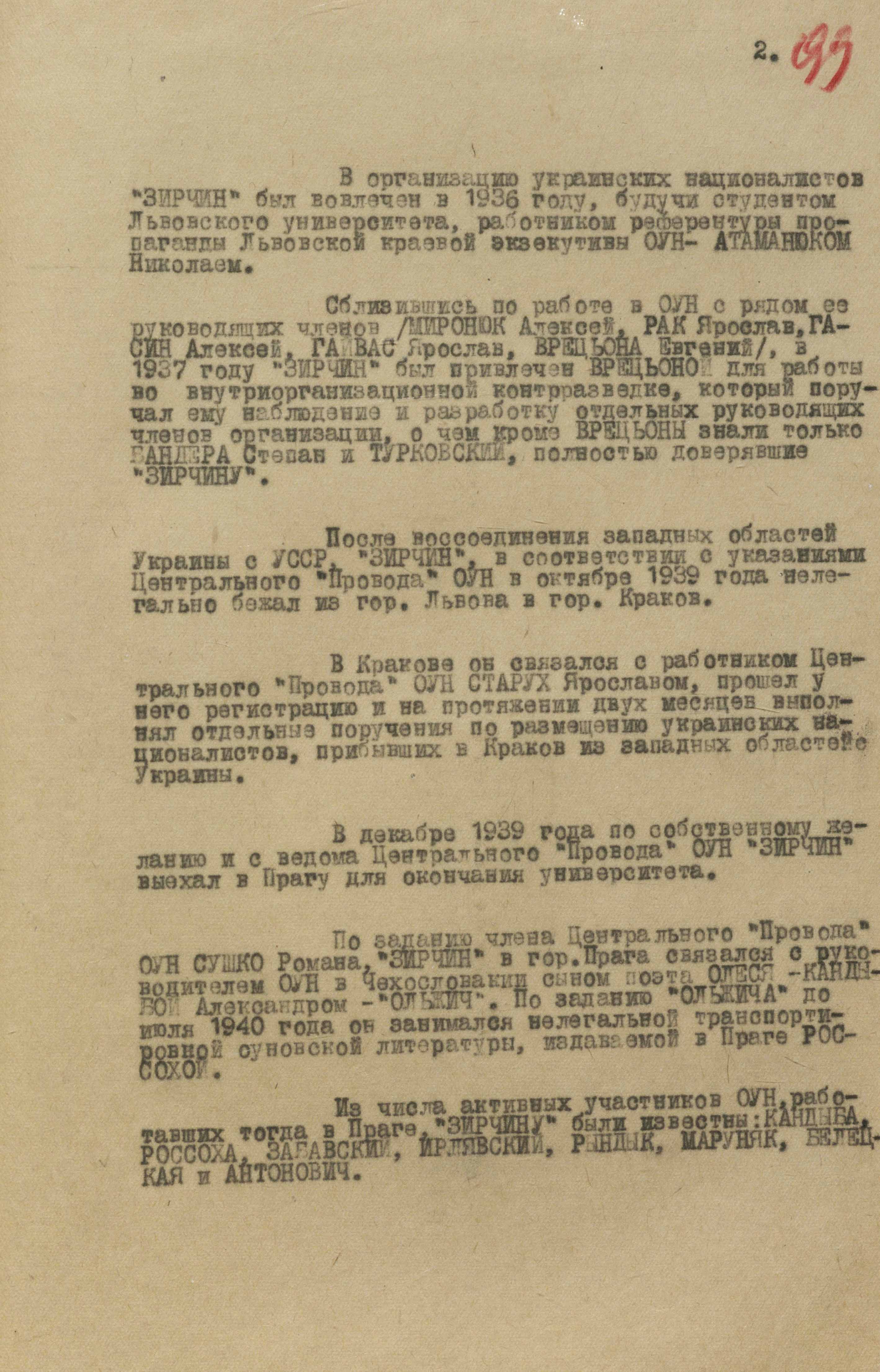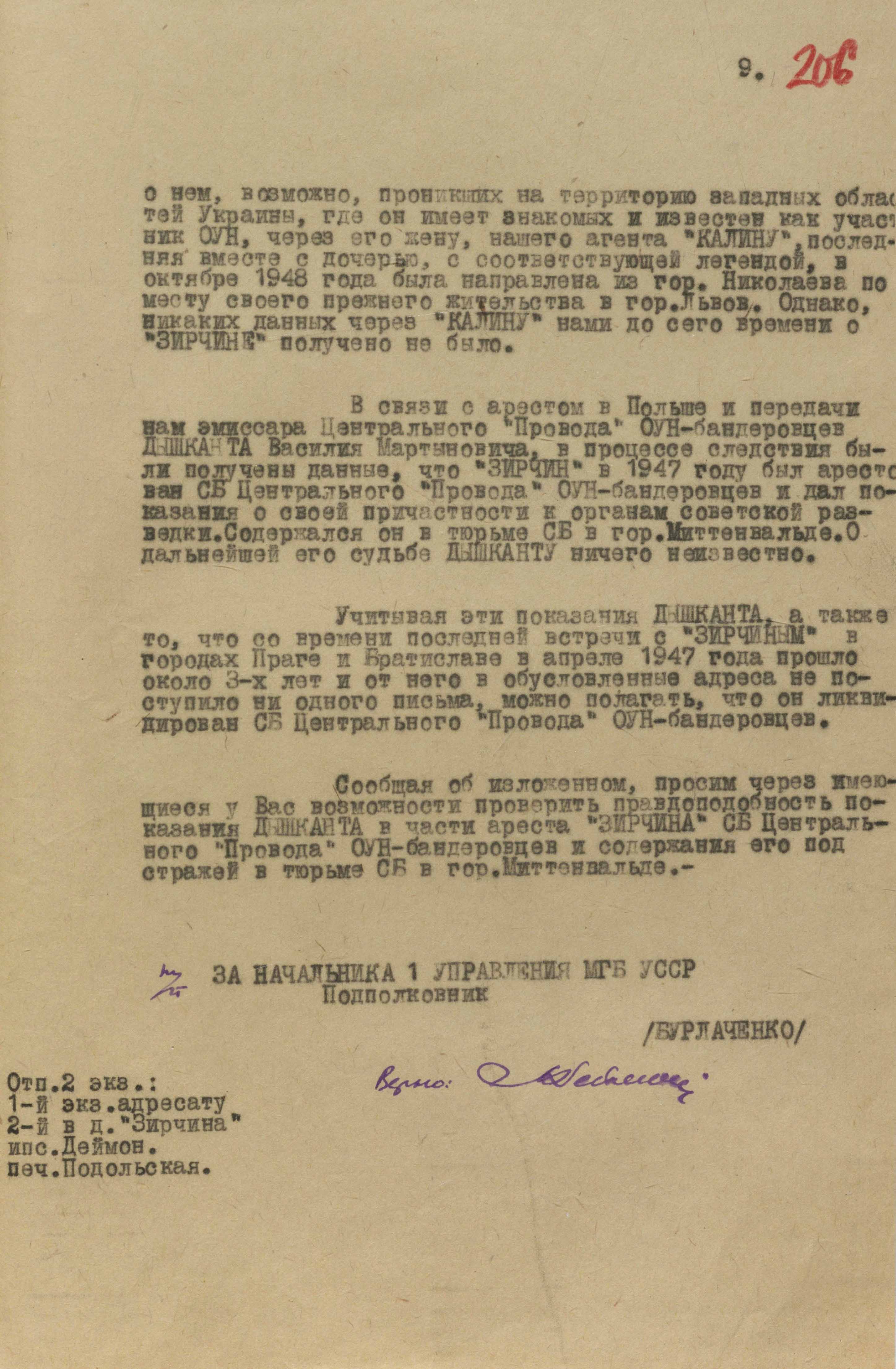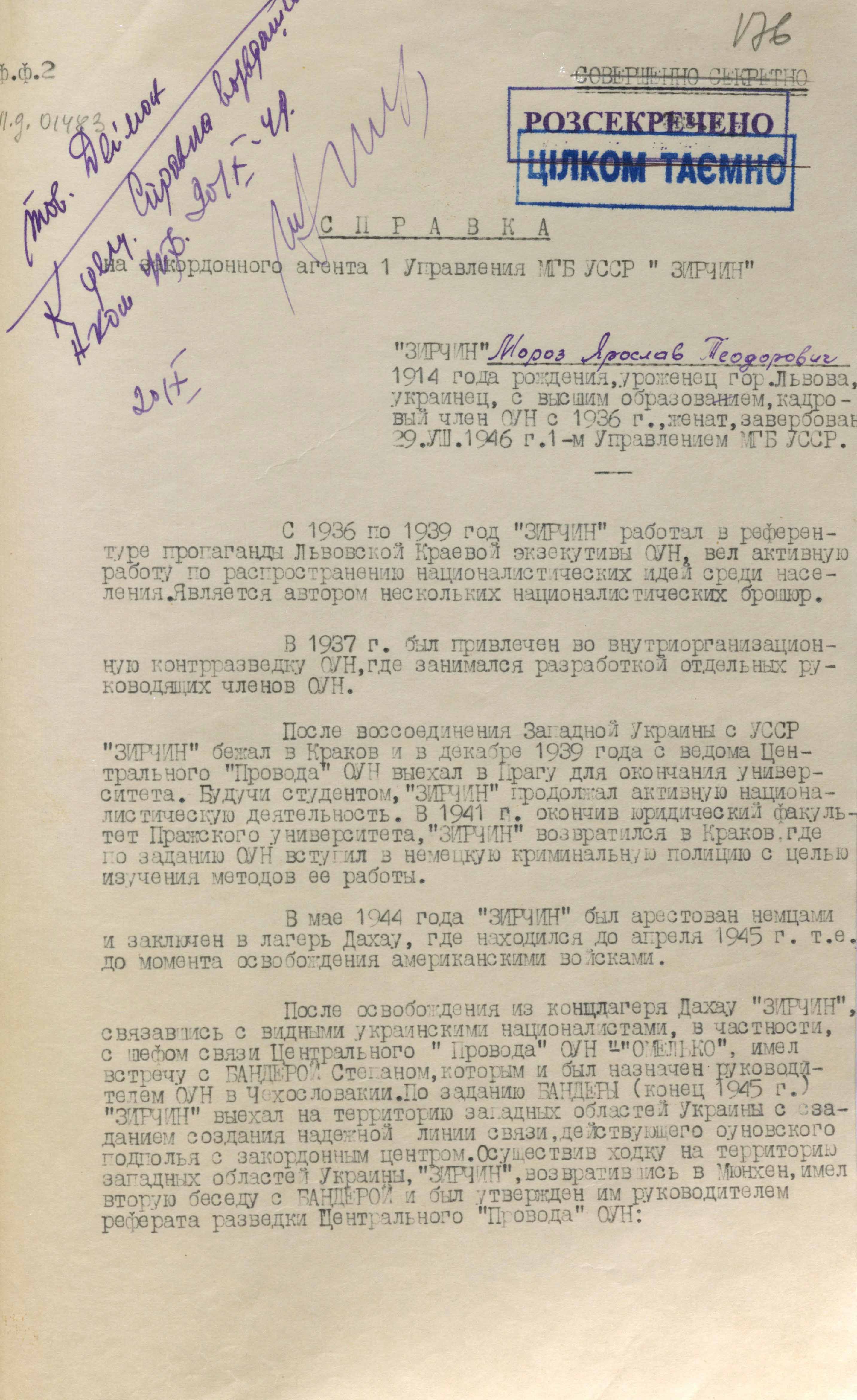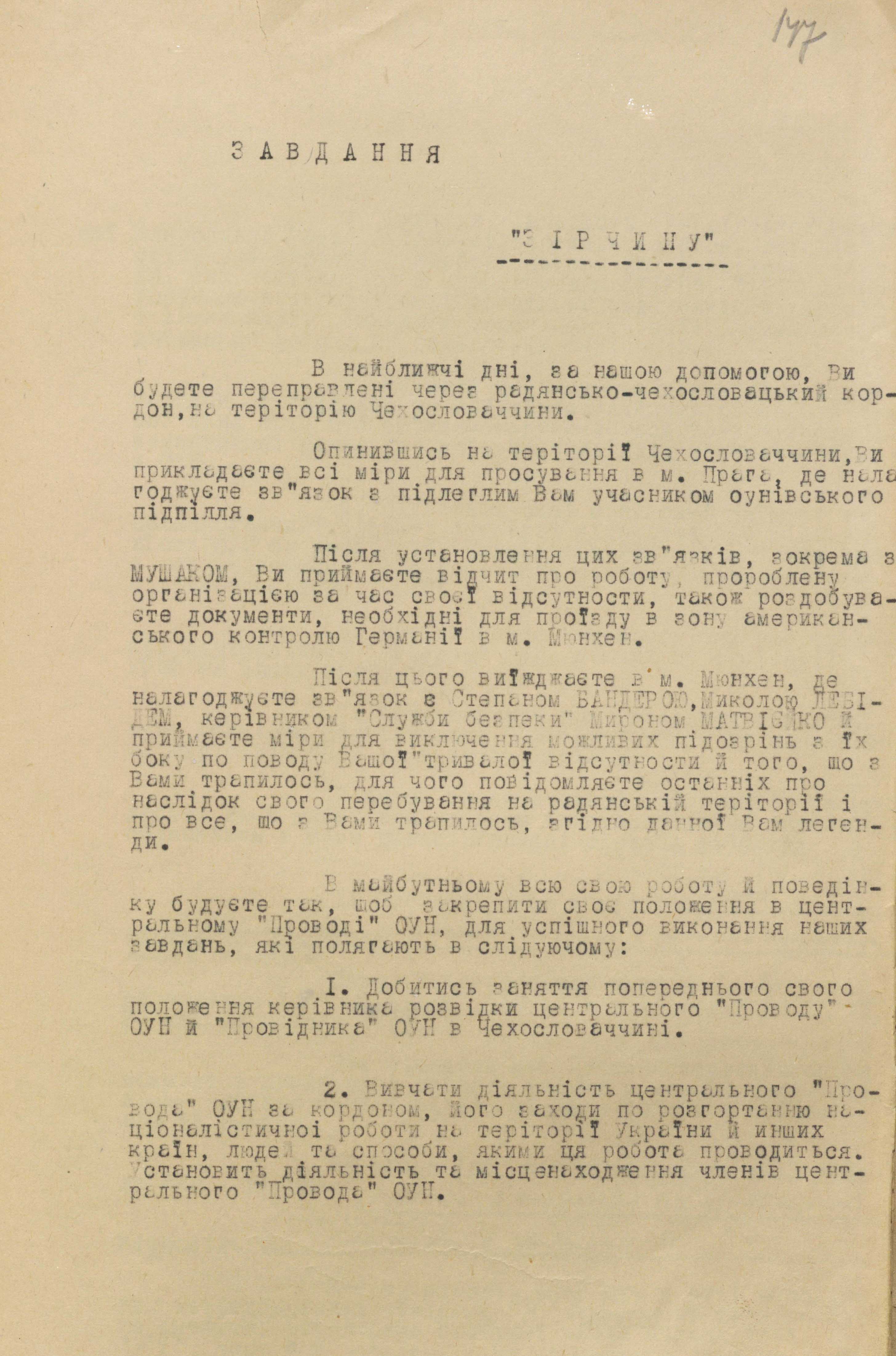 На цьому етапі питання про ліквідацію «Зірчиним» С. Бандери вирішили прибрати із завдання. У документі з москви за підписом заступника міністра мдб срср П. Федотова акцентувалася увагу на тому, що він нічого не повинен знати «про наші наміри щодо лідерів українських націоналістів». Спершу він мав відвести від себе всілякі підозри і закріпитися на позиції керівника розвідки ЗЧ ОУН, що відкривало для чекістів величезні можливості контролювати всю оунівську агентурну мережу.