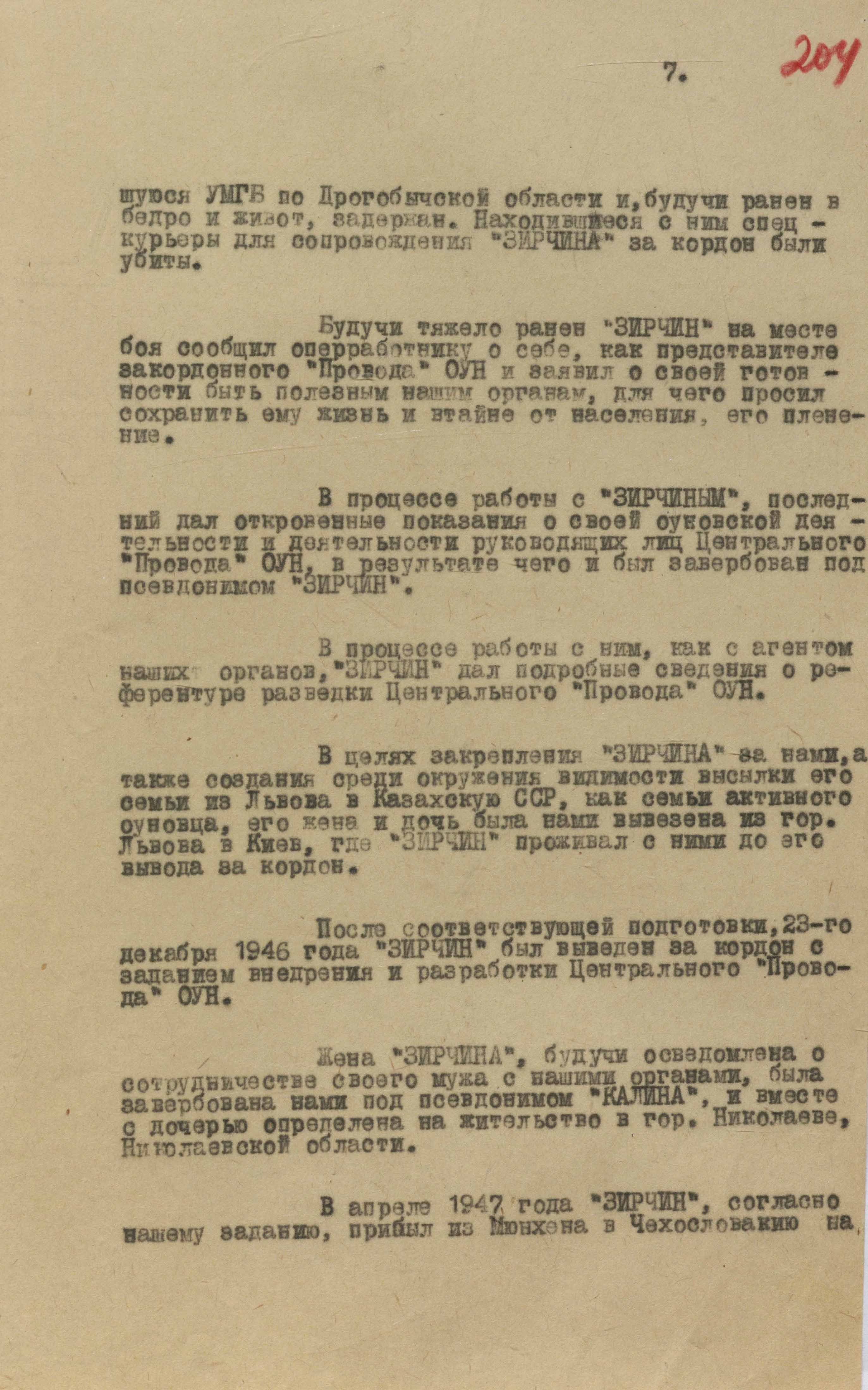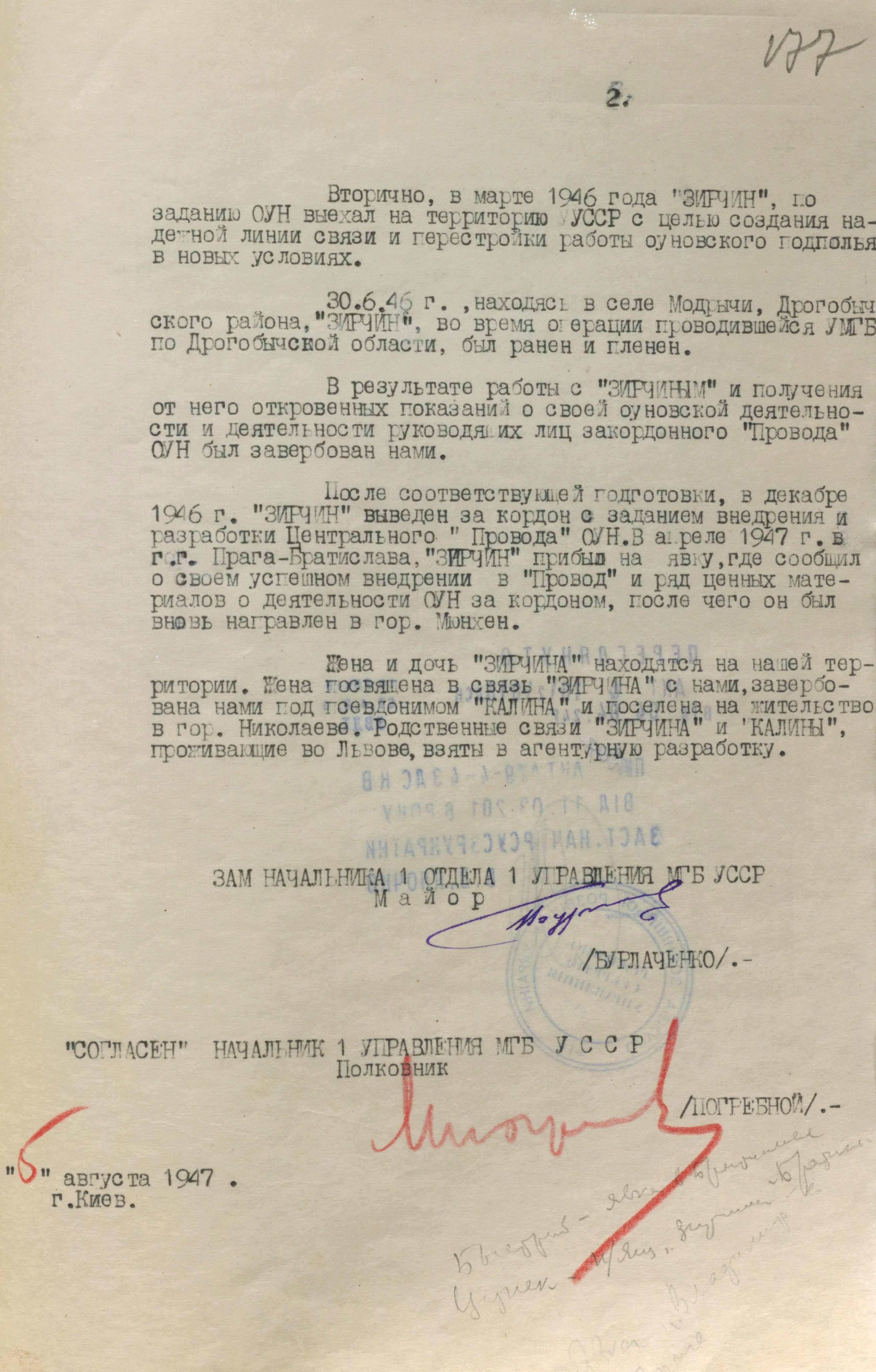 Про те, що на «Зірчина» в мдб покладали великі сподівання, свідчить запрошення його на зустріч із міністром мдб урср С. Савченком. Той розпитував про рідних і близьких, «легенду» виведення за кордон, про деяких діячів ОУН, зокрема М. Матвієйка і С. Бандеру. Після зустрічі «Зірчин» не приховував від оперативних працівників, які його супроводжували, що дуже потішений такою увагою до своєї персони і що виправдає надану йому довіру.