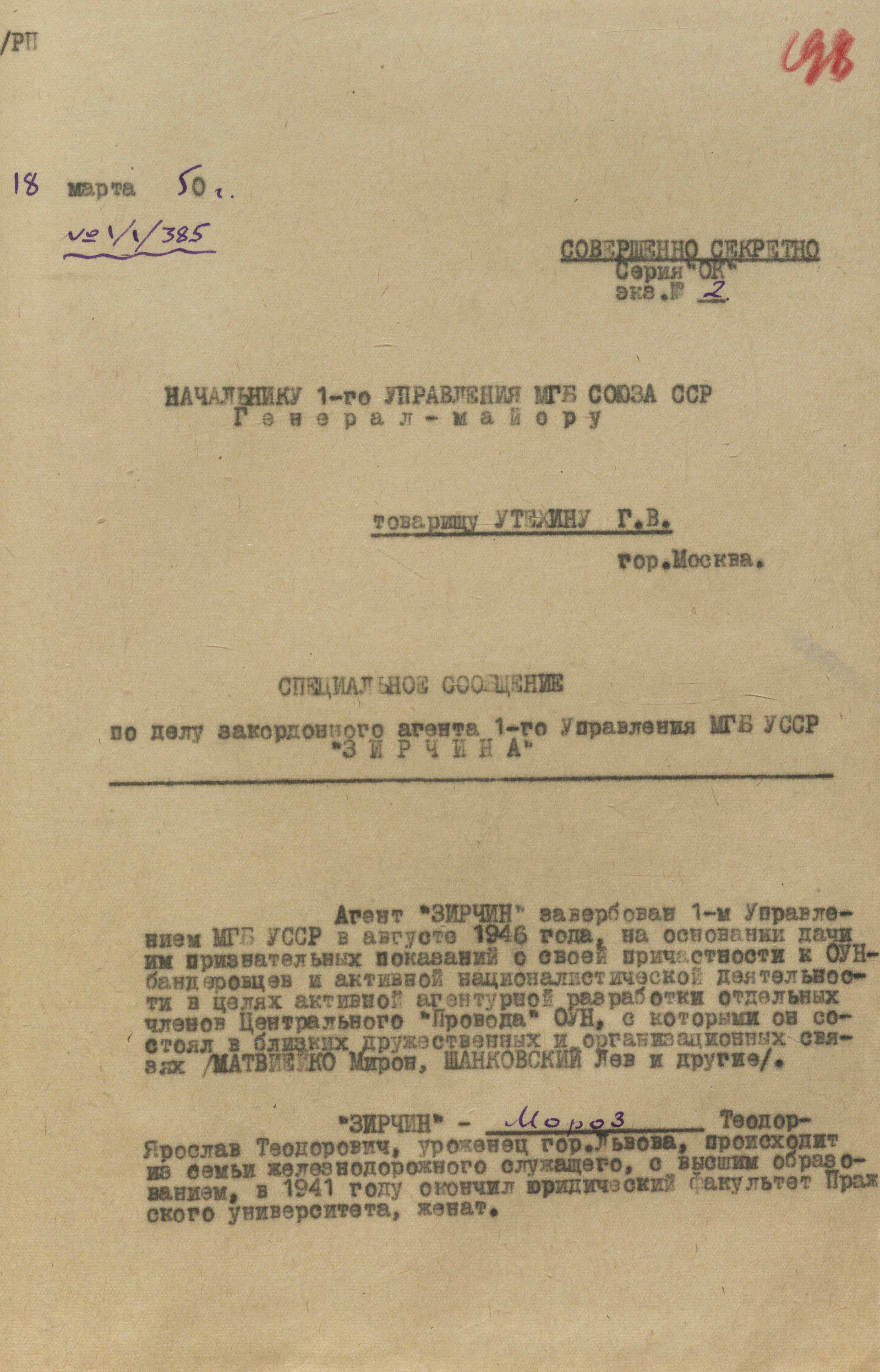 У підписці Я. Мороз справді написав про добровільне та ініціативне бажання співпрацювати з радянською розвідкою й зобов’язувався у такий спосіб «спокутувати свою провину перед українським народом». Для конспірації обрав (або запропонували працівники мдб) псевдо «45». Пояснення, чому саме таке, в справі немає. Невдовзі псевдо змінили на «Зірчин».