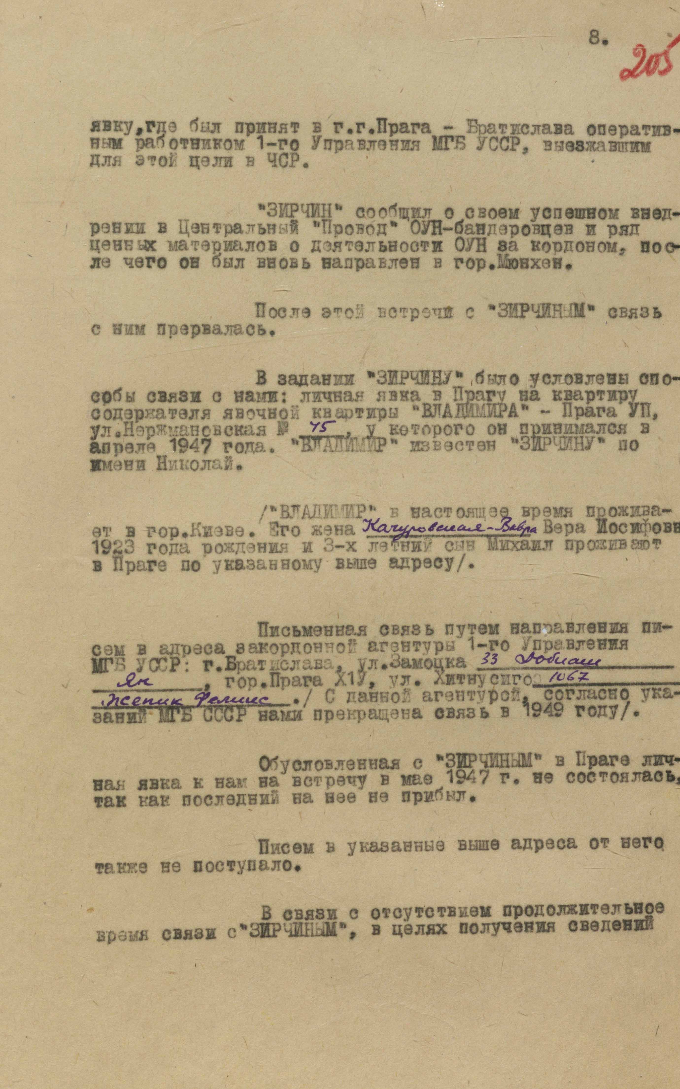 Натхненний таким ставленням до себе шефа СБ ЗЧ ОУН, «Зірчин» під час наступних кількох зустрічей із працівниками мдб у Празі й Братиславі навіть просив організувати йому поїздку на Великдень до сім’ї в срср. Мовляв, усе йде добре, немає підстав для зайвих хвилювань. Але на це чекісти дозвіл не дали. Тим часом призначали йому нові зустрічі на явочних квартирах і щоразу розпитували про ситуацію в Центральному Проводі ОУН, яка динамічно змінювалася. Цього вимагали і в директивах із москви. Аж раптом на чергову зустріч у травні 1947 року «Зірчин» не прийшов. Перестали надходити й листи від нього з умовними закодованими фразами. Усі спроби з’ясувати, що сталося, були марними.