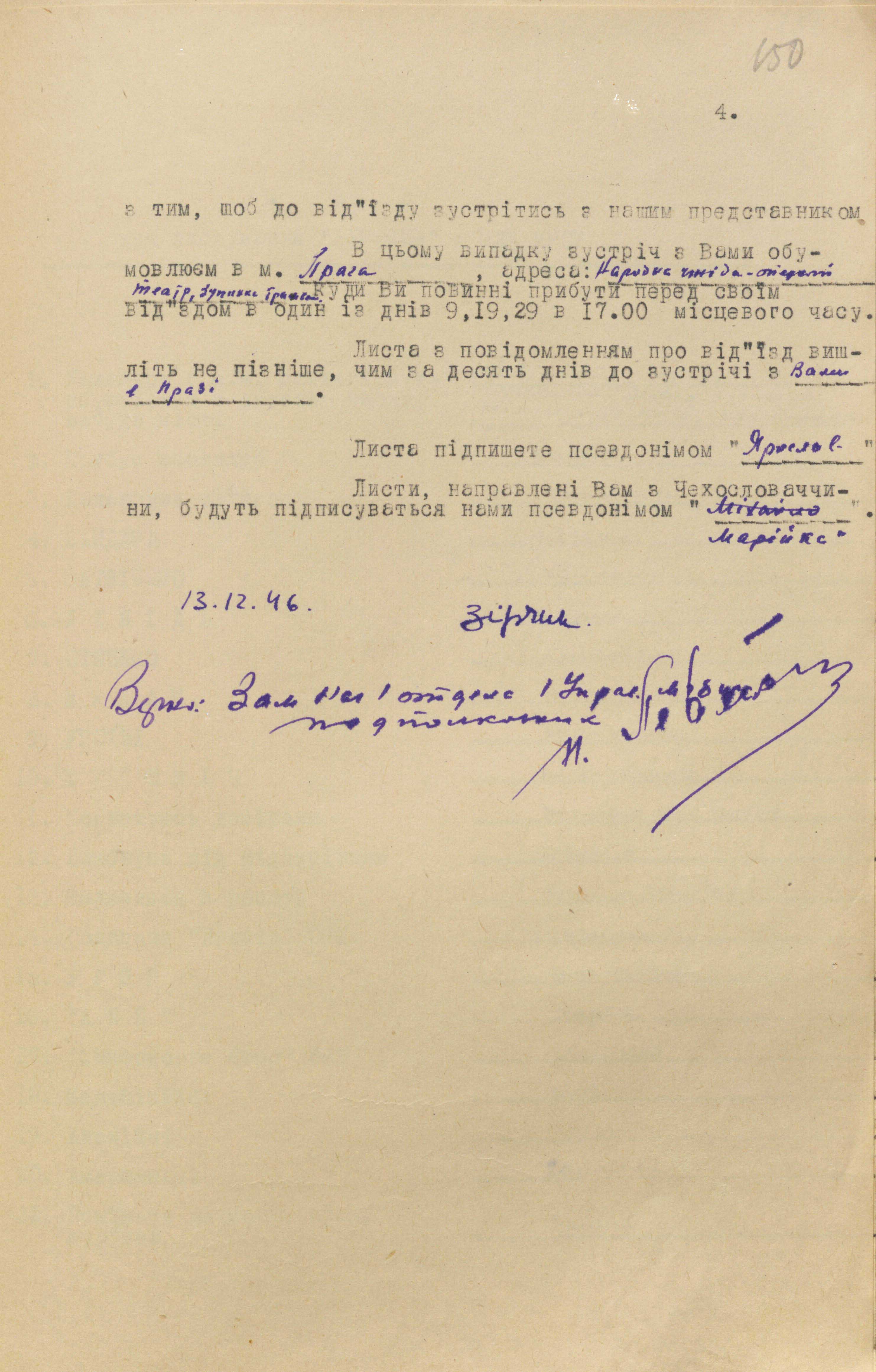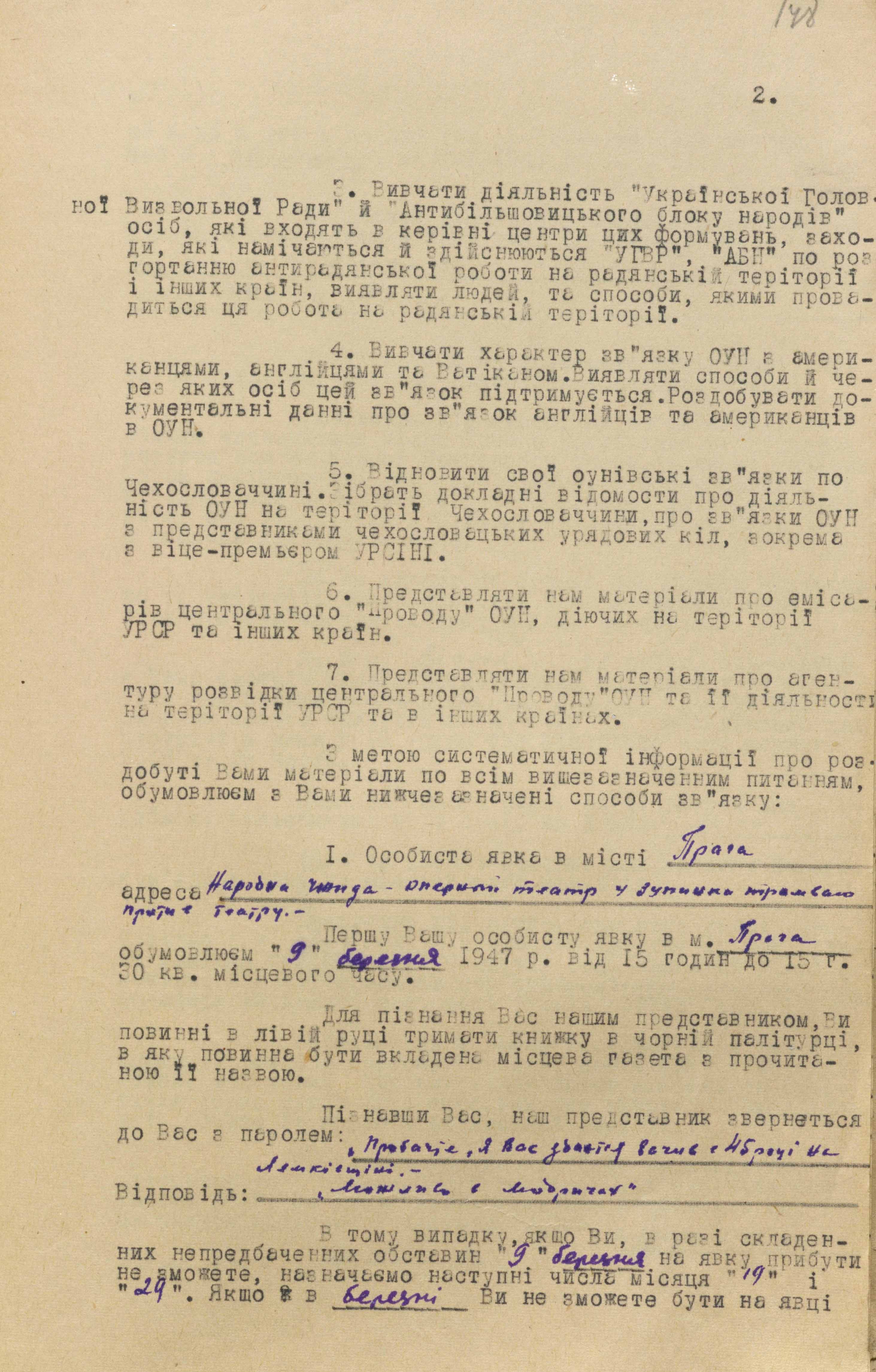 Перед виведенням за кордон із агентом обговорили способи зв’язку. Йому дали адреси поштових скриньок для кодованого листування у Празі й Братиславі. Передбачалося, що після узгодження дати, часу і місця на зустріч із ним виходитимуть працівники підрезидентур мдб урср «Вузол» і «Десна» відповідно у Празі та Відні. Перша явка була призначена в Празі на 9 березня 1947 року.