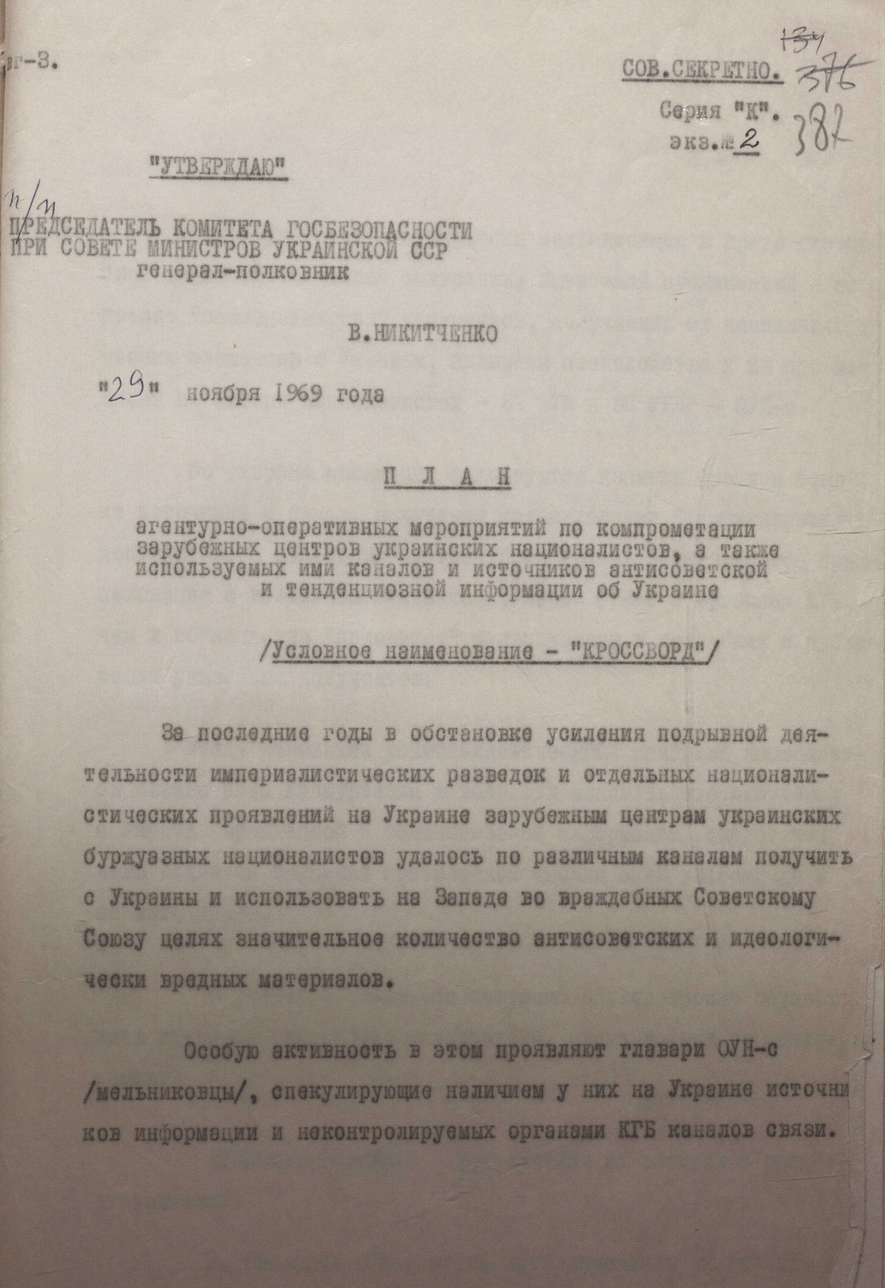 As evidenced by declassified documents from the archives of the Foreign Intelligence Service of Ukraine, the kgb’s special operation “Krossvord” dates back to the end of 1969. The reason for its conduction was threatening information, as interpreted by the kgb, that the Ukrainian emigrant community, particularly in France, had shown tendencies to intensify their work, as well as to reach understanding, reduce disagreements, and increase points of contact in matters of strategy and tactics of the struggle for an independent Ukraine.