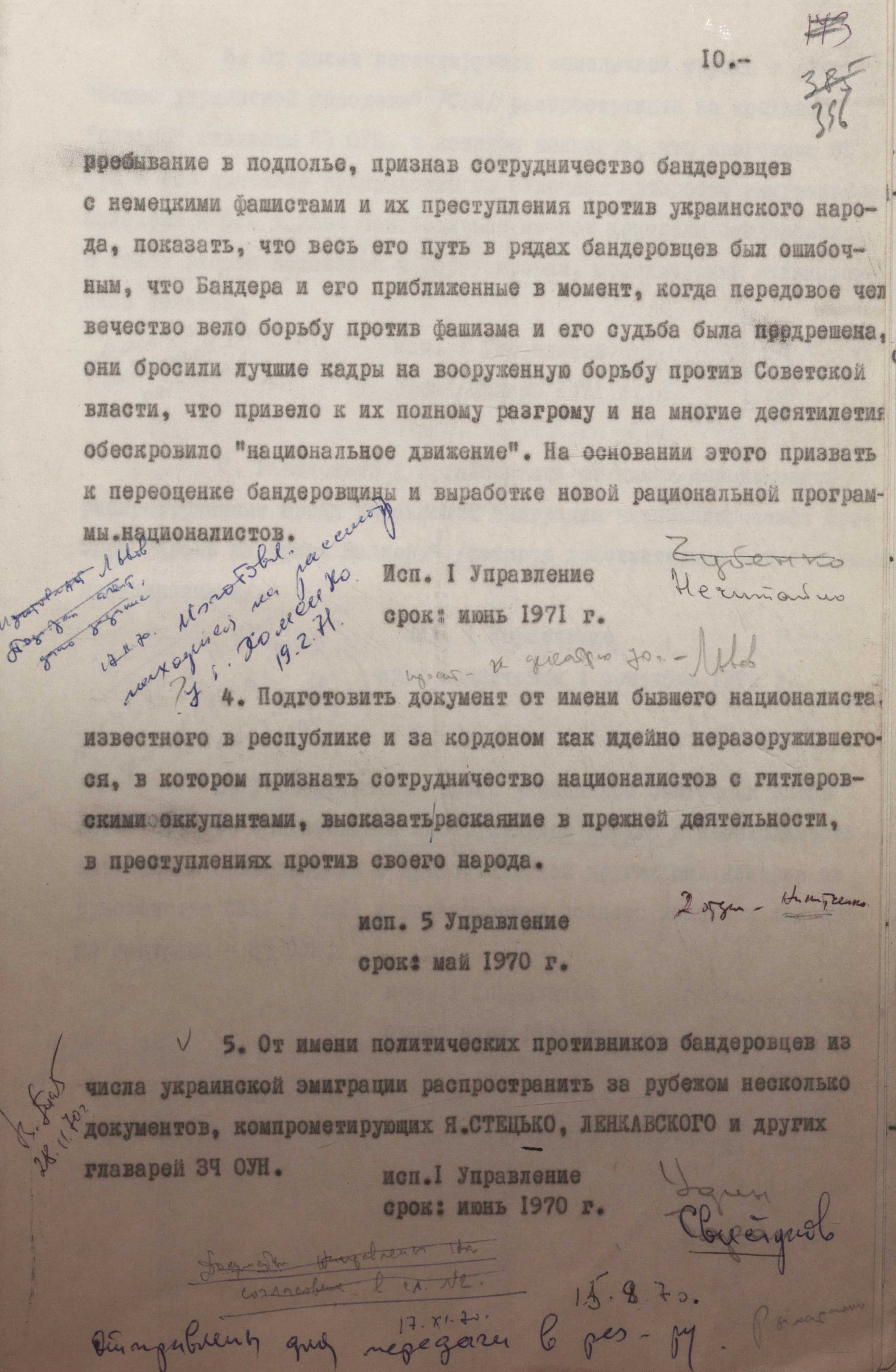 The measures envisaged by this part of the plan were intended to finally put Melnykites at odds with the Banderites. For this purpose, under the guise of samvydav, the kgb prepared texts allegedly authored by PUN supporters, which criticized the programmatic provisions of the documents of regular meetings and conferences of the OUN Central Committee. On behalf of the political opponents of the Banderites, they planned to spread several documents abroad to compromise personally Y. Stetsko, S. Lenkivskyi and other leaders of the OUN Foreign Units.