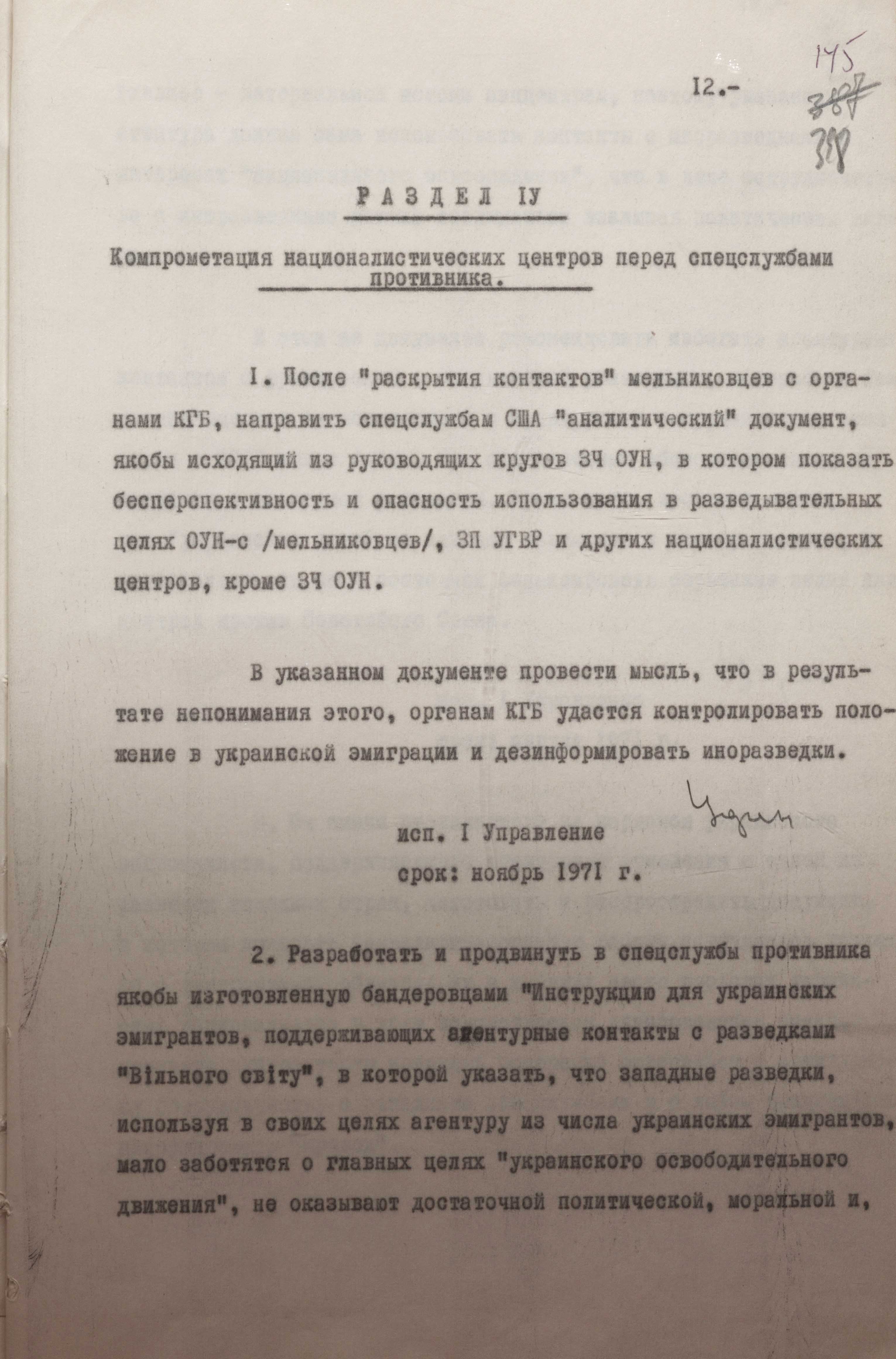 Among other things, the task was to create an “Instruction for Ukrainian Emigrants Who Maintain Agent Contacts with Intelligence Services of the ‘Free World’”, which would contain provisions and recommendations to compromise special services and the very idea of receiving assistance from them in the liberation struggle. This pseudo-instruction was also to come in view of a number of intelligence services, so that they would give up such contacts. In other words, it was about isolating Ukrainian centers abroad from any kind of assistance from the outside.