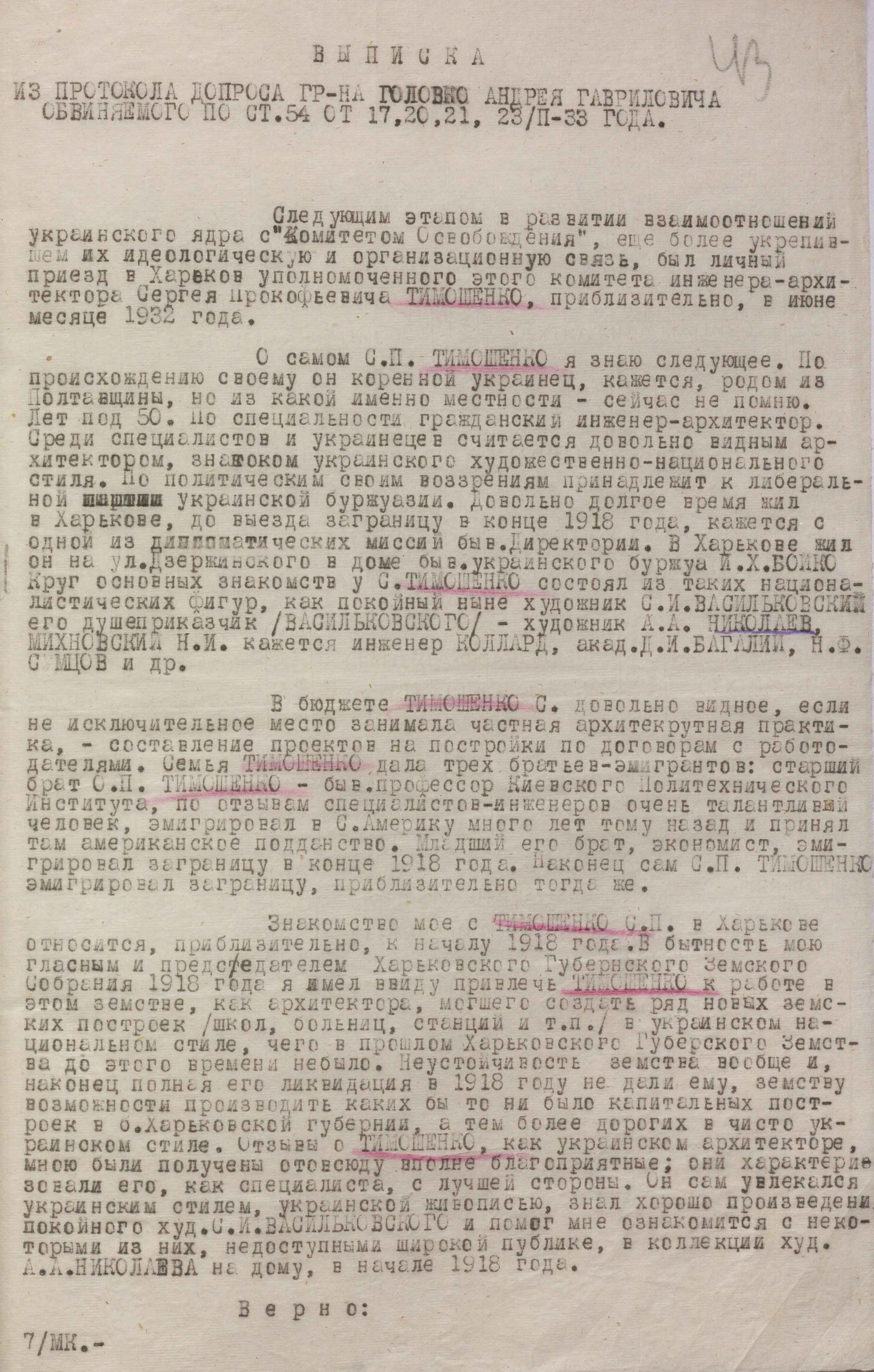 The case file includes protocols of interrogation of Andrii Havrylovych Holovko, former Chairman of the Kharkiv Zemstvo Provincial Assembly (1918), who was arrested by the gpu of the Ukrainian ssr in January 1933 and executed in March of that year for counterrevolutionary espionage and sabotage in agriculture. During the interrogation, A. Holovko testified about S. Tymoshenko’s illegal arrival under a different name in Kharkiv in June 1932 to hold a secret meeting. According to the interrogation protocols, he knew S. Tymoshenko well from their previous work together in Kharkiv. He testified about him as follows:
