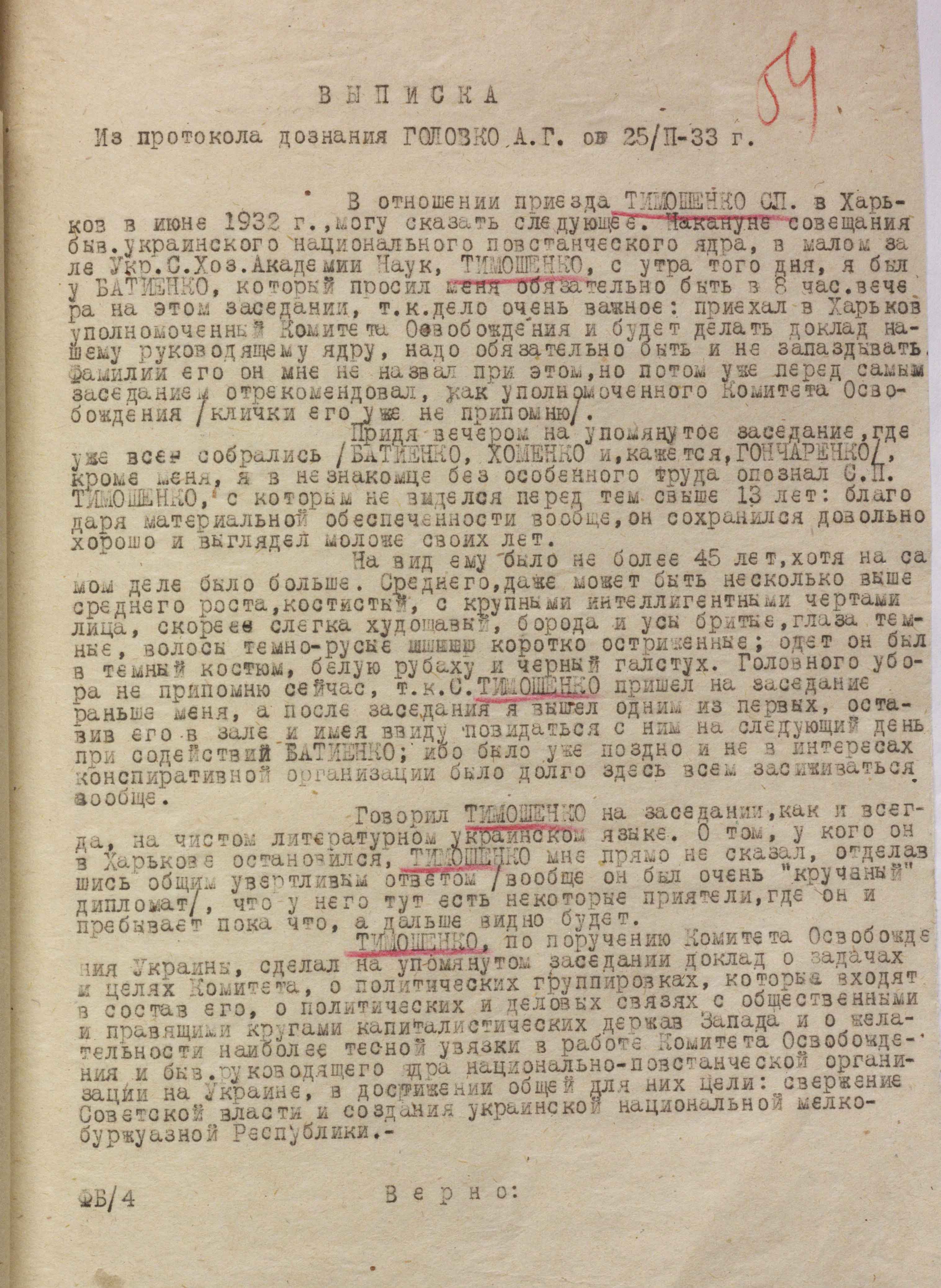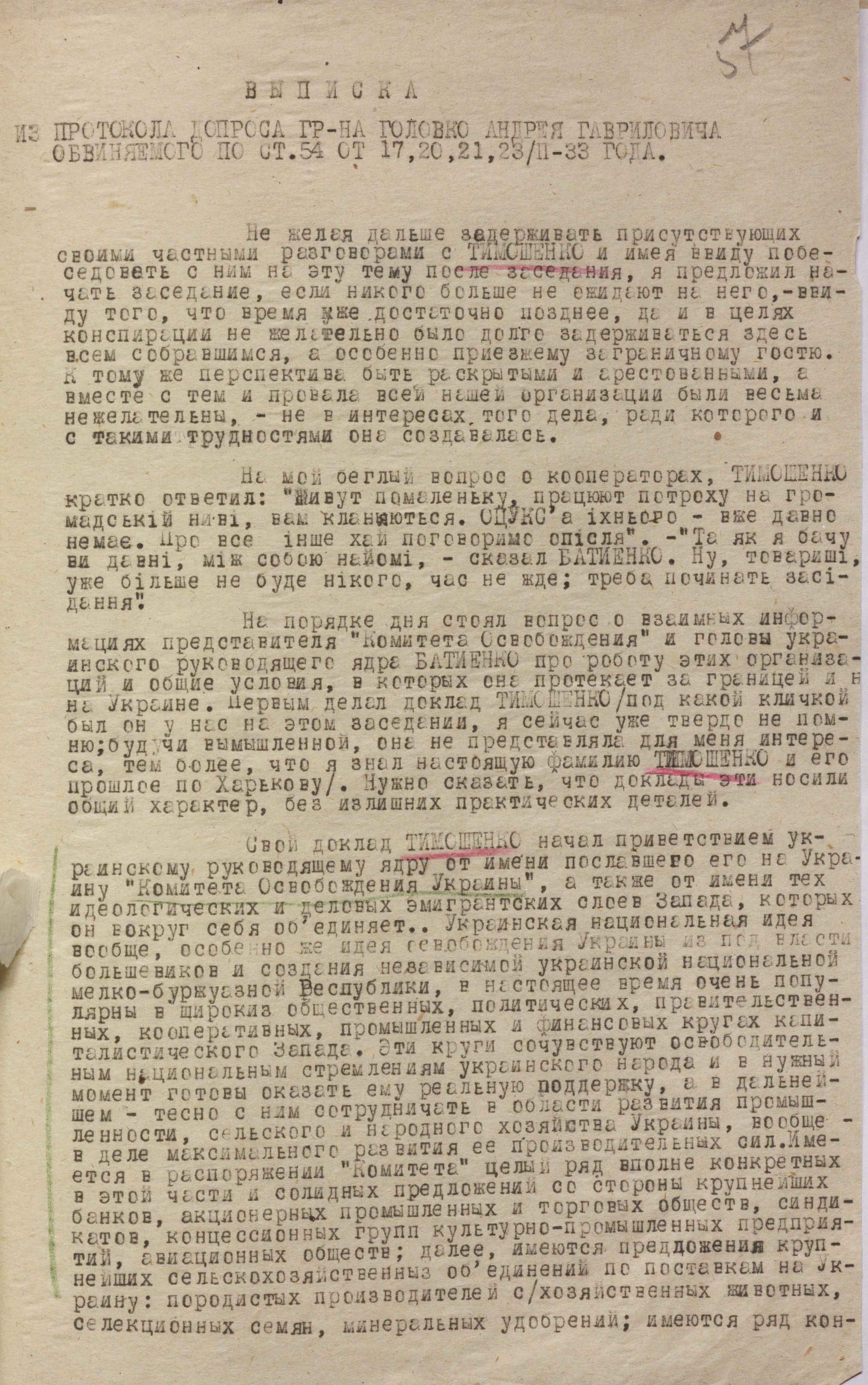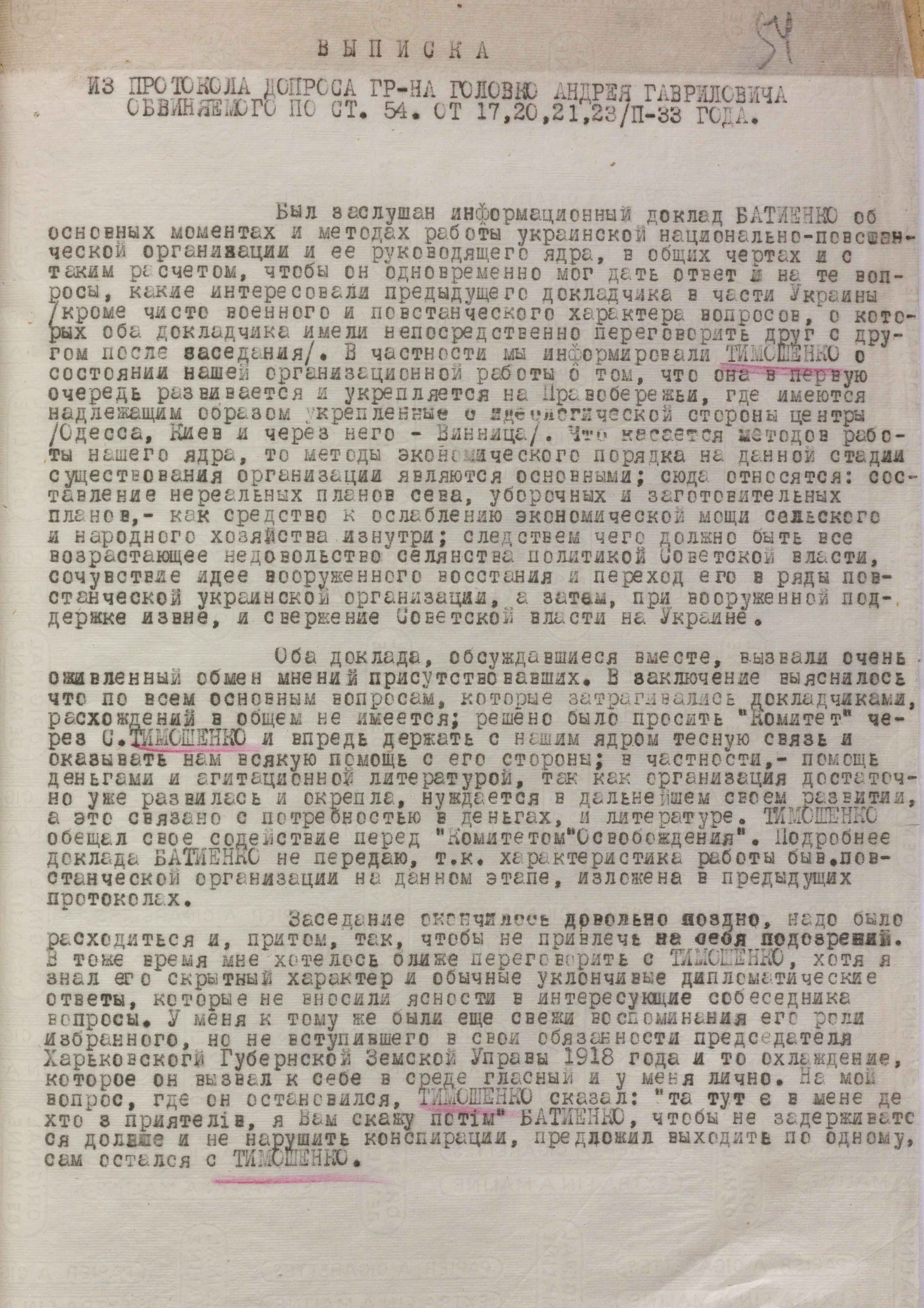 In particular, he referred to S. Tymoshenko as an authorized representative of the “Committee for the Liberation of Ukraine” who secretly arrived in Kharkiv to participate in the meeting and stayed with his friends, but did not say with whom exactly. The meeting discussed the situation in soviet Ukraine, a plan for further joint actions, the provision of material assistance, ways to obtain weapons, and other issues. A. Holovko recounted Tymoshenko’s speech at the meeting. However, the phrases from the interrogation report are similar to most of the testimonies of people repressed at the time in Kharkiv region and other regions of soviet Ukraine.