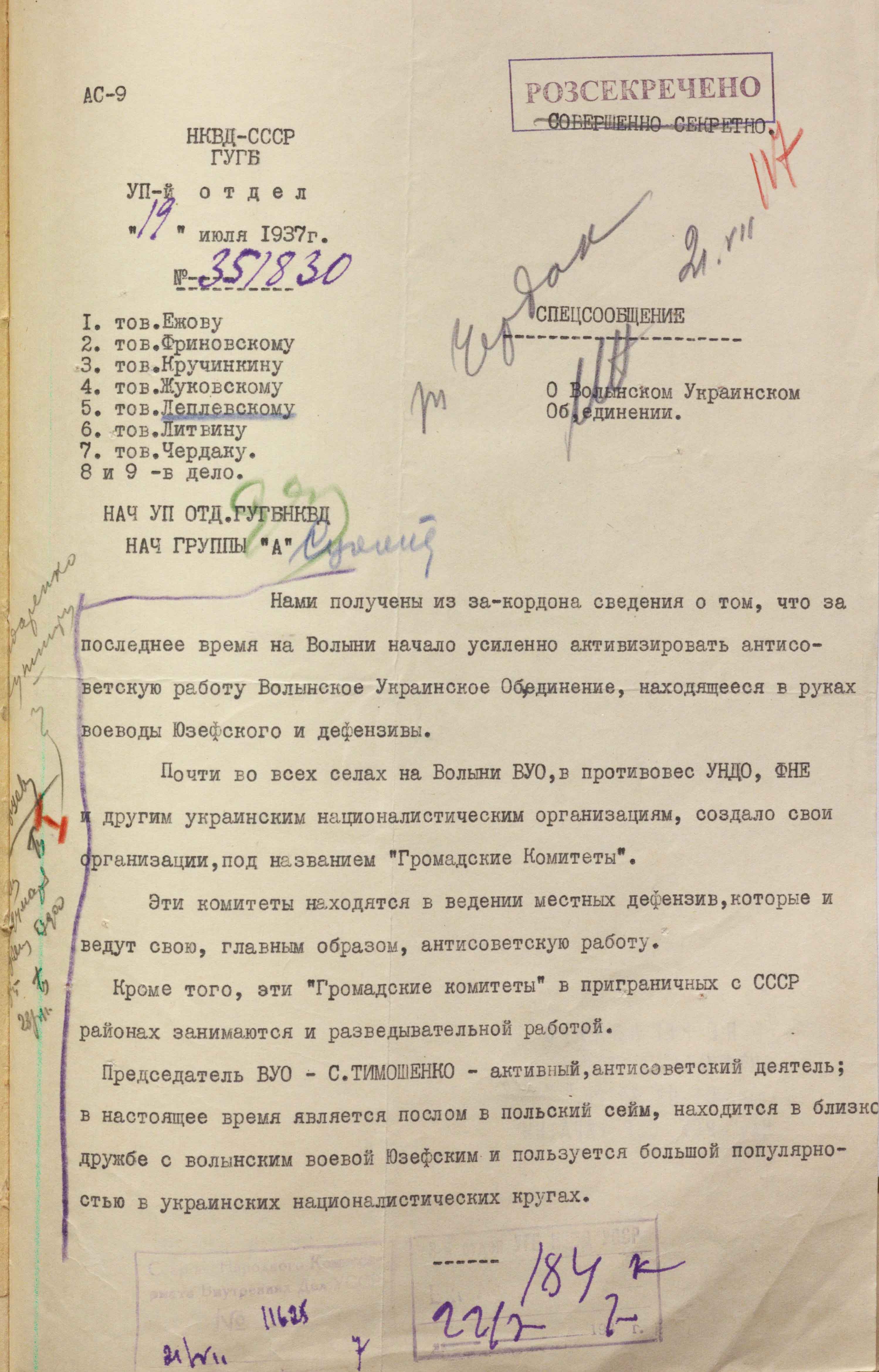 Operational cultivation was intensified in the second half of the 1930s, when he became an Ambassador to the Polish Sejm. In 1939, a document was sent to Kyiv from moscow, which contained a cryptic phrase about an “important work abroad”. It read as follows: “For several years now, the issue of recruiting Serhii Tymoshenko has been studied, but it has not been resolved yet. Given Tymoshenko’s extremely important role in the Ukrainian nationalist movement in Volyn, his great authority (he was re-elected Ambassador to the Polish Sejm in the last election), we consider recruiting Tymoshenko to be one of our most important tasks. Please collect all information about Tymoshenko’s family and other ties in Ukraine” (FISU.– F.1. – Case 7166. – Vol. 1. – P. 119).