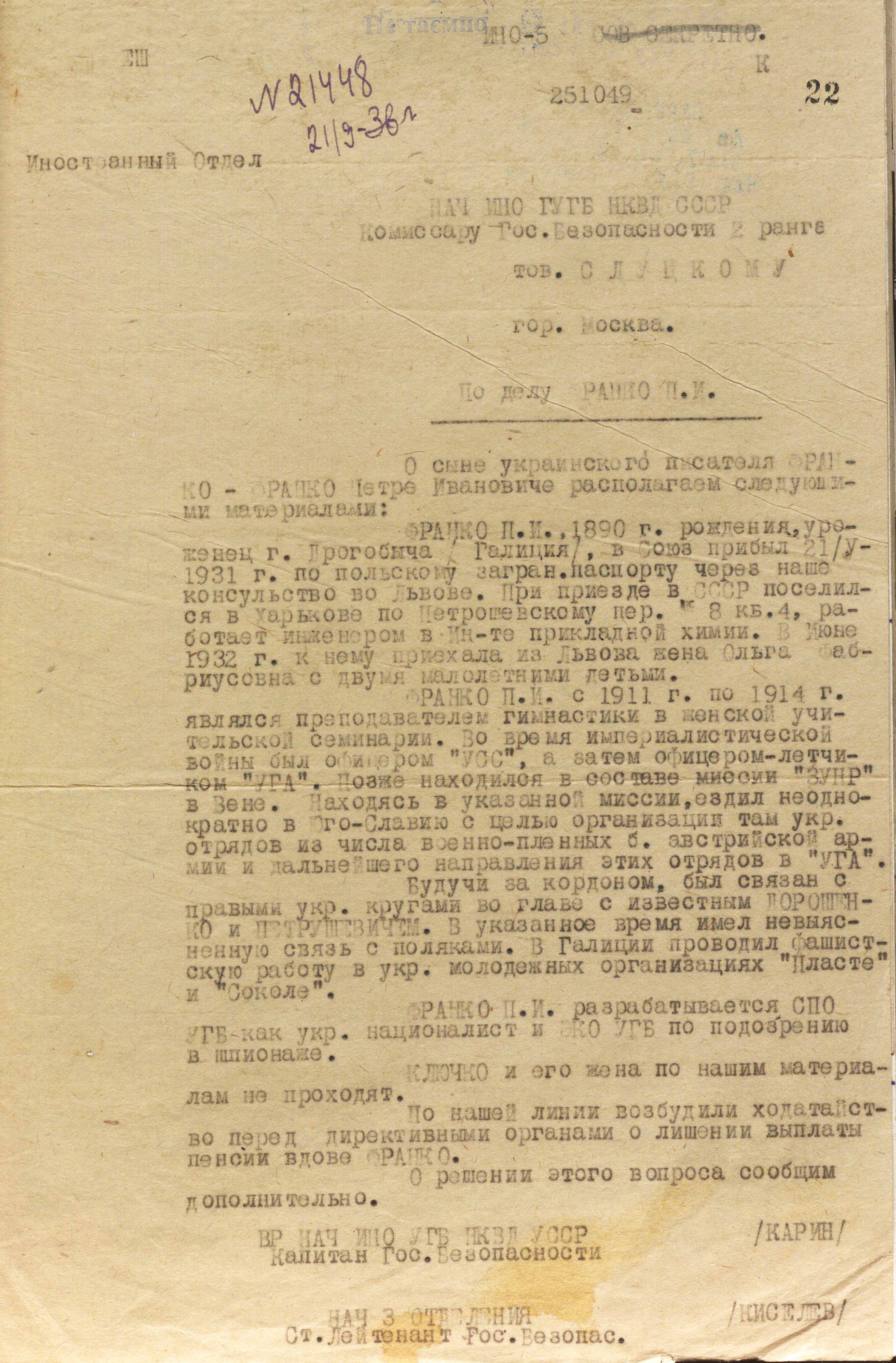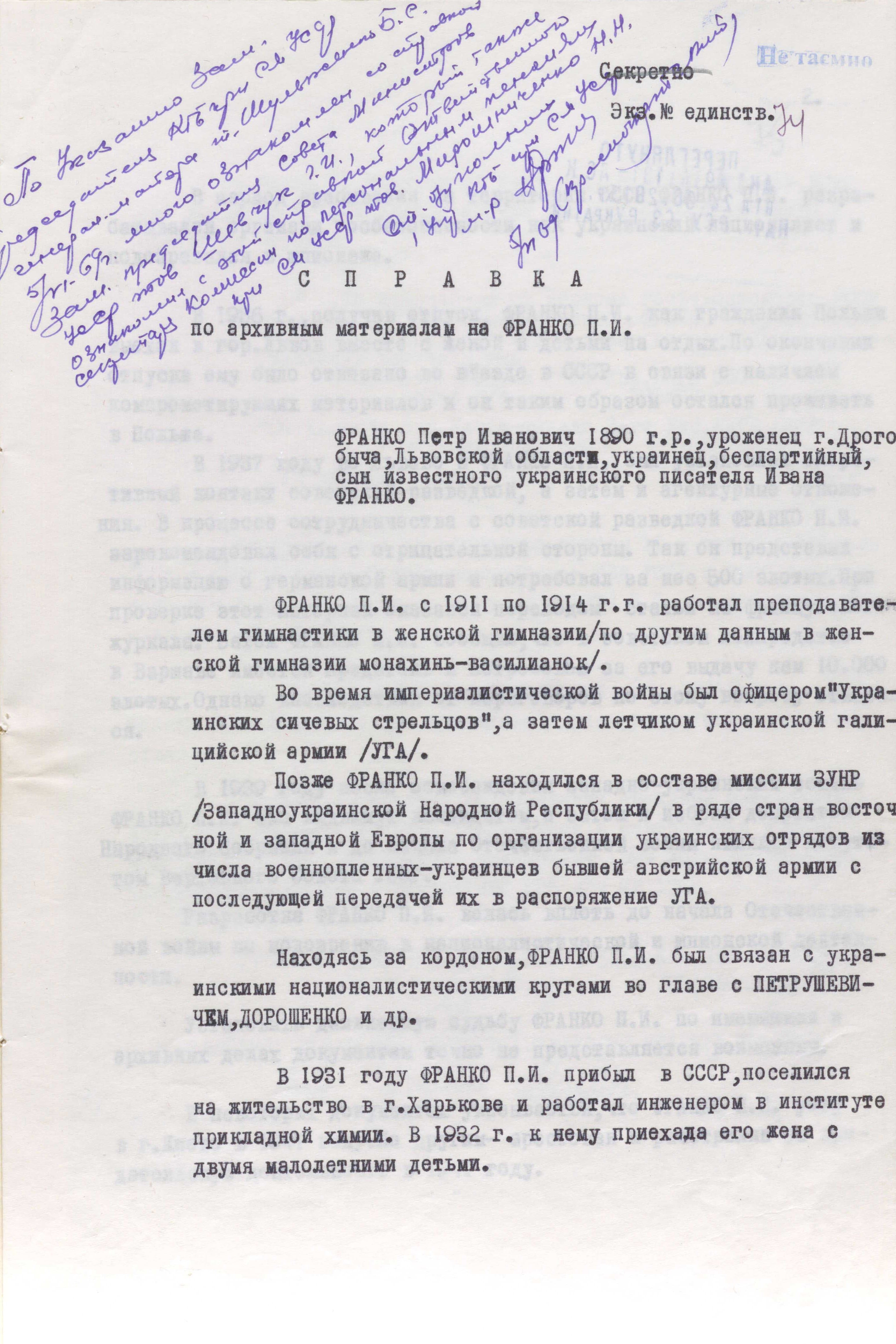 “...According to the oral information received from the people’s commissar for state security of the Ukrainian ssr comrade Savchenko, Franko Petro Ivanovych was shot dead for treasonous activities at the beginning of the German-soviet war.
