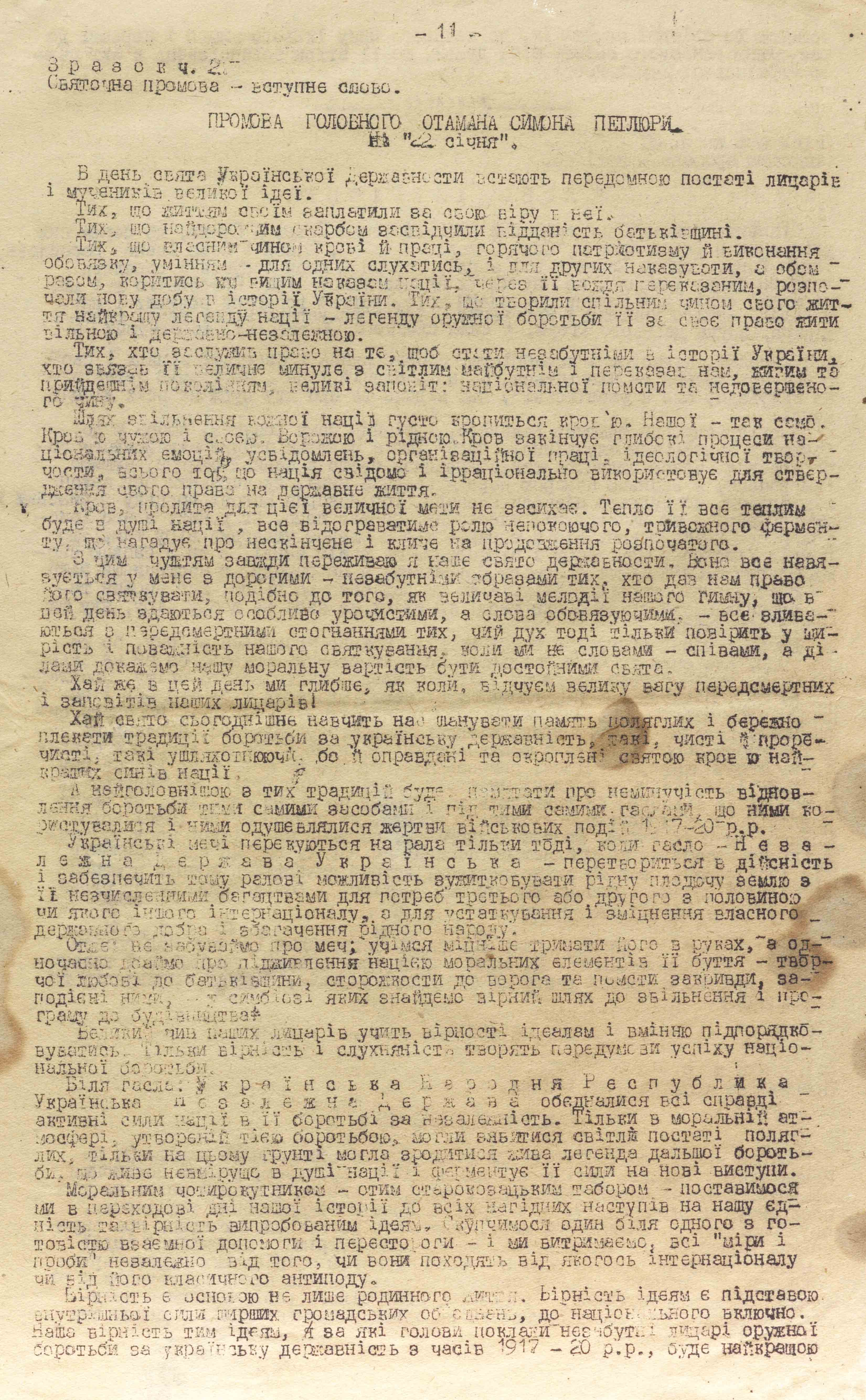 Among the declassified documents in the archival funds of the Foreign Intelligence Service of Ukraine there is the text of Head of the UPR Directorate, Chief Otaman of the UPR Army and Fleet, Symon Petliura’s speech on the occasion of the Day of Ukrainian Statehood. This text, written on yellowed paper on a typewriter, was kept by the political educator of the “Zahrava” Military District of the Ukrainian Insurgent Army, Stepan Kostetskyi, pseudonym “Zymnyi”, and served as a model for conducting educational work among the insurgents.