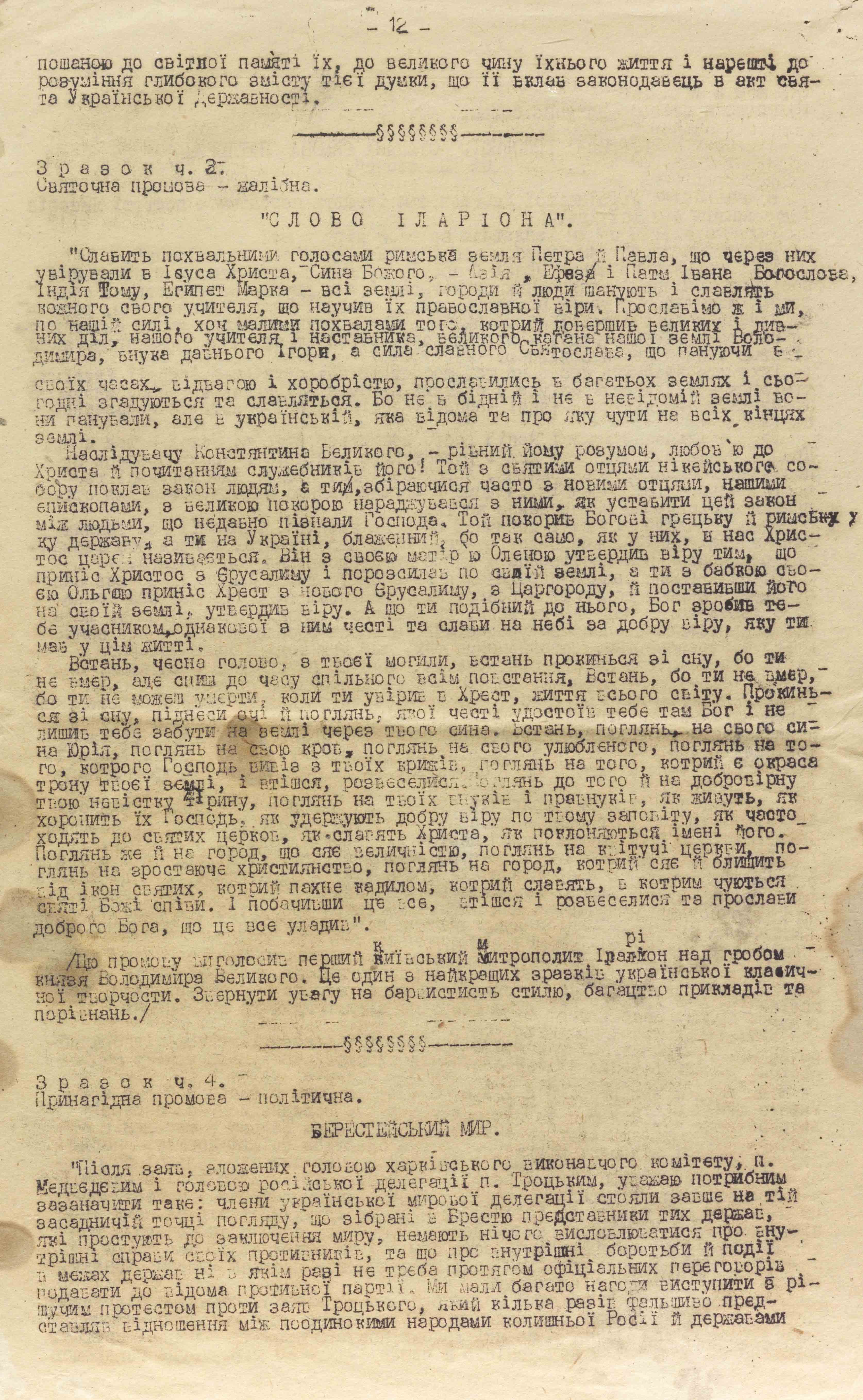 Political educator “Zymnyi”, as evidenced by the materials seized from his archive, carefully prepared for such work, explanatory talks, which are referred to as “hutirky”. At the same time, he himself studied the art of public speaking. As an example, he took the addresses and texts of speeches by the hierarchs of the Ukrainian church and prominent figures of the Ukrainian national liberation movement, which he somehow obtained from somewhere. One of them is the sermon “The Word of Hilarion,” delivered by the first Kyivan Metropolitan Hilarion over the tomb of Prince Volodymyr the Great. “This is one of the best examples of Ukrainian classical literature,” “Zymnyi” typed under the text of the speech, “Pay attention to the colorful style, the richness of examples and comparisons”.