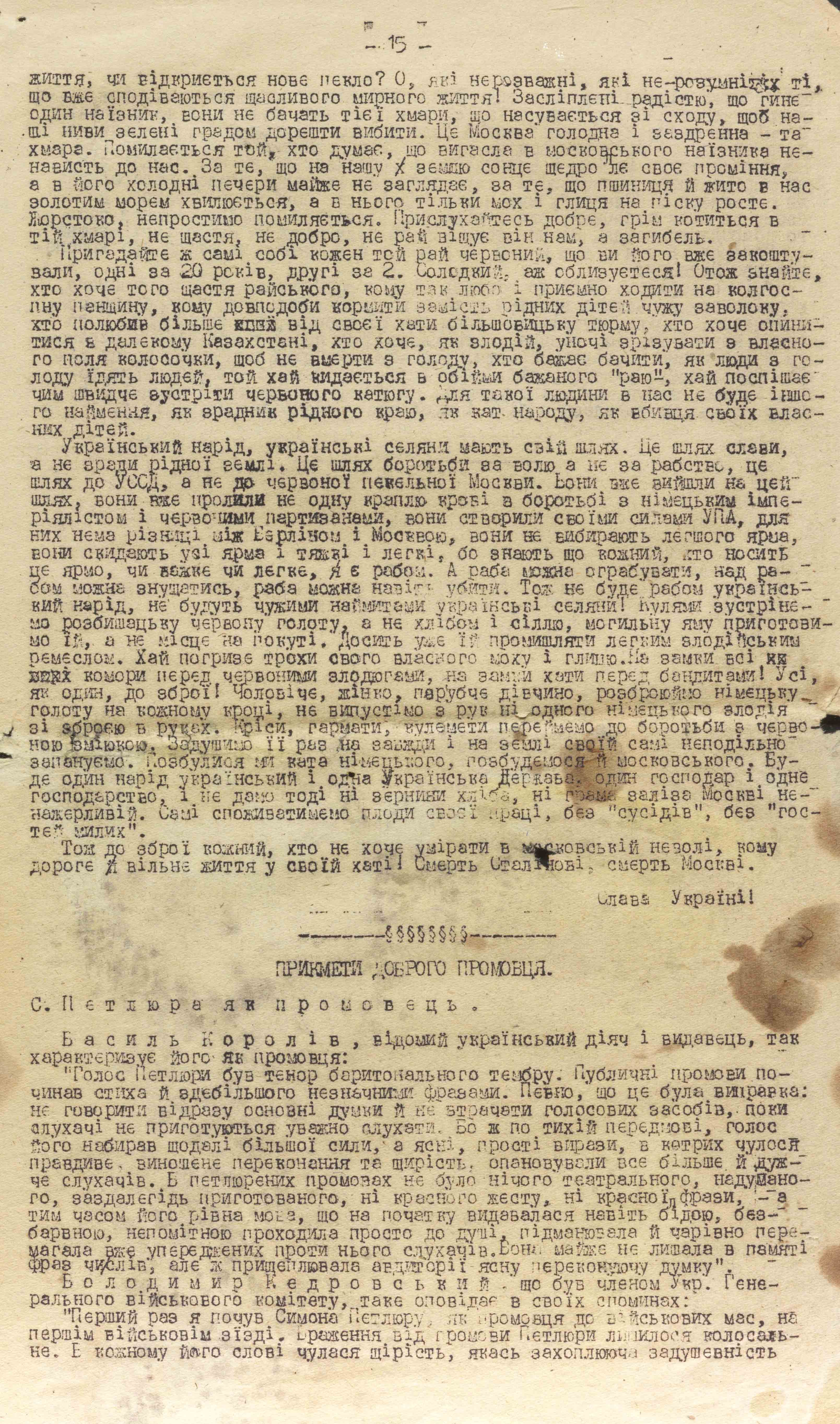 Along with other methodological recommendations, instructional materials, orders, notes, leaflets, and handwritten notes, the text of S. Petliura’s speech was kept, as mentioned in the documents of the mgb of the Ukrainian ssr, in the personal archive of “Zymnyi”, the Chief of the “Zahrava”’s Political Department. The archive was seized as a result of a chekist operation against UPA units in 1947 in the village of Yuzefin, then Derazhnia district, Rivne region, in the yard of Yuzef Zahorovskyi.