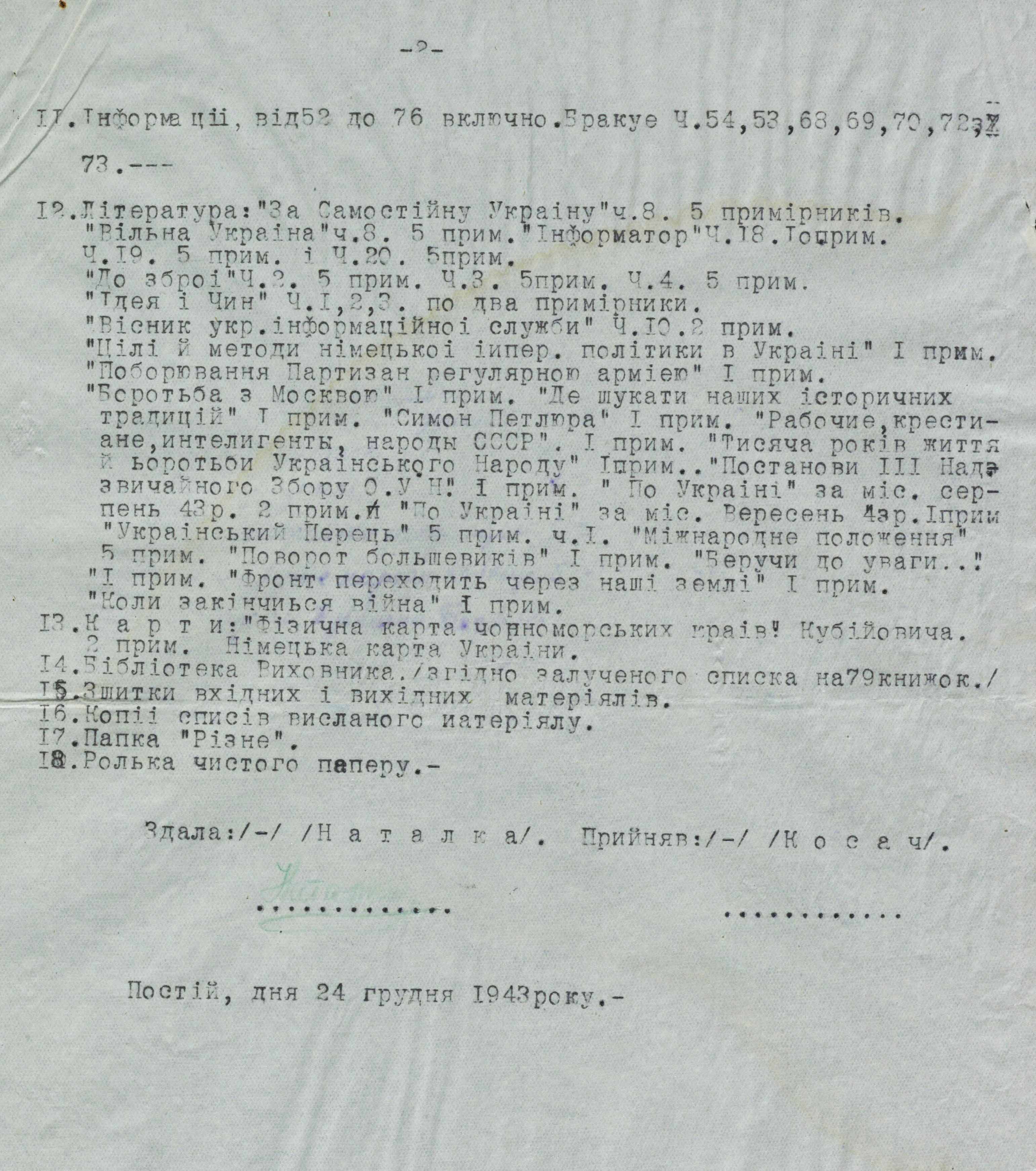 Більшість матеріалів датована другою половиною 1943 року. У них – методичні рекомендації з проведення політико-виховної роботи, інструкції, накази, конспекти, листівки і власноруч зроблені нотатки. Один із перших наказів зобов’язує політвиховників УПА сконтактуватися з політичними референтами ОУН на тих теренах, де перебуває військо, і спільно вести роботу. Тобто обговорювати назрілі питання, проводити різні заходи для населення, зокрема до свят, обмінюватися літературою.